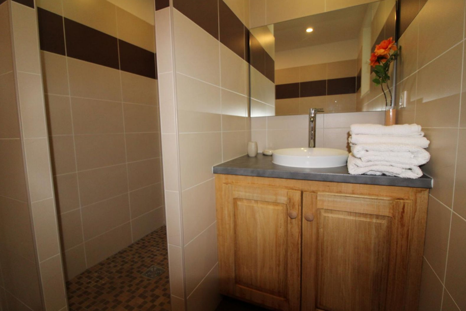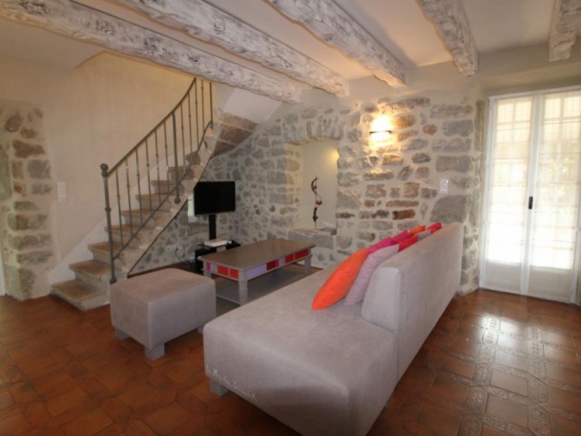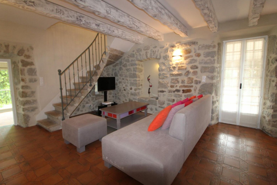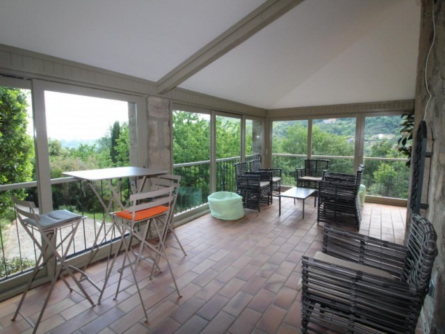 Au bout d'un chemin privé, la maison s'élève traditionnellement sur des voûtes, actuellement à usage de garage, cave à vin, atelier et abri-bois. Par quelques marches à l'entrée, une terrasse couverte et fermée de 35 m2 par des baies, fait le tour de la maison au sud et à l'ouest. La maison s'ouvre sur un grand salon de 46,42 m2 agrémenté d'une cheminée ouverte. Un dégagement mène à une chambre de 21,23 m2 avec une double penderie murale, ainsi qu'une salle d'eau de 4,27 m2 avec douche à l'italienne et un W.C. séparé. Au même niveau, se situe la cuisine dinatoire intégrée de 16,26 m2 avec une porte-fenêtre pour une sortie de plain-pied et en annexe une buanderie-cellier avec placards.