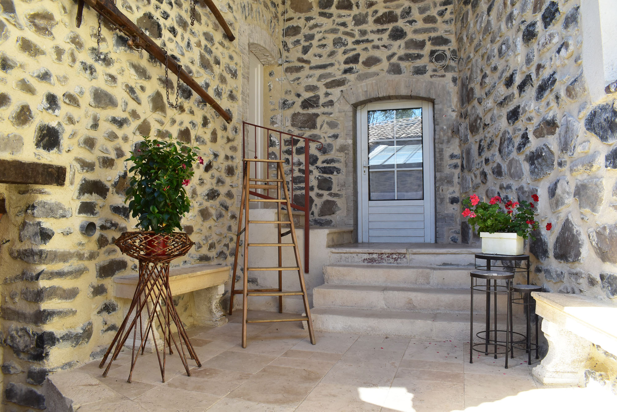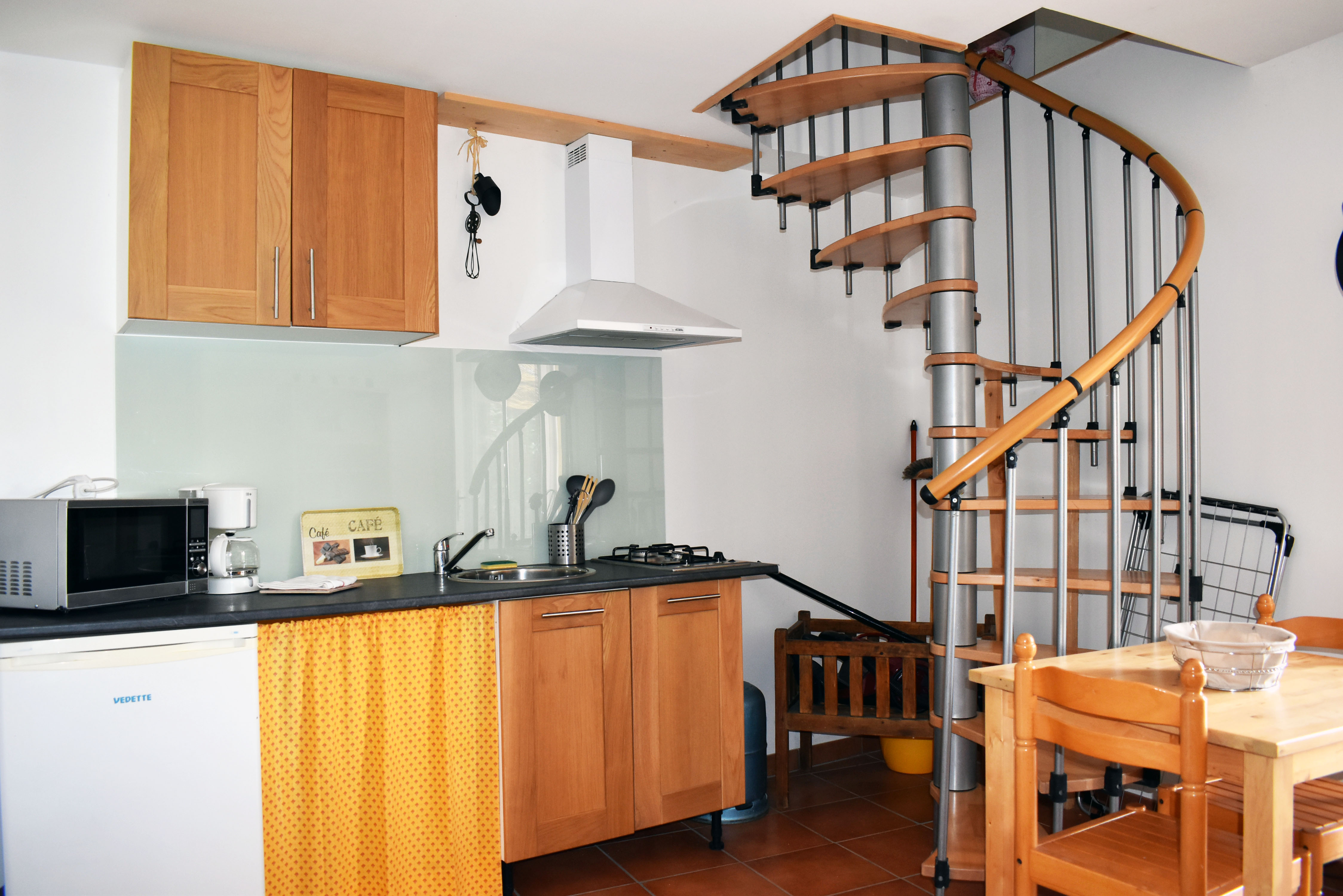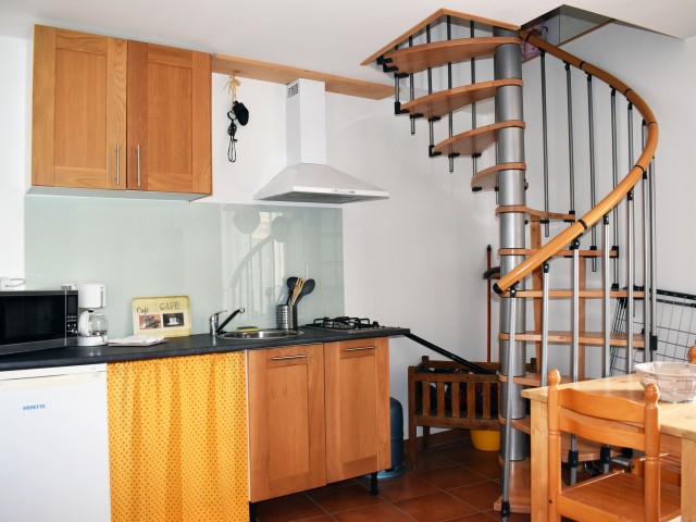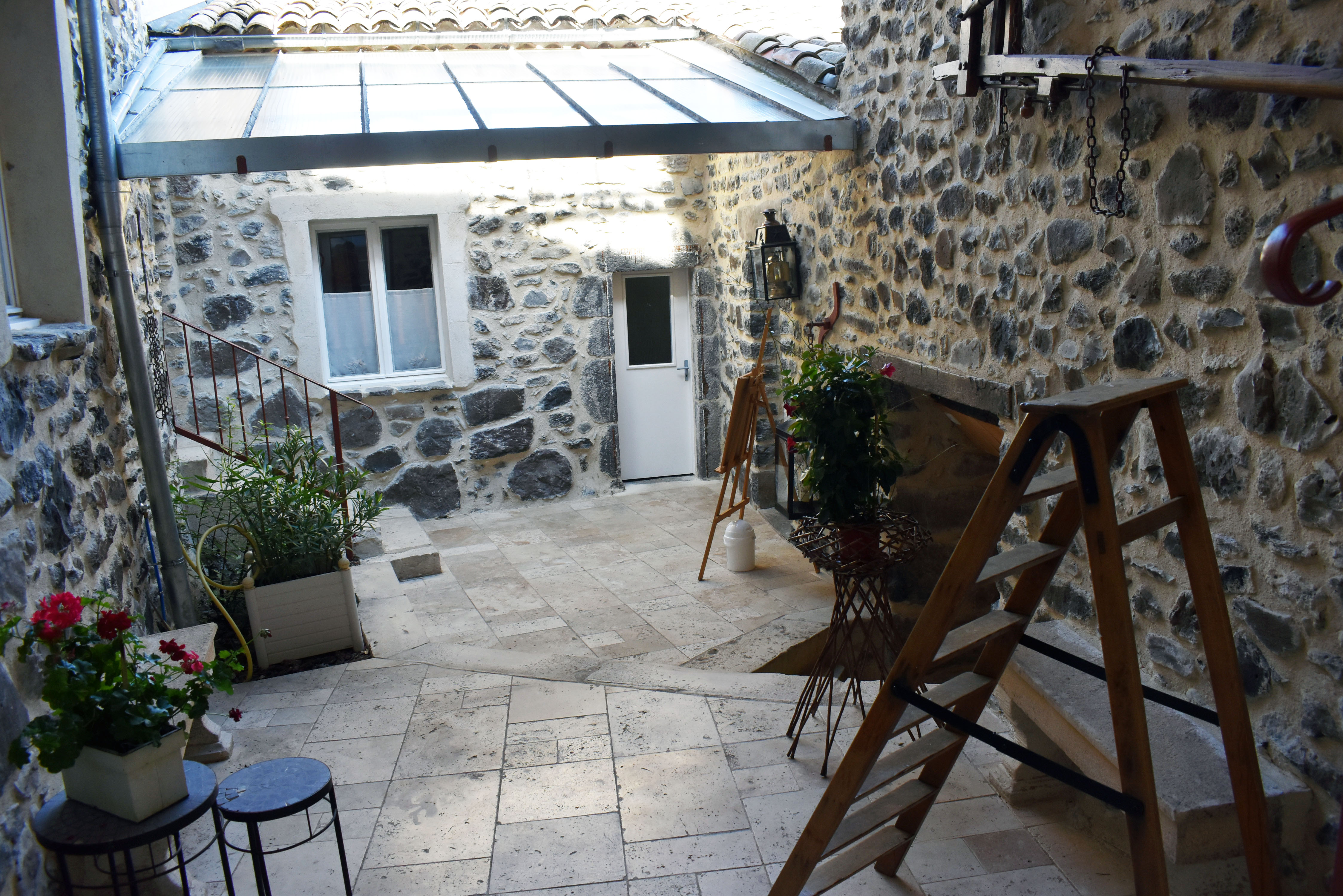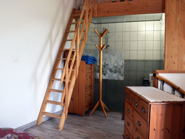 De retour dans le patio, nous passons un passage voûté vers un espace buanderie-lingerie de 21 m2 avec des placards muraux. Du même côté, un cinquième logement en duplex (avec chauffage central), accessible par une petite terrasse, comprend un séjour de 12,80 m2 avec un coin cuisine et un escalier en colimaçon vers une chambre de 14,76 m2 incluant une douche, un lavabo et un W.C. ainsi qu'une petite mezzanine avec un lit simple. De cette chambre nous pouvons retourner dans le patio. Nous avons ainsi fait le tour de ce qui était l'ancienne ferme.