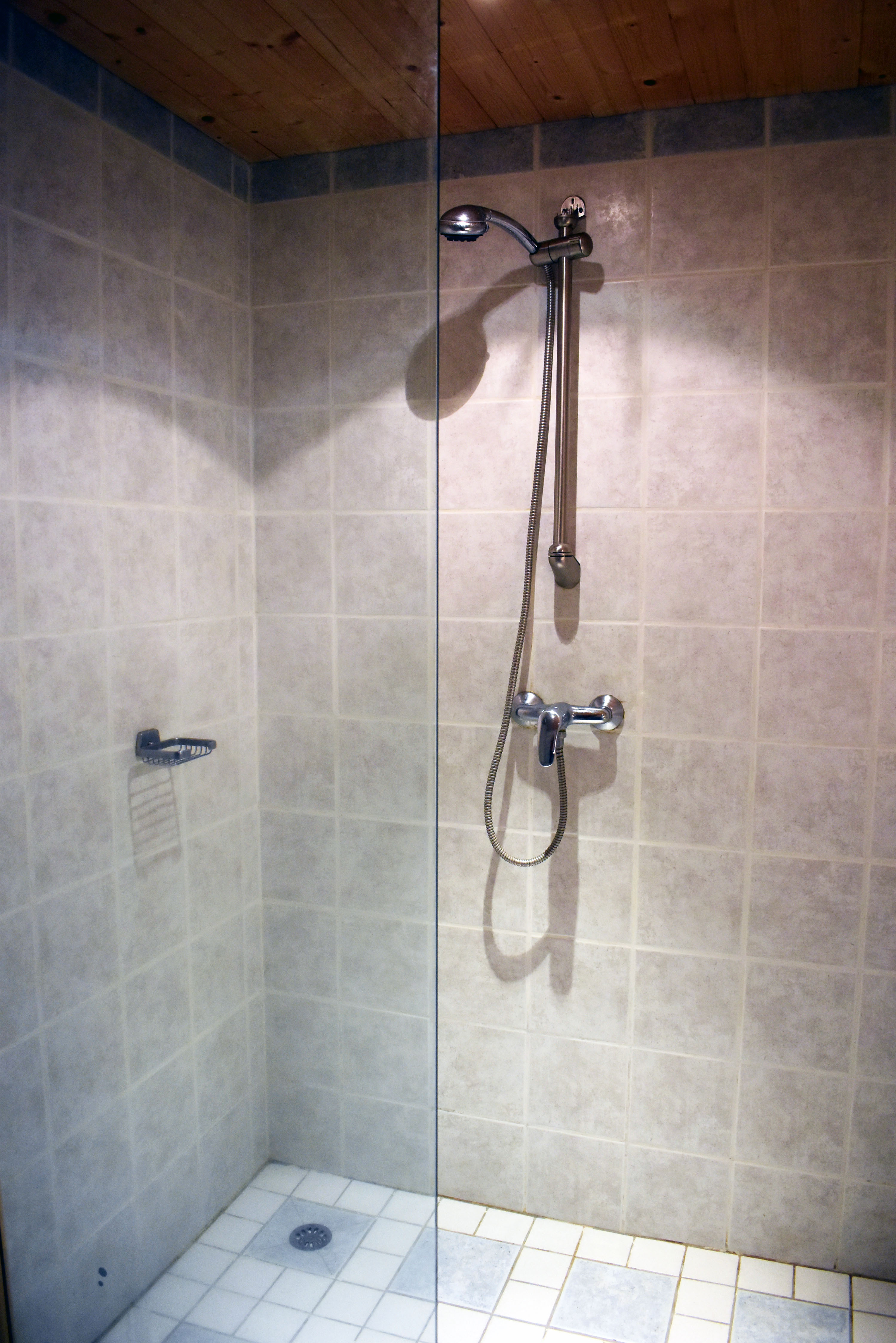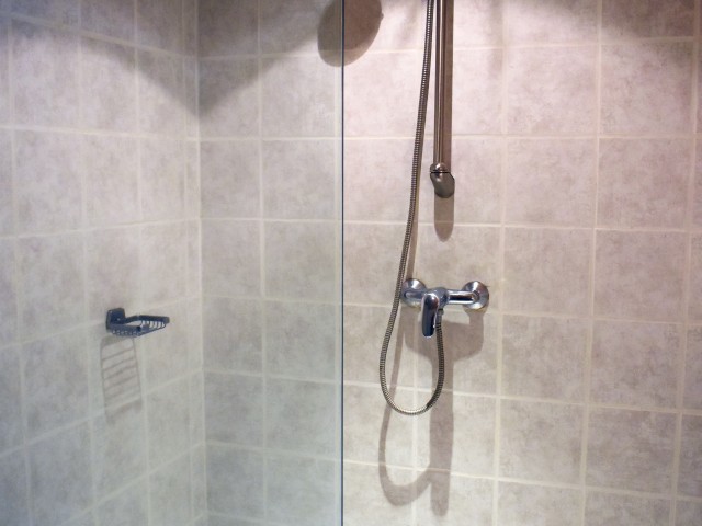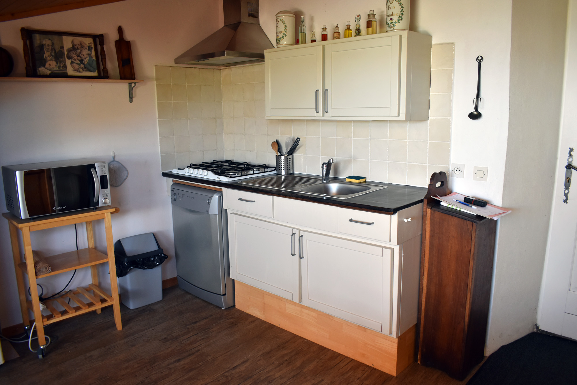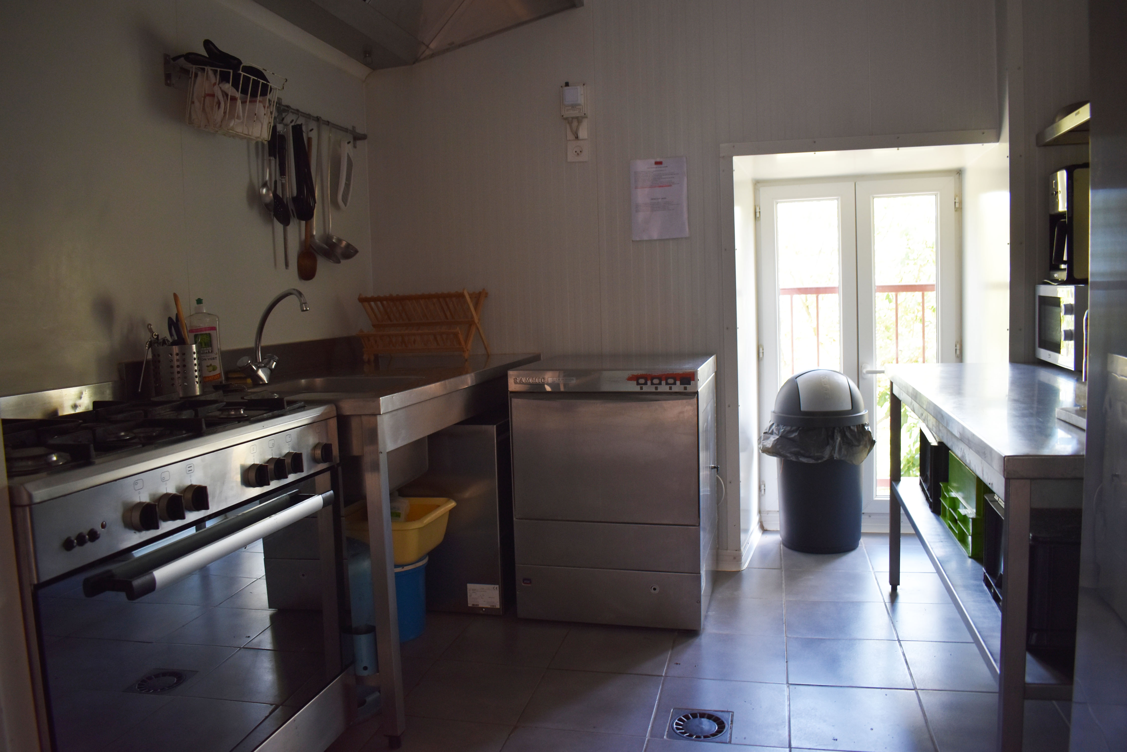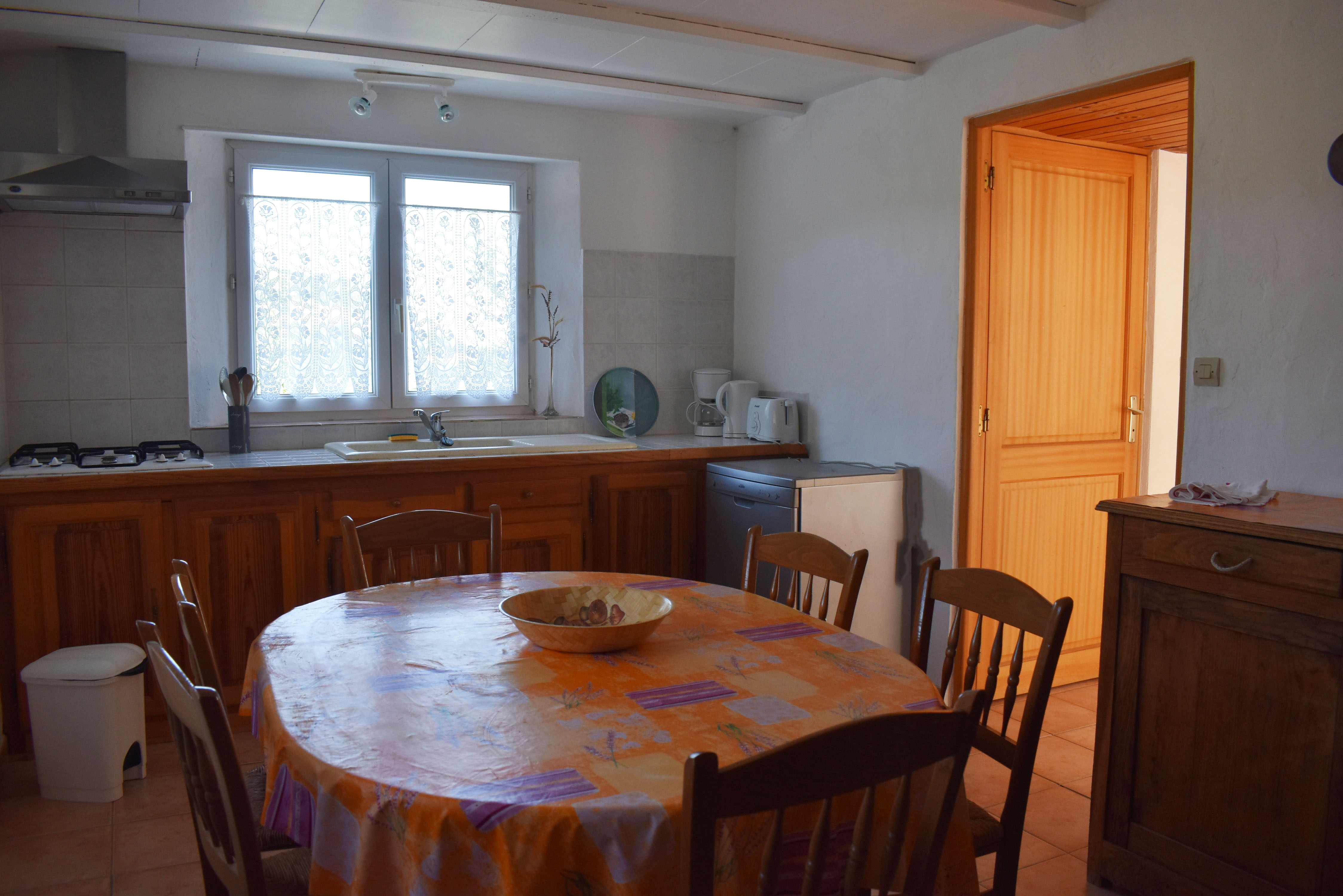 De retour dans le patio, nous passons un passage voûté vers un espace buanderie-lingerie de 21 m2 avec des placards muraux. Du même côté, un cinquième logement en duplex (avec chauffage central), accessible par une petite terrasse, comprend un séjour de 12,80 m2 avec un coin cuisine et un escalier en colimaçon vers une chambre de 14,76 m2 incluant une douche, un lavabo et un W.C. ainsi qu'une petite mezzanine avec un lit simple. De cette chambre nous pouvons retourner dans le patio. Nous avons ainsi fait le tour de ce qui était l'ancienne ferme.
