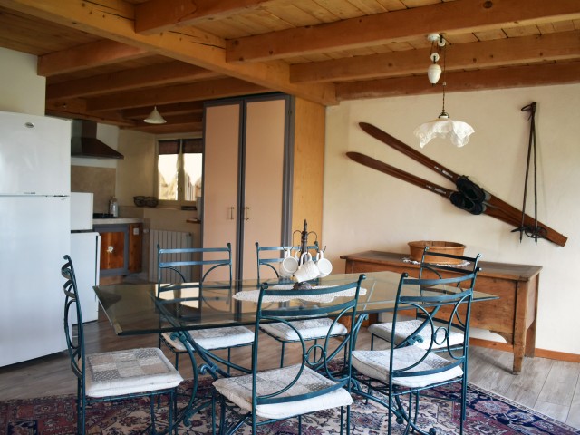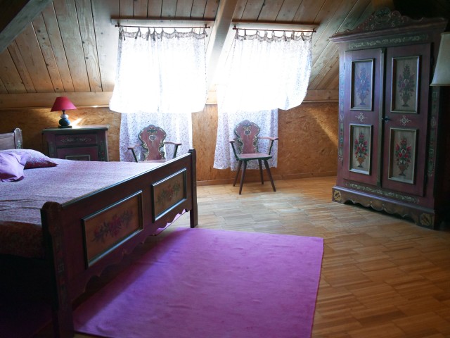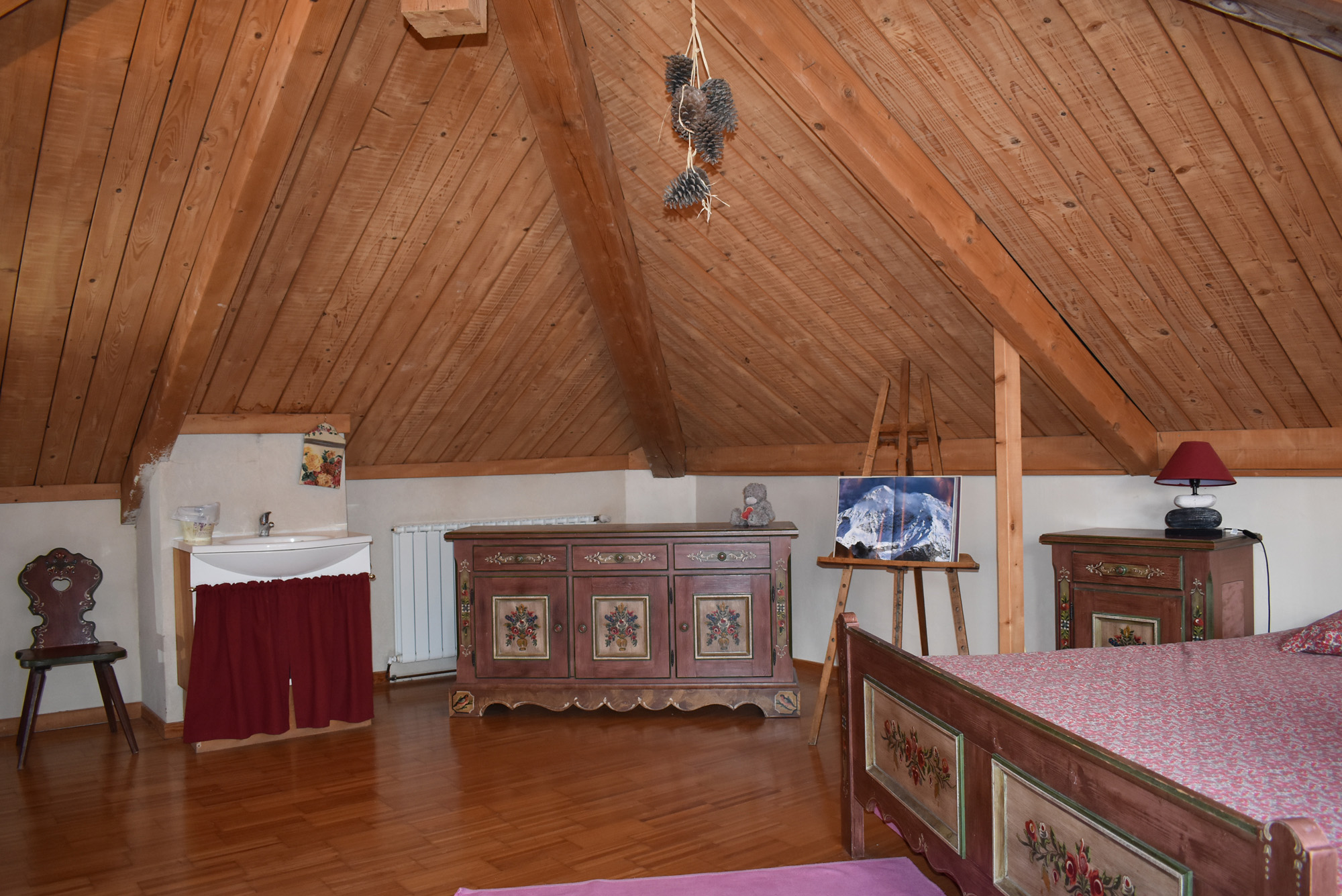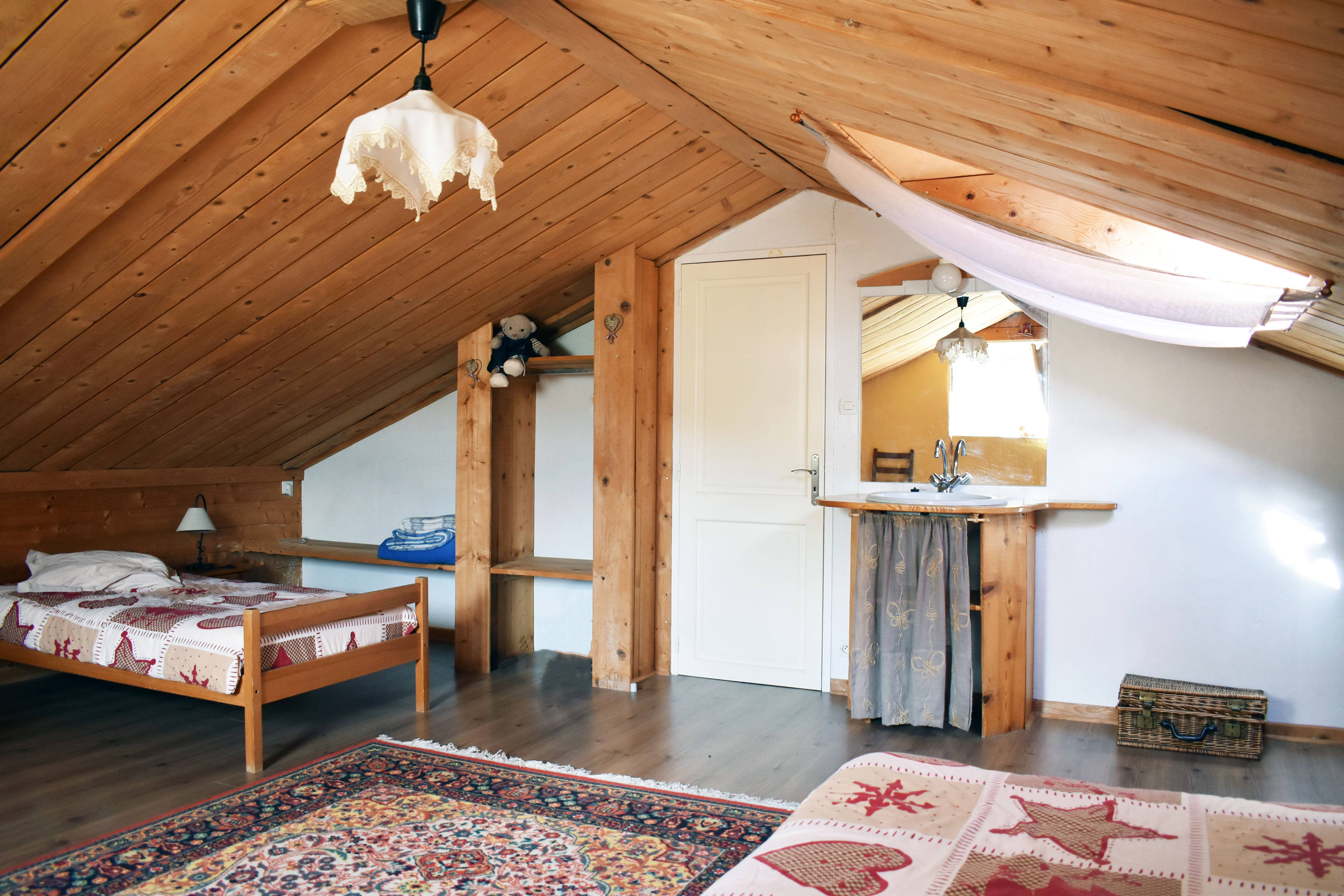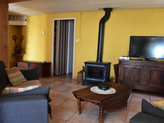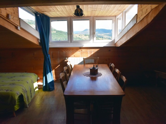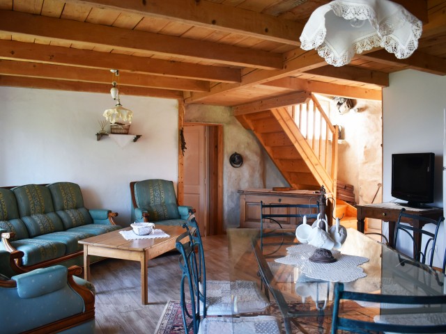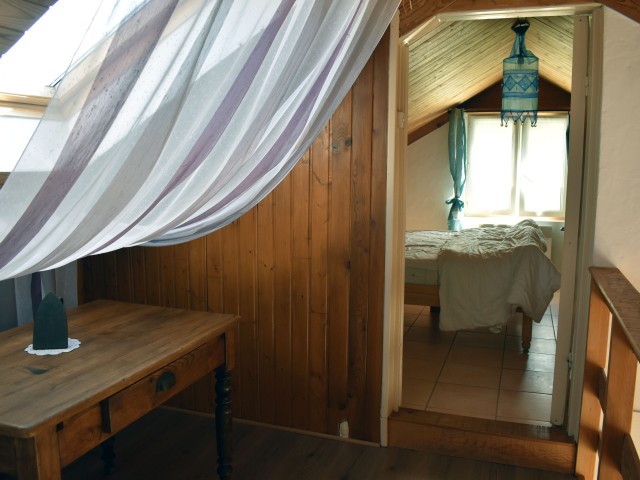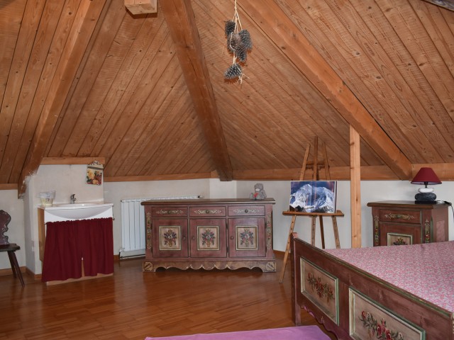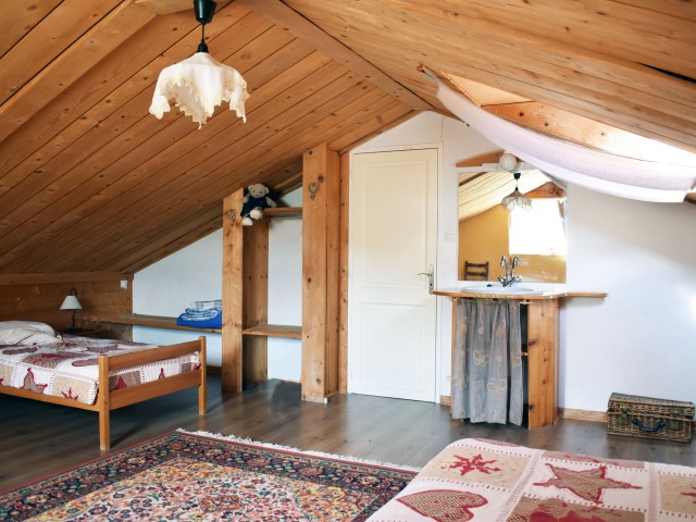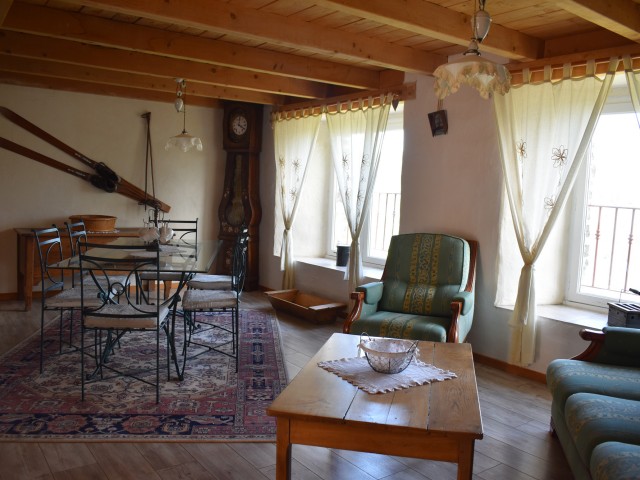 De la salle de réception, un escalier rejoint au premier niveau un troisième logement de 86 m2 (avec chauffage central) et une pièce privée de rangement (convertible en salle d'activité ou chambres). Il se compose en duplex de 2 chambres de 11,50 m2 et 12 m2, la dernière avec un lavabo et d'une salle d'eau de 4,40 m2 et d'un W.C. séparé et au rez-de-chaussée supérieur, d'un séjour avec coin-cuisine de 27,60 m2 avec une sortie vers une terrasse. Une petite pièce au rez-de-chaussée inférieur permet de communiquer (si nécessaire) avec le quatrième logement de 102 m2 (avec chauffage central), vers le hall d'entrée de celui-ci qui s'ouvre sur un dégagement distribuant une salle de bains (baignoire) de 6 m2 et un W.C. séparé avec lave-mains et plus loin une grande pièce de vie de 32,50 m2 avec la vue sur les montagnes, équipée d'un coin cuisine. Au même niveau se situe une chambre de 19 m2 avec un lavabo. A ce niveau une porte permet de rejoindre une terrasse et une petite tour ronde qui accueille une chambre supplémentaire. A l'étage, par un escalier en bois, nous accédons à une très belle chambre de 37 m2 avec la charpente arpente.