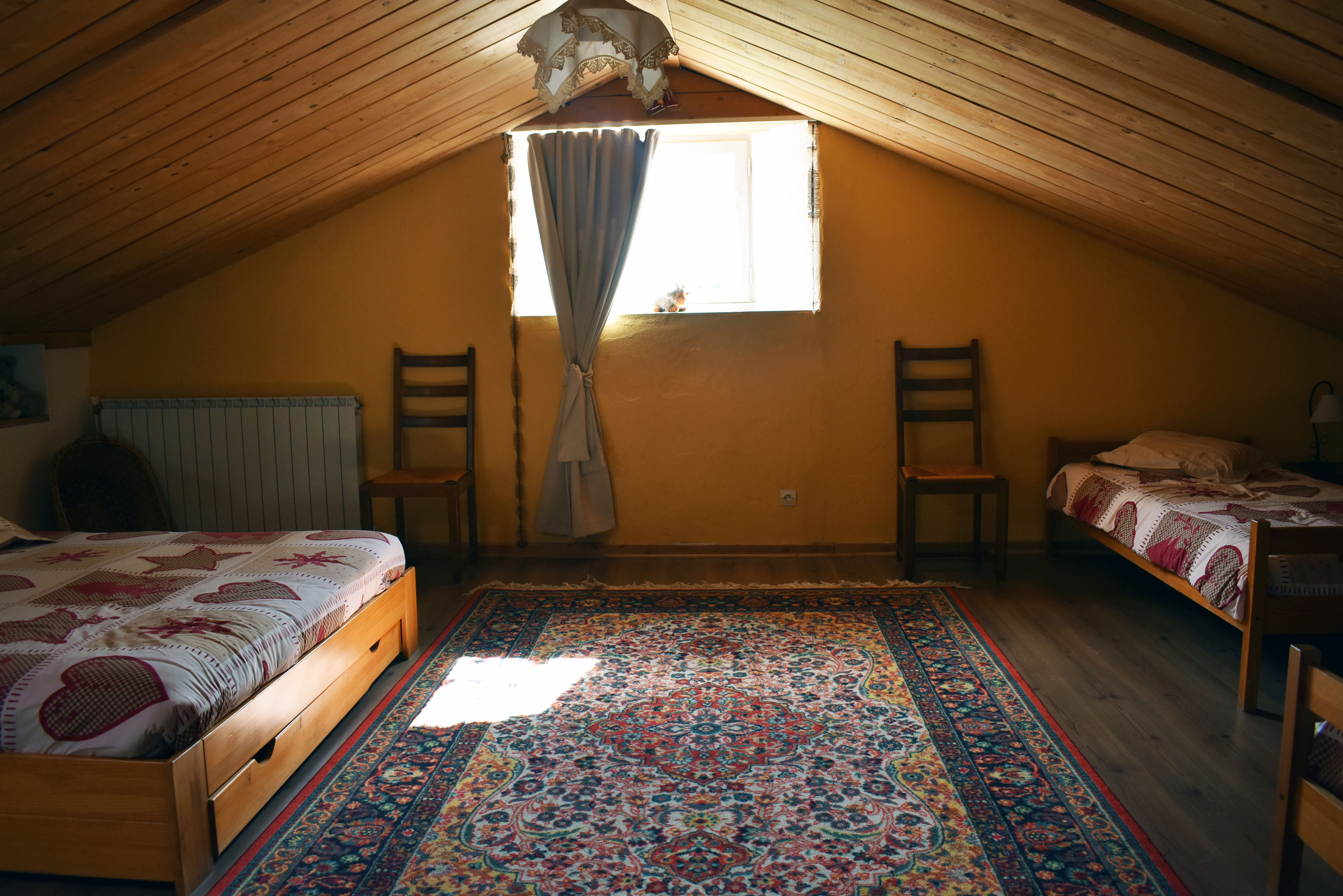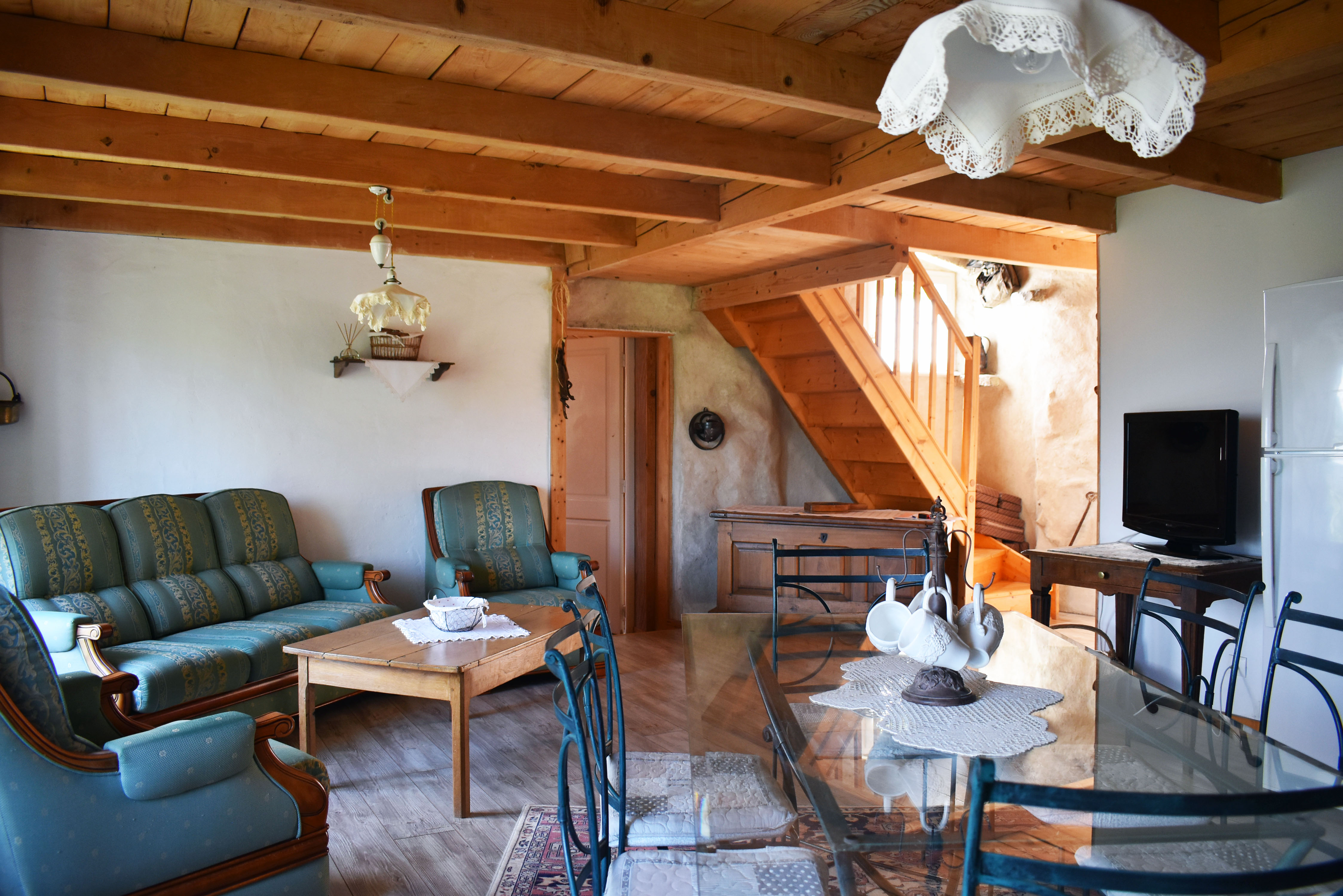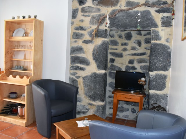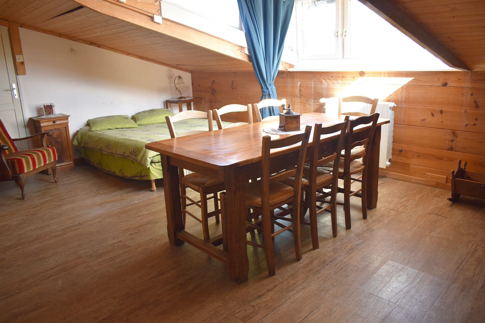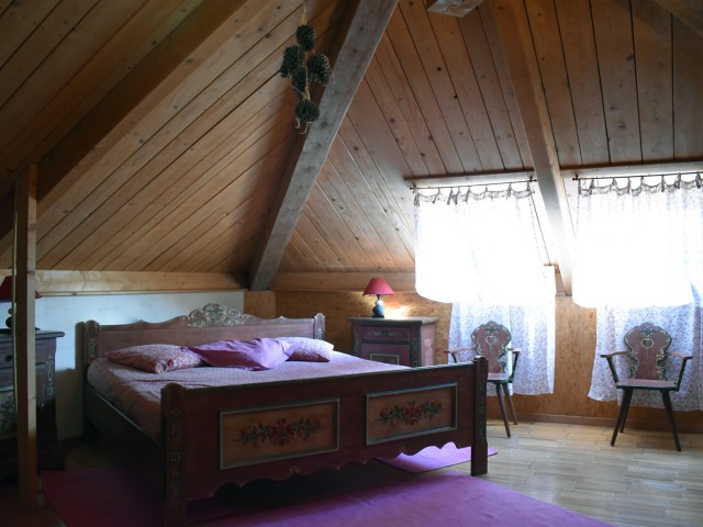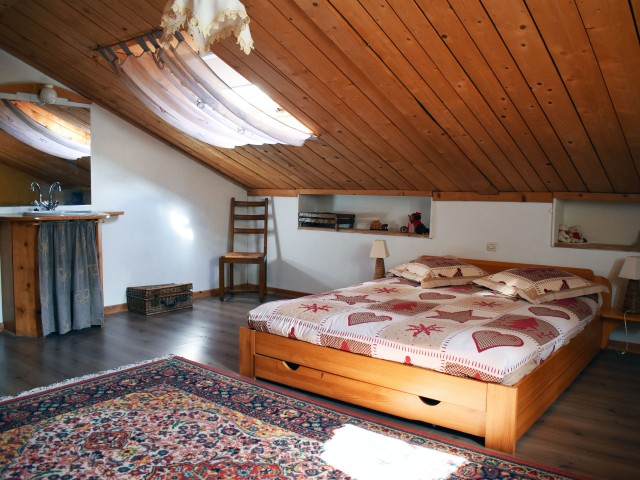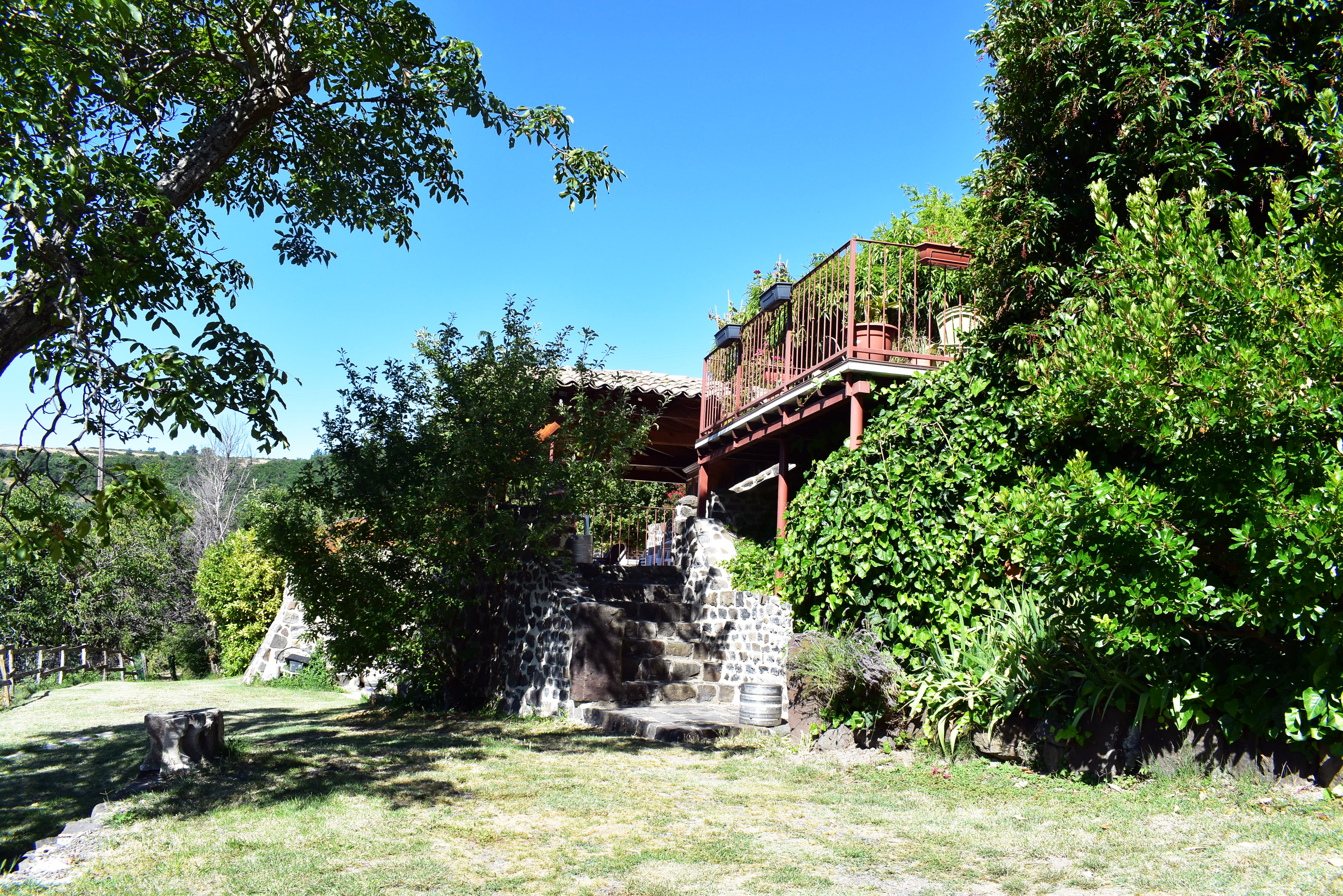De la salle de réception, un escalier rejoint au premier niveau un troisième logement de 86 m2 (avec chauffage central) et une pièce privée de rangement (convertible en salle d'activité ou chambres). Il se compose en duplex de 2 chambres de 11,50 m2 et 12 m2, la dernière avec un lavabo et d'une salle d'eau de 4,40 m2 et d'un W.C. séparé et au rez-de-chaussée supérieur, d'un séjour avec coin-cuisine de 27,60 m2 avec une sortie vers une terrasse. Une petite pièce au rez-de-chaussée inférieur permet de communiquer (si nécessaire) avec le quatrième logement de 102 m2 (avec chauffage central), vers le hall d'entrée de celui-ci qui s'ouvre sur un dégagement distribuant une salle de bains (baignoire) de 6 m2 et un W.C. séparé avec lave-mains et plus loin une grande pièce de vie de 32,50 m2 avec la vue sur les montagnes, équipée d'un coin cuisine. Au même niveau se situe une chambre de 19 m2 avec un lavabo. A ce niveau une porte permet de rejoindre une terrasse et une petite tour ronde qui accueille une chambre supplémentaire. A l'étage, par un escalier en bois, nous accédons à une très belle chambre de 37 m2 avec la charpente arpente.