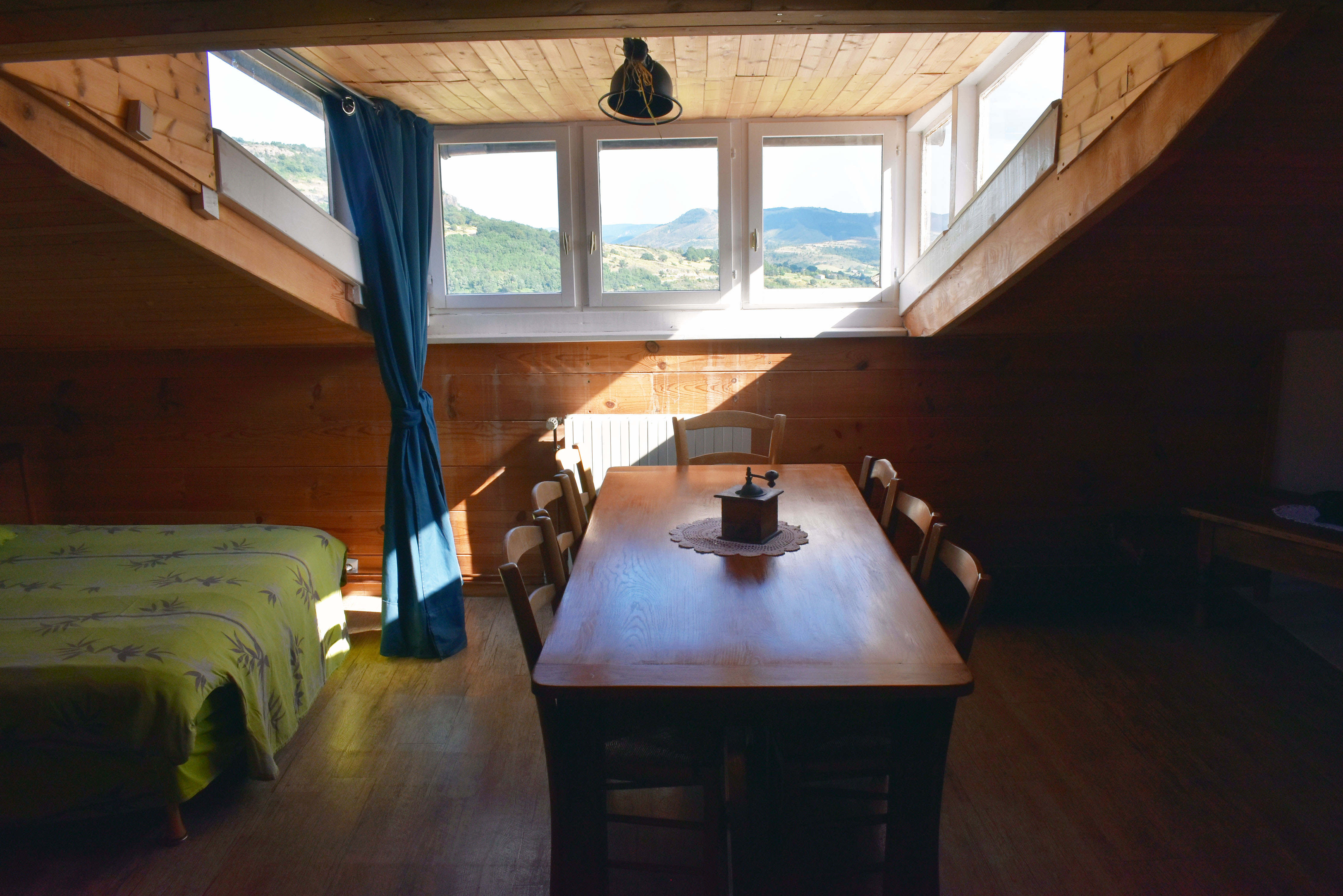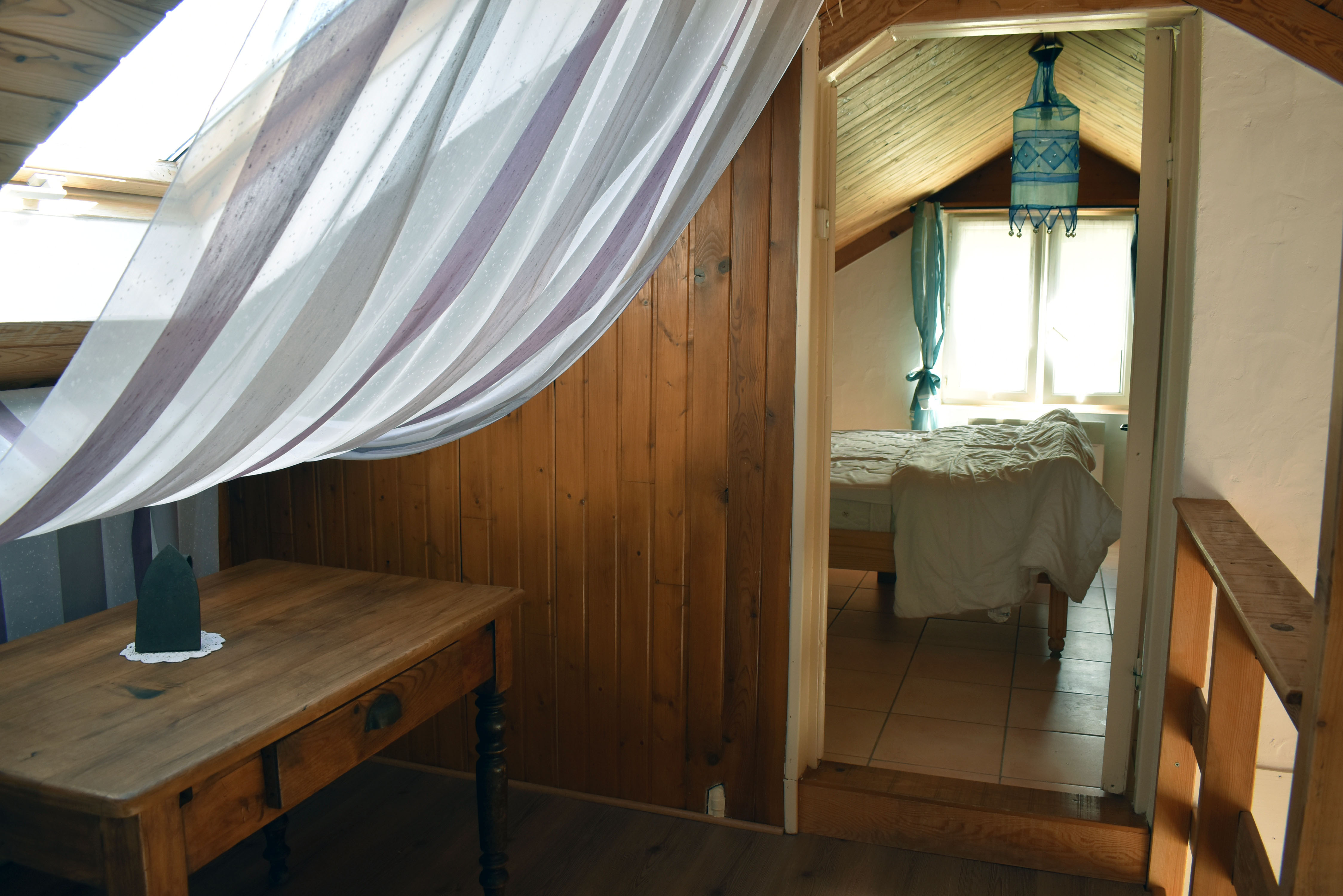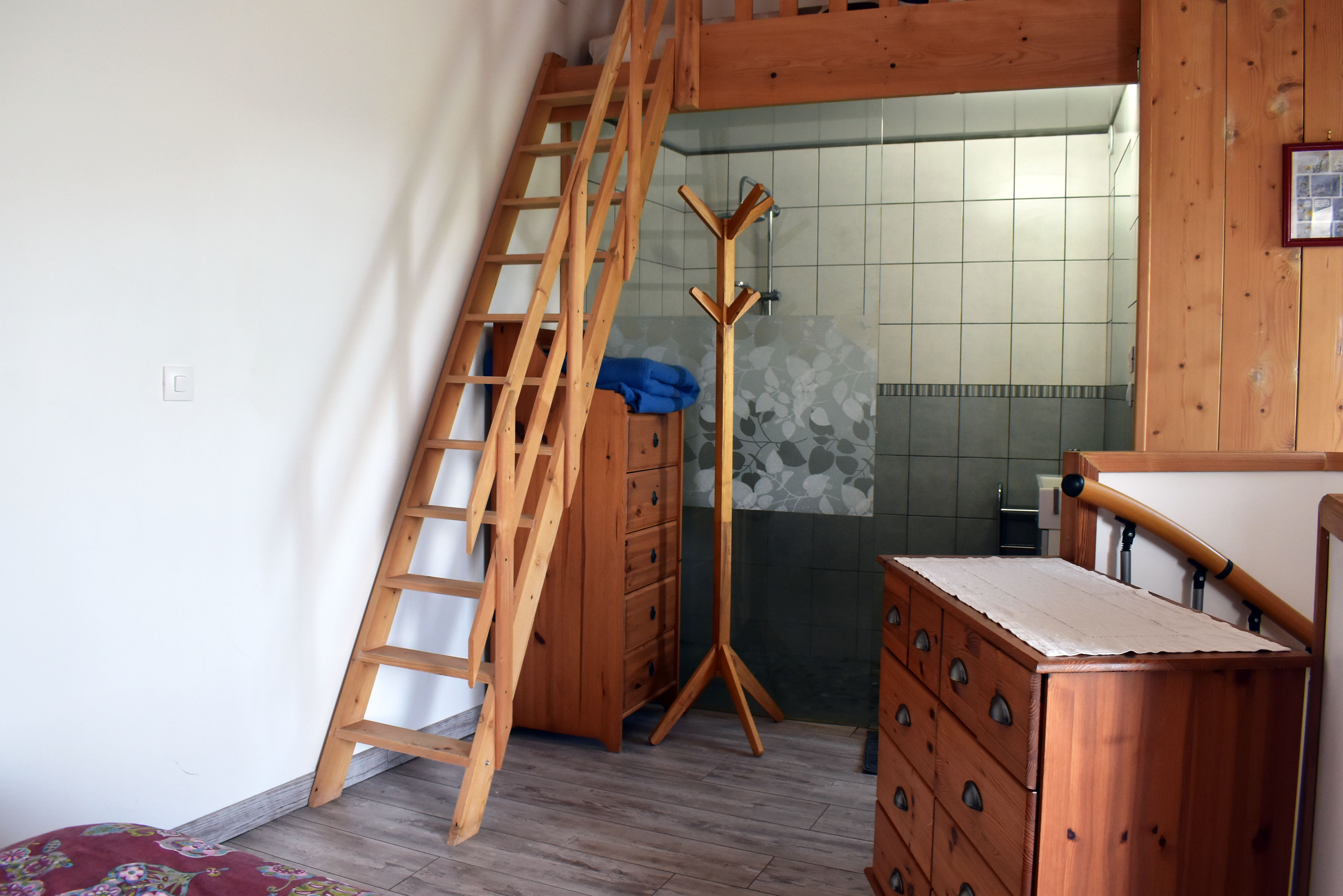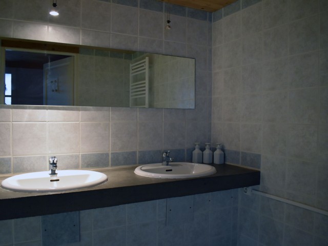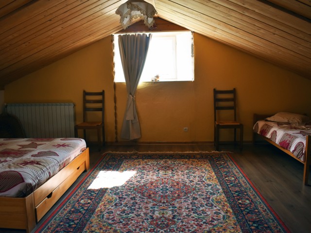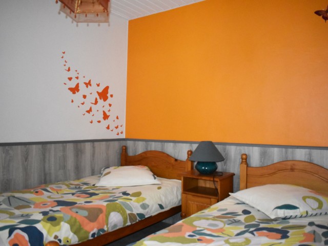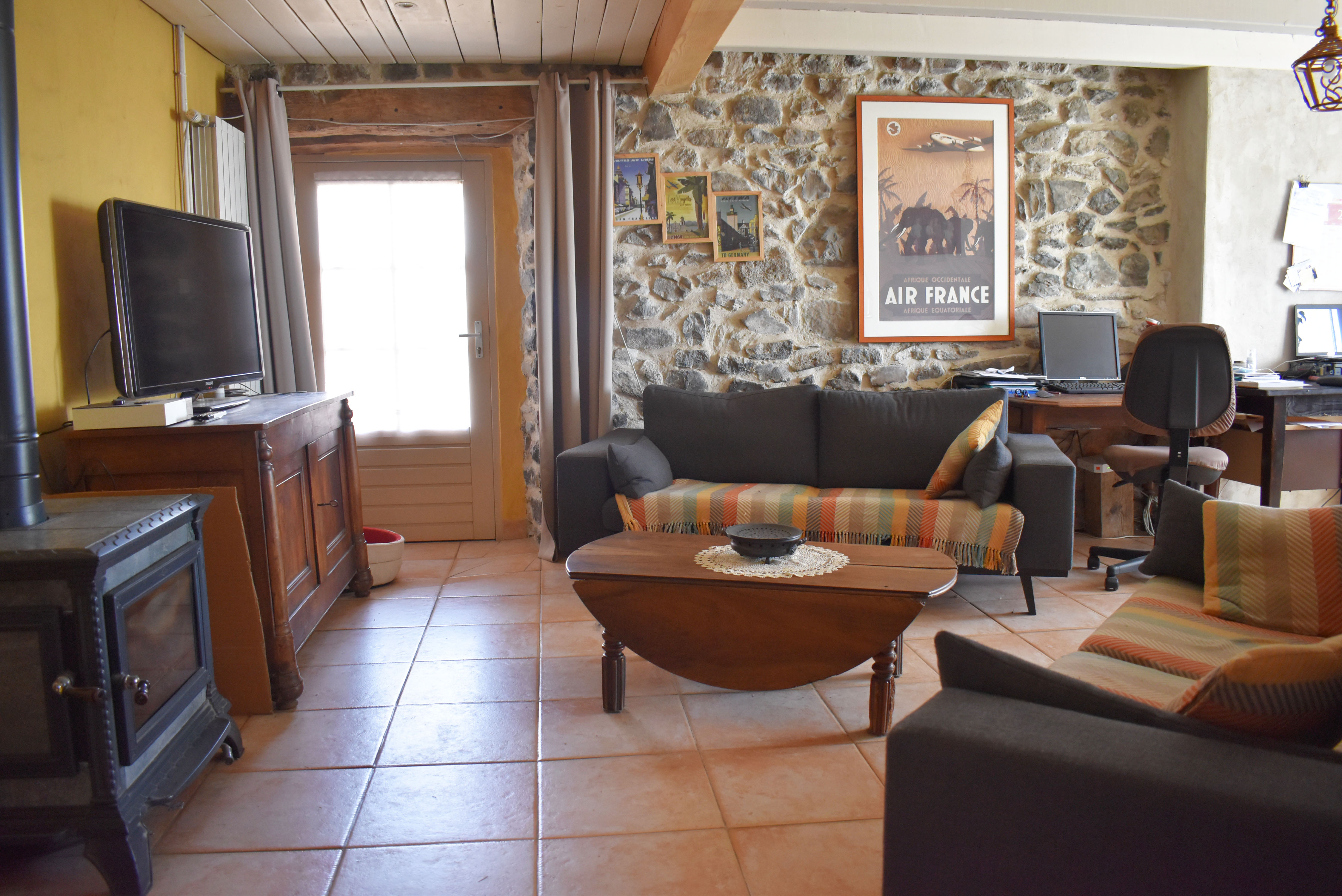 De la salle de réception, un escalier rejoint au premier niveau un troisième logement de 86 m2 (avec chauffage central) et une pièce privée de rangement (convertible en salle d'activité ou chambres). Il se compose en duplex de 2 chambres de 11,50 m2 et 12 m2, la dernière avec un lavabo et d'une salle d'eau de 4,40 m2 et d'un W.C. séparé et au rez-de-chaussée supérieur, d'un séjour avec coin-cuisine de 27,60 m2 avec une sortie vers une terrasse. Une petite pièce au rez-de-chaussée inférieur permet de communiquer (si nécessaire) avec le quatrième logement de 102 m2 (avec chauffage central), vers le hall d'entrée de celui-ci qui s'ouvre sur un dégagement distribuant une salle de bains (baignoire) de 6 m2 et un W.C. séparé avec lave-mains et plus loin une grande pièce de vie de 32,50 m2 avec la vue sur les montagnes, équipée d'un coin cuisine. Au même niveau se situe une chambre de 19 m2 avec un lavabo. A ce niveau une porte permet de rejoindre une terrasse et une petite tour ronde qui accueille une chambre supplémentaire. A l'étage, par un escalier en bois, nous accédons à une très belle chambre de 37 m2 avec la charpente arpente.