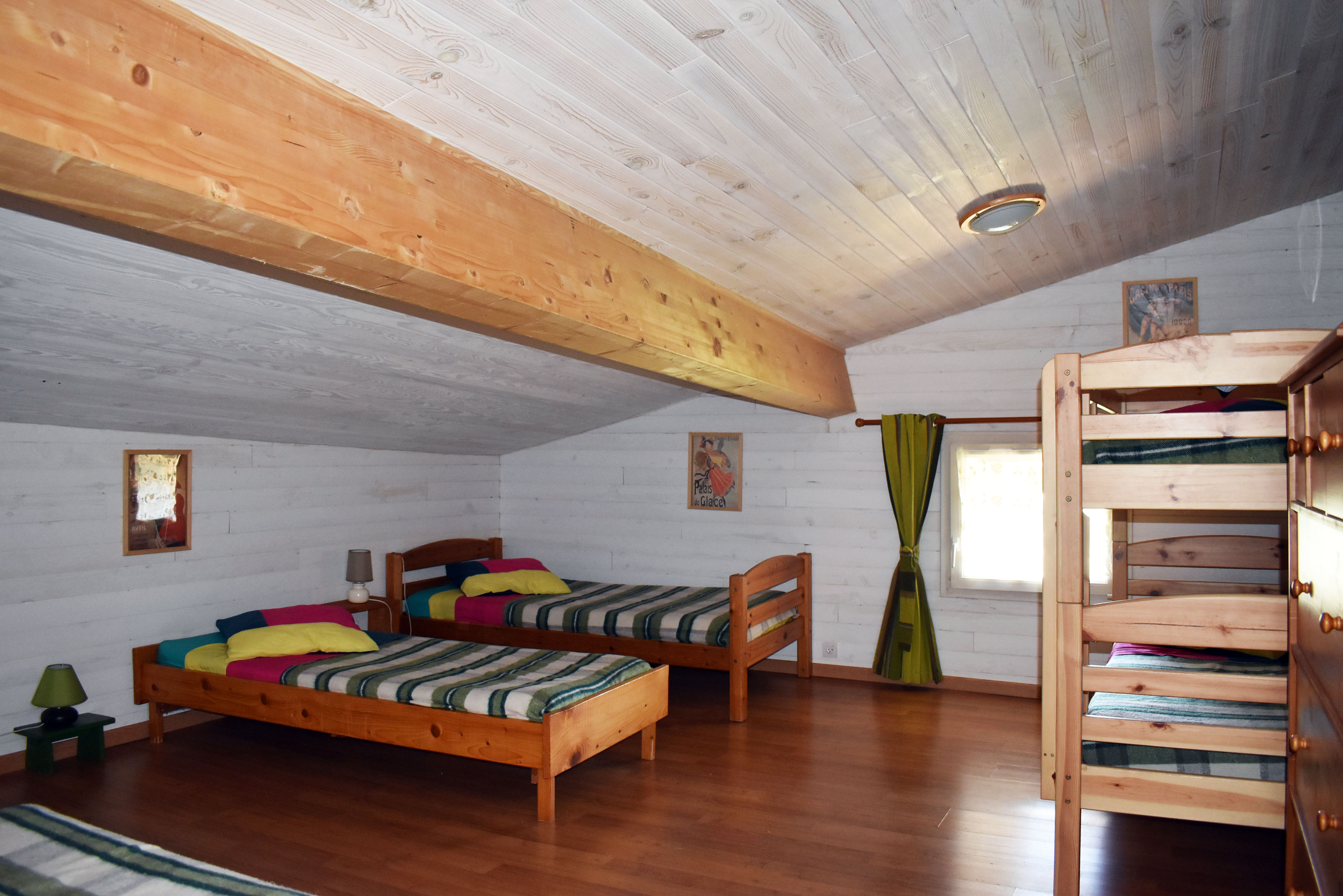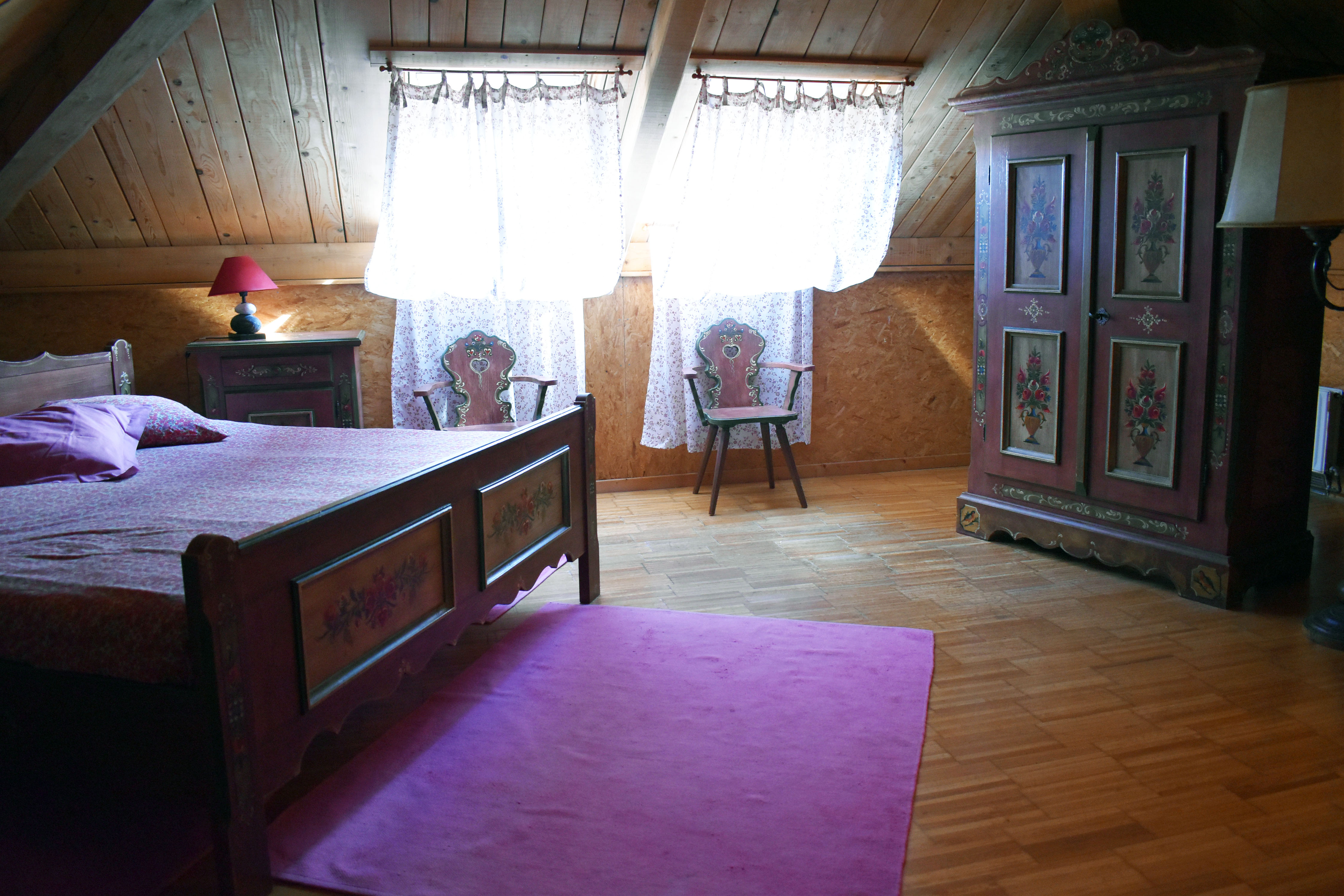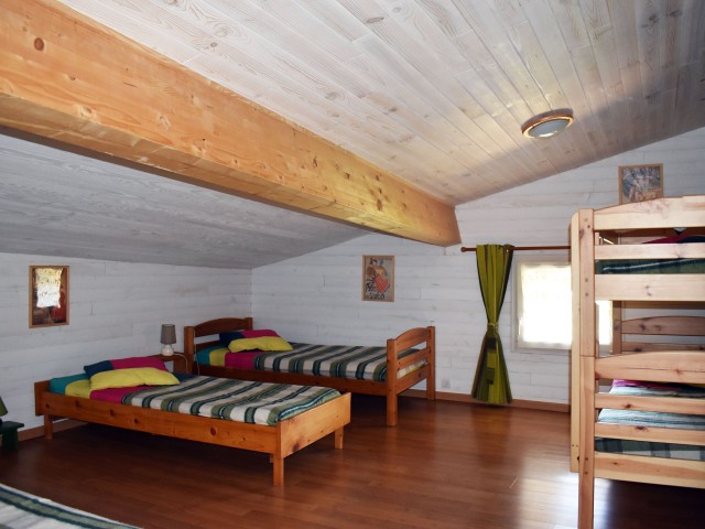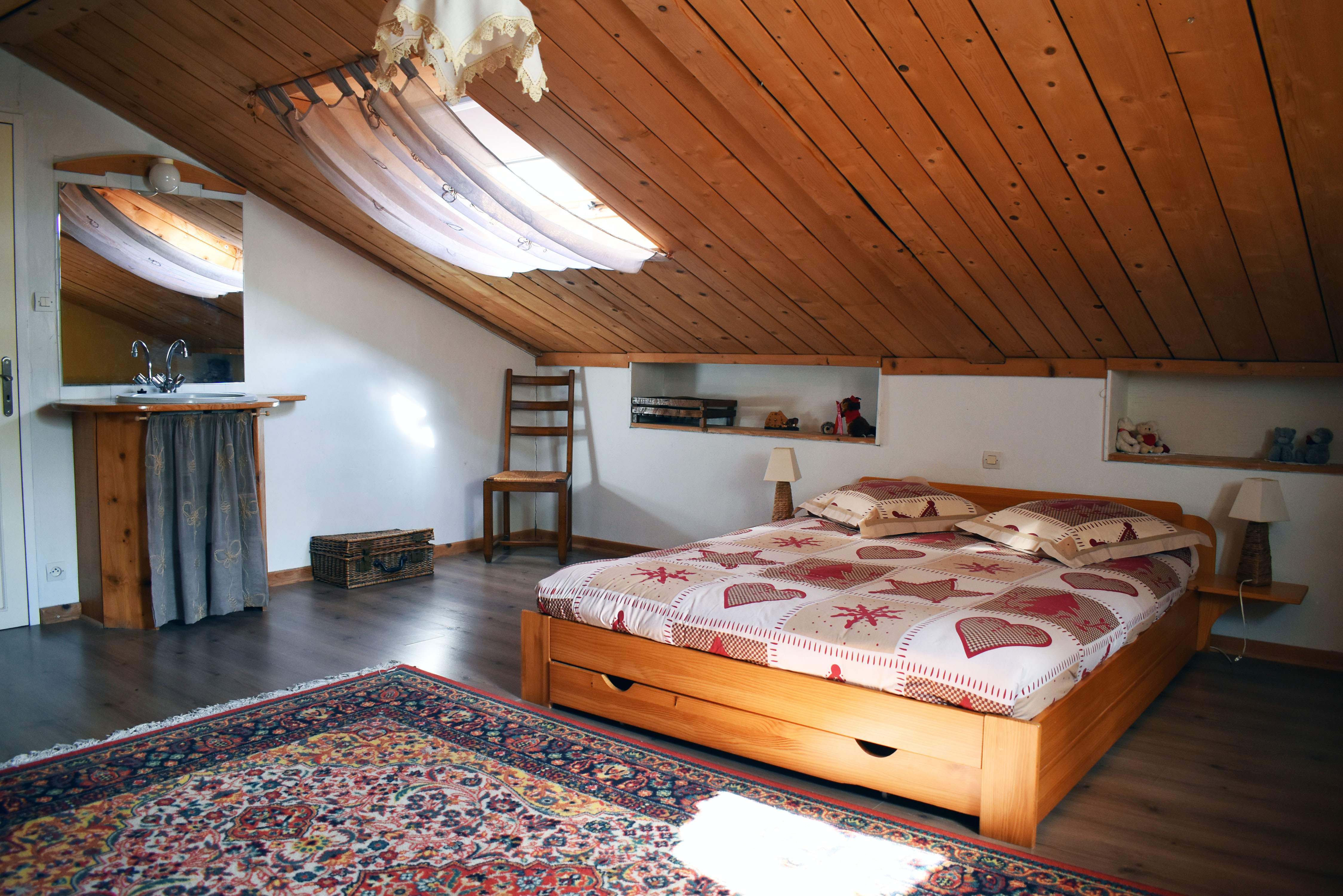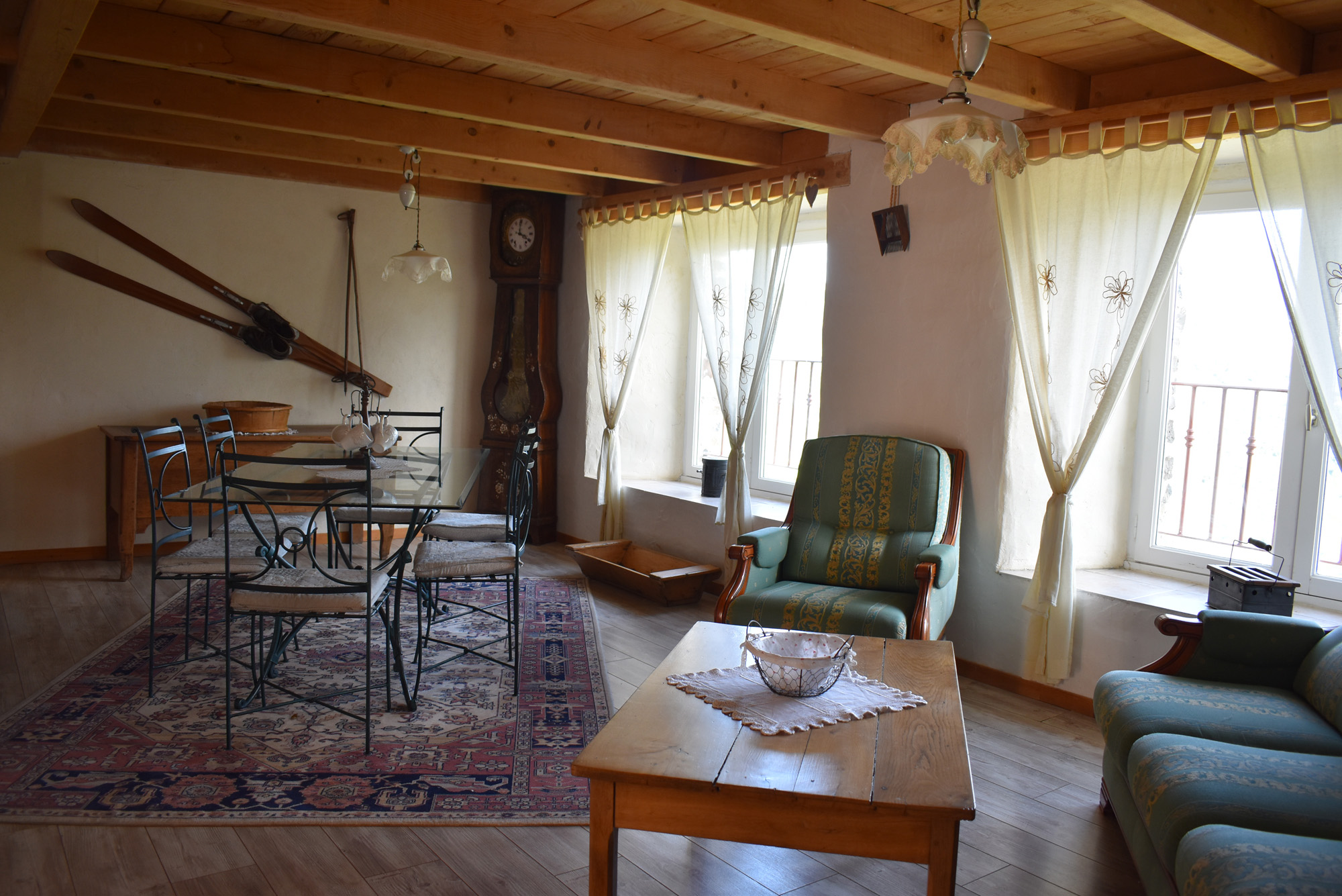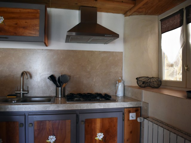 De la salle de réception, un escalier rejoint au premier niveau un troisième logement de 86 m2 (avec chauffage central) et une pièce privée de rangement (convertible en salle d'activité ou chambres). Il se compose en duplex de 2 chambres de 11,50 m2 et 12 m2, la dernière avec un lavabo et d'une salle d'eau de 4,40 m2 et d'un W.C. séparé et au rez-de-chaussée supérieur, d'un séjour avec coin-cuisine de 27,60 m2 avec une sortie vers une terrasse. Une petite pièce au rez-de-chaussée inférieur permet de communiquer (si nécessaire) avec le quatrième logement de 102 m2 (avec chauffage central), vers le hall d'entrée de celui-ci qui s'ouvre sur un dégagement distribuant une salle de bains (baignoire) de 6 m2 et un W.C. séparé avec lave-mains et plus loin une grande pièce de vie de 32,50 m2 avec la vue sur les montagnes, équipée d'un coin cuisine. Au même niveau se situe une chambre de 19 m2 avec un lavabo. A ce niveau une porte permet de rejoindre une terrasse et une petite tour ronde qui accueille une chambre supplémentaire. A l'étage, par un escalier en bois, nous accédons à une très belle chambre de 37 m2 avec la charpente arpente.