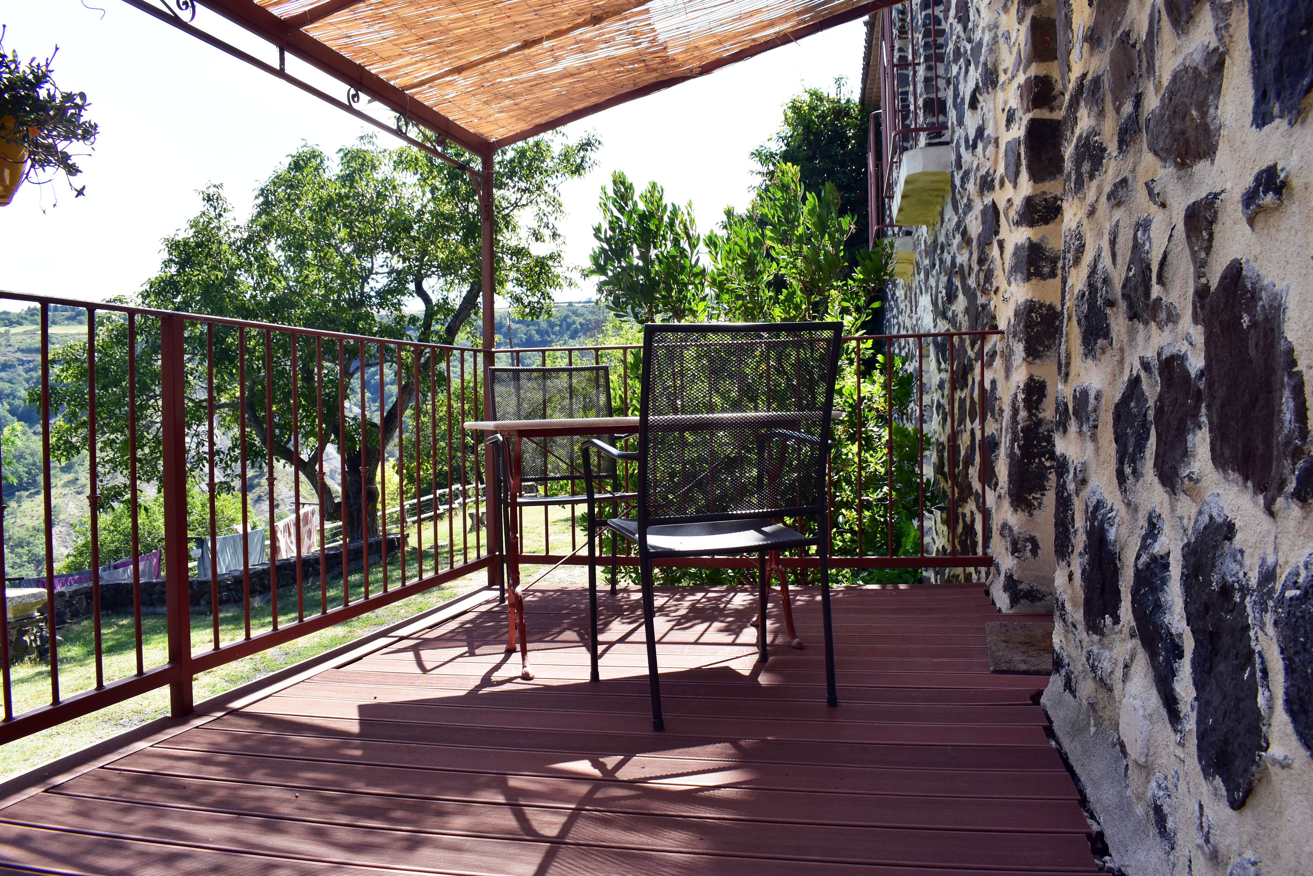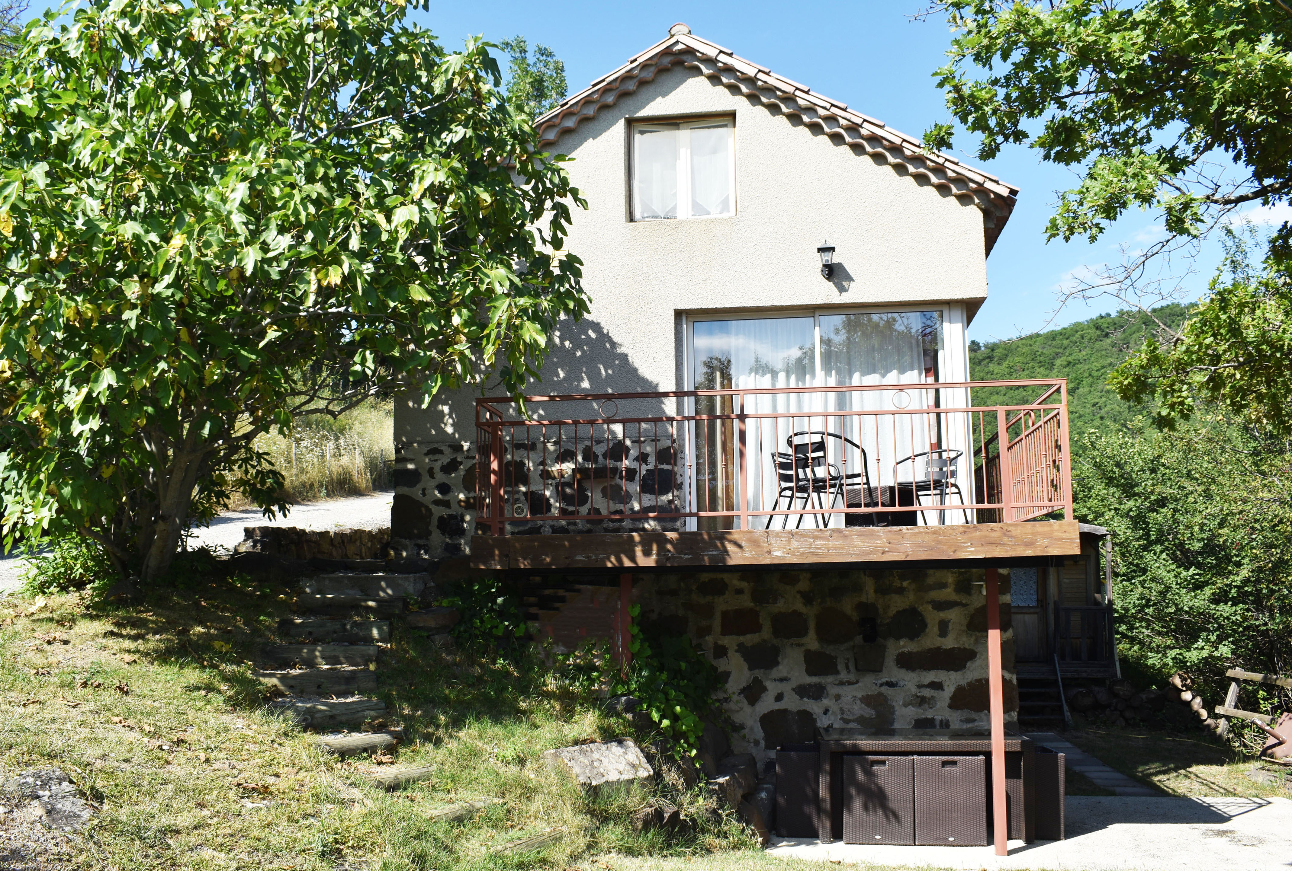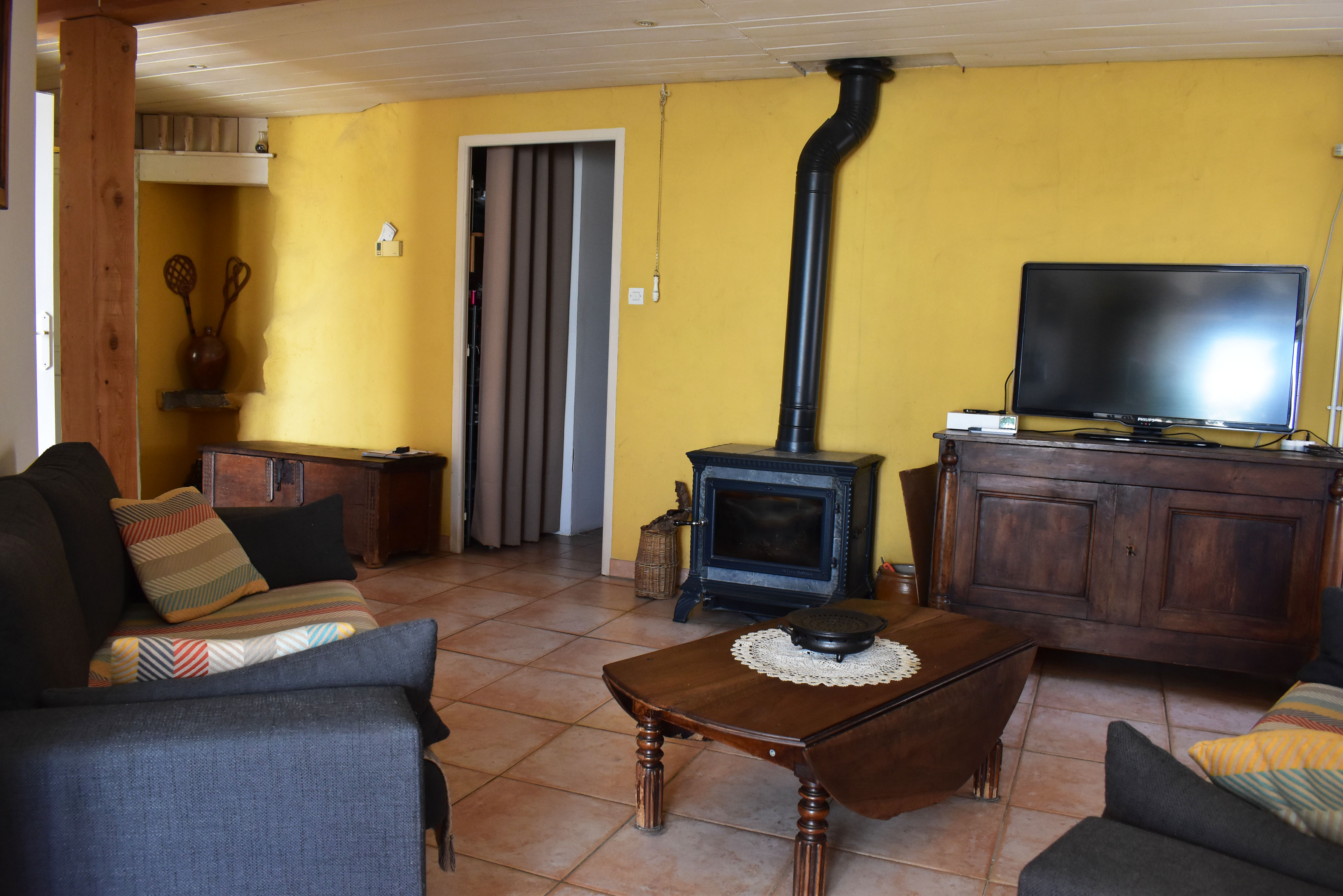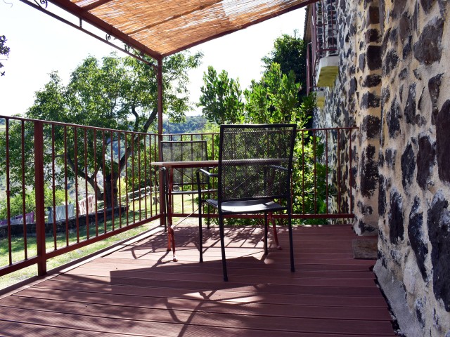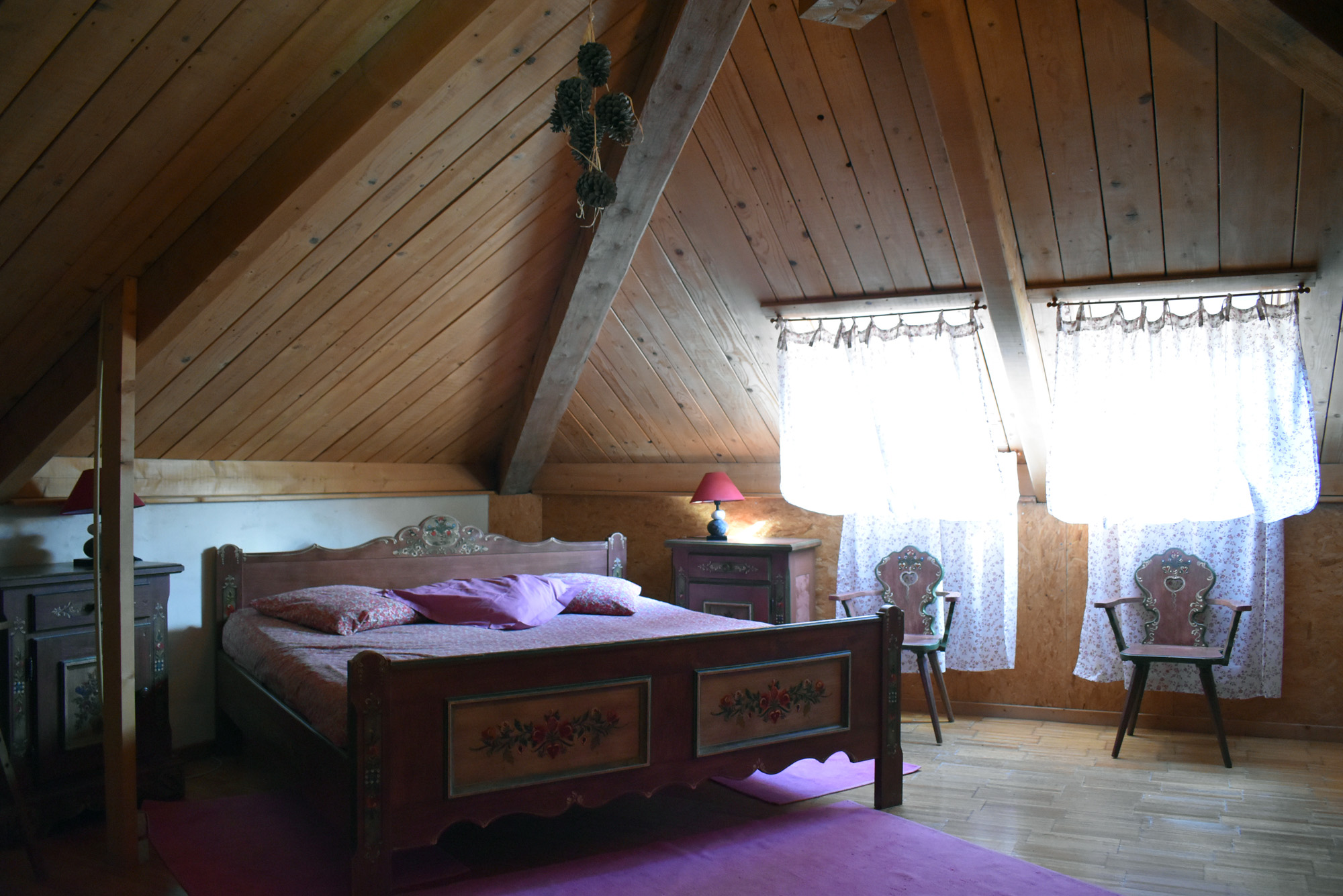 De la salle de réception, un escalier rejoint au premier niveau un troisième logement de 86 m2 (avec chauffage central) et une pièce privée de rangement (convertible en salle d'activité ou chambres). Il se compose en duplex de 2 chambres de 11,50 m2 et 12 m2, la dernière avec un lavabo et d'une salle d'eau de 4,40 m2 et d'un W.C. séparé et au rez-de-chaussée supérieur, d'un séjour avec coin-cuisine de 27,60 m2 avec une sortie vers une terrasse. Une petite pièce au rez-de-chaussée inférieur permet de communiquer (si nécessaire) avec le quatrième logement de 102 m2 (avec chauffage central), vers le hall d'entrée de celui-ci qui s'ouvre sur un dégagement distribuant une salle de bains (baignoire) de 6 m2 et un W.C. séparé avec lave-mains et plus loin une grande pièce de vie de 32,50 m2 avec la vue sur les montagnes, équipée d'un coin cuisine. Au même niveau se situe une chambre de 19 m2 avec un lavabo. A ce niveau une porte permet de rejoindre une terrasse et une petite tour ronde qui accueille une chambre supplémentaire. A l'étage, par un escalier en bois, nous accédons à une très belle chambre de 37 m2 avec la charpente arpente.