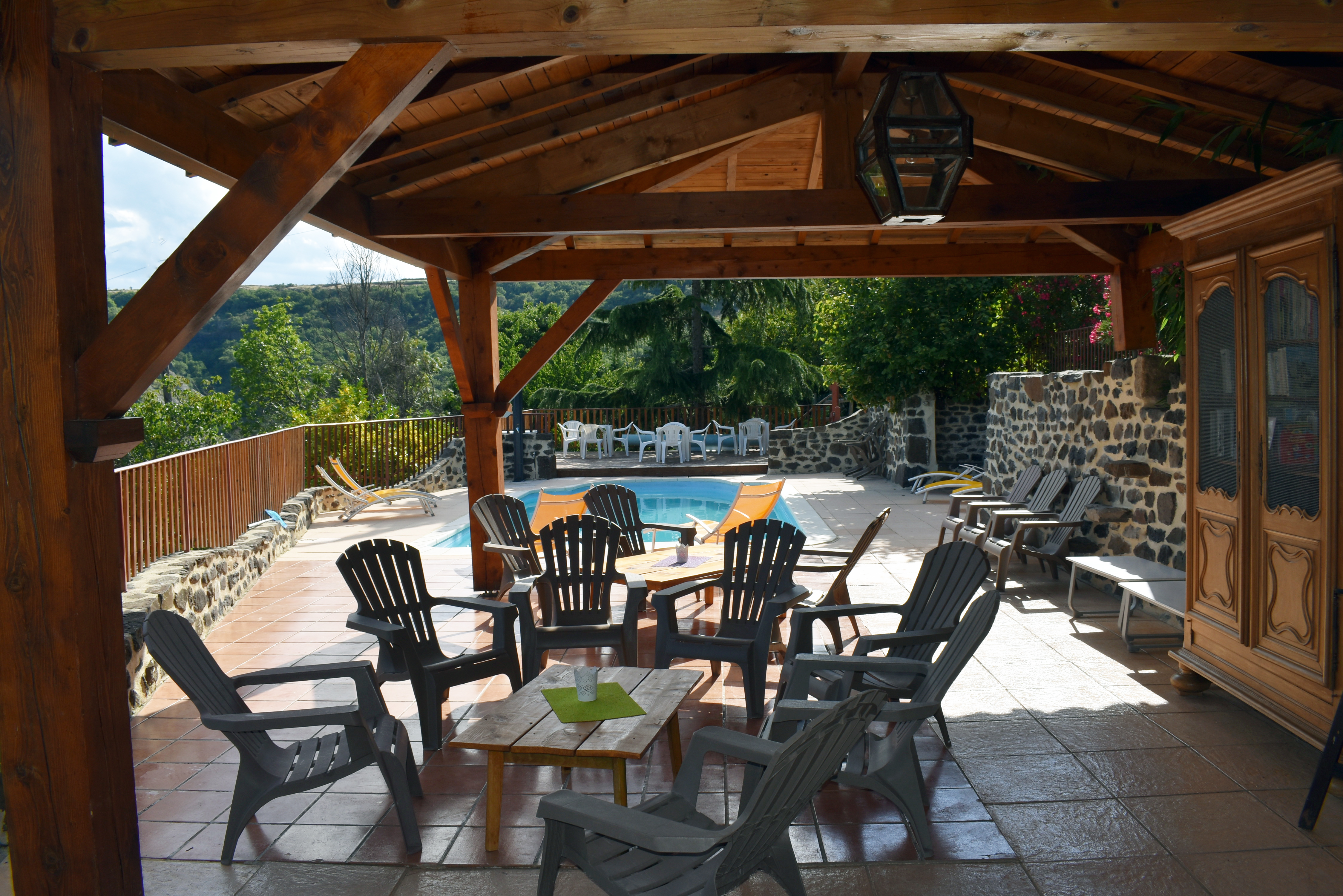 Traversant le patio, nous pouvons rejoindre une grande salle de réception de 73 m2 avec une cheminée ouverte. Cette pièce se prolonge d'une terrasse couverte de 35 m2 avec 2 W.C. extérieurs. Sous la terrasse, quelques marches permettent de rejoindre un dortoir supplémentaire composé de 2 chambres mansardées de 27,54 m2 et 15,64 m2 (surfaces au sol).