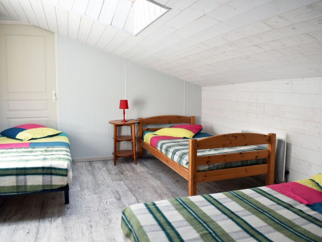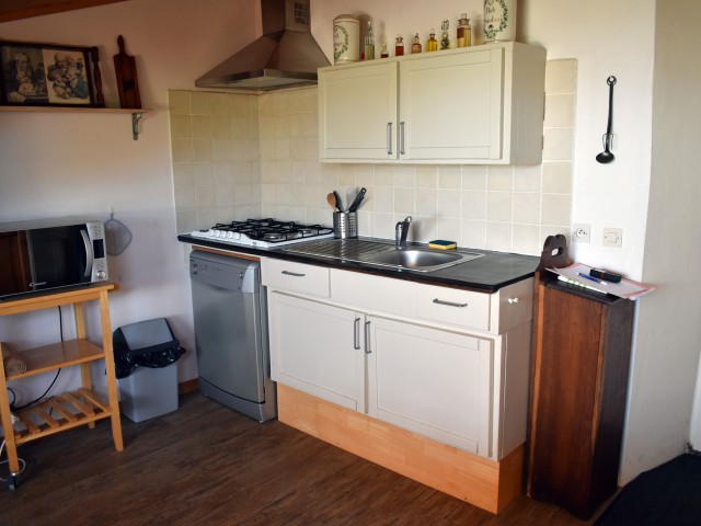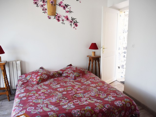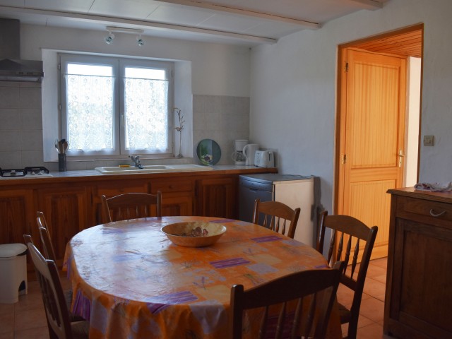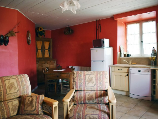 Un peu à l'écart, se situe une petite maison indépendante de 53 m2 avec terrasse, (chauffage électrique + poêle à bois), élevée sur une cave. Elle s'ouvre de plain-pied sur un hall d'entrée avec escalier, distribuant un W.C. avec lave-mains et une douche. A gauche de l'entrée, se trouve la cuisine-salle à manger de 13,80 m2 et à droite, un salon de 15,80 m2 (avec un poêle à bois), qui s'ouvre sur la terrasse. A l'étage, un palier de 5 m2 distribue deux chambre mansardées de 11,86 m2 et 13,76 m2 (au sol) avec chacune un lavabo.