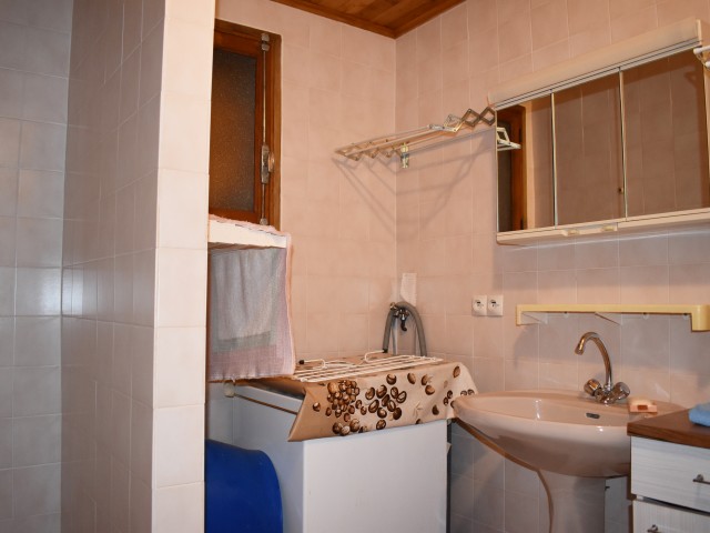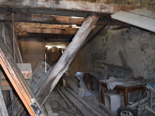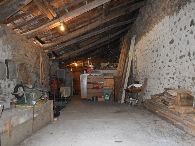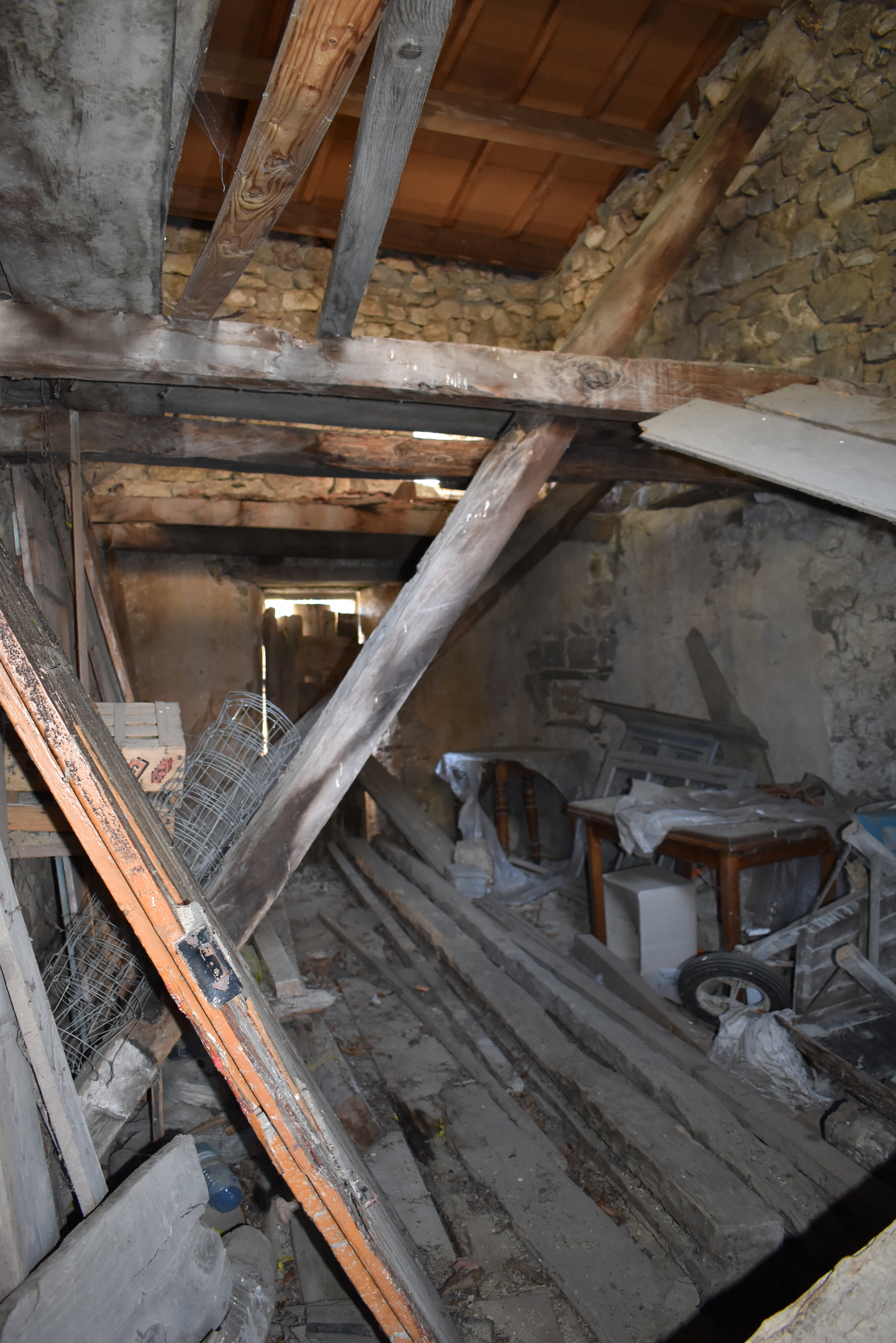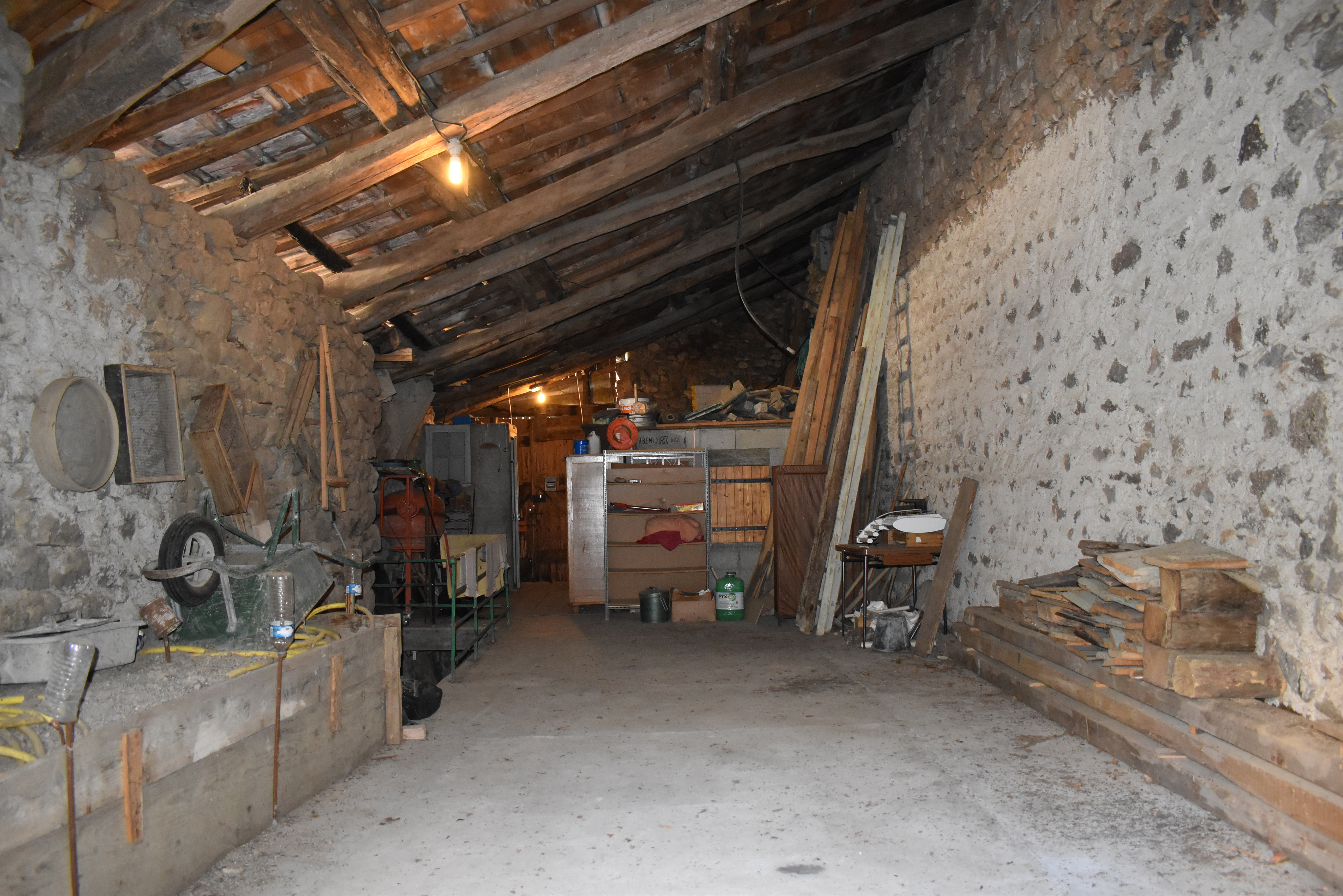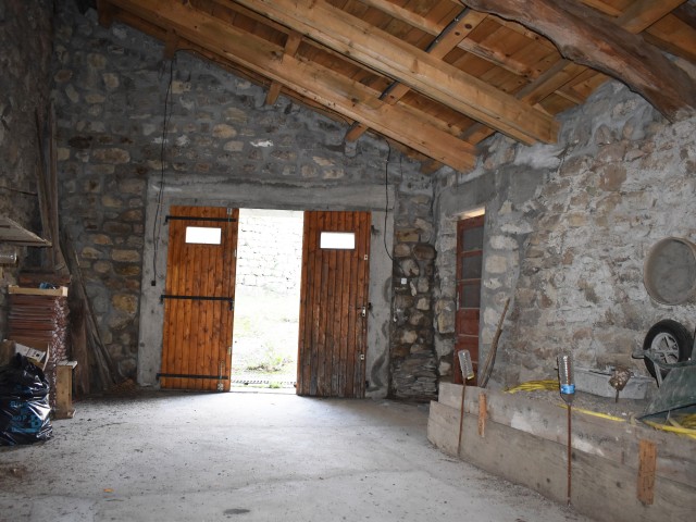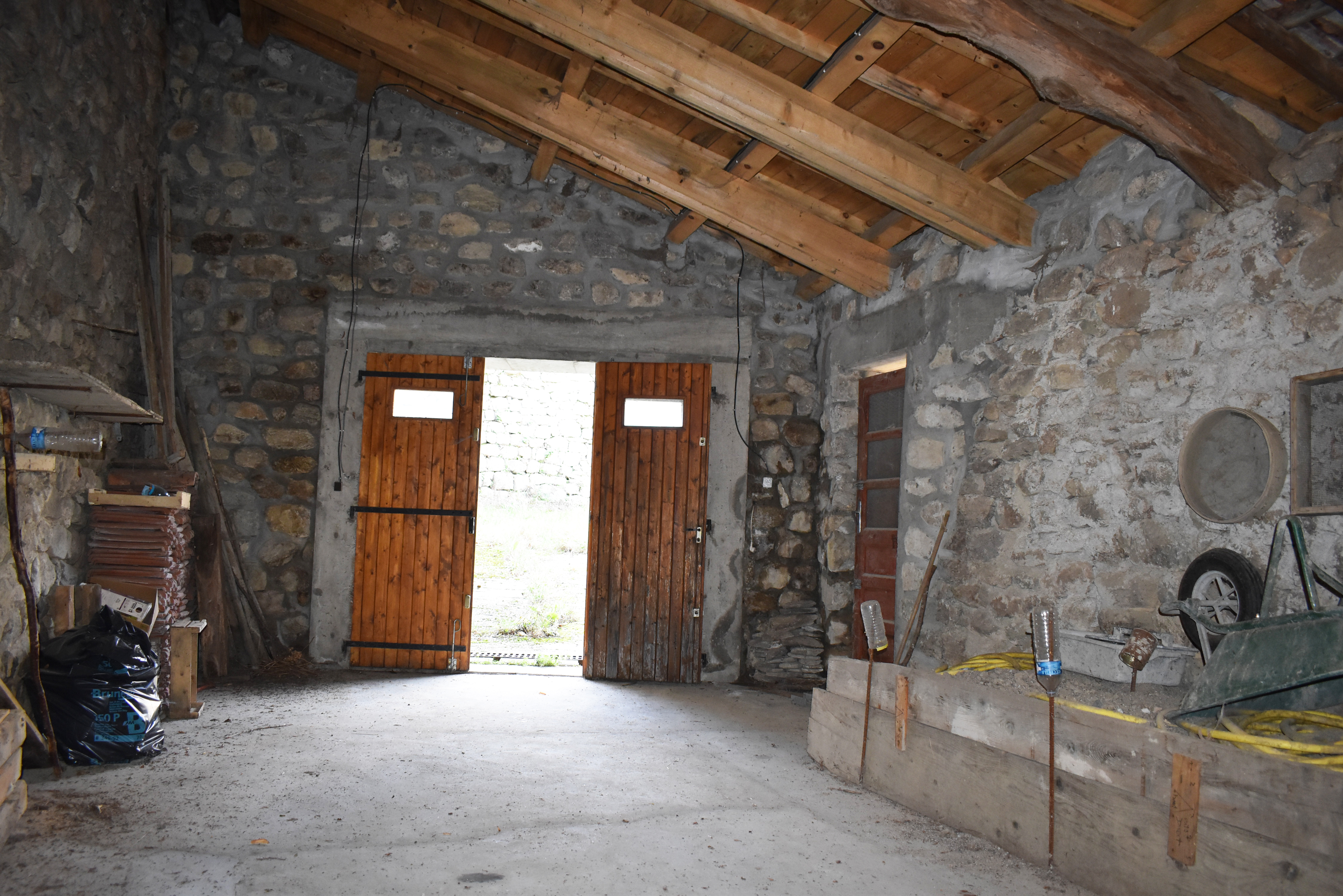Un dégagement qui permet de rejoindre la grange à usage de garage, distribue un W.C. et une salle d'eau (douche et lavabo) de 4,83 m2. La grange de 76 m2 s'ouvre à l'ouest sur l'impasse d'accès et à l'est sur une petite cour où se situe une deuxième petite grange de 30 m2 au sol avec un étage dont le plancher est écroulé. Un porche dans la cour permet de rejoindre une petite ruelle du hameau.