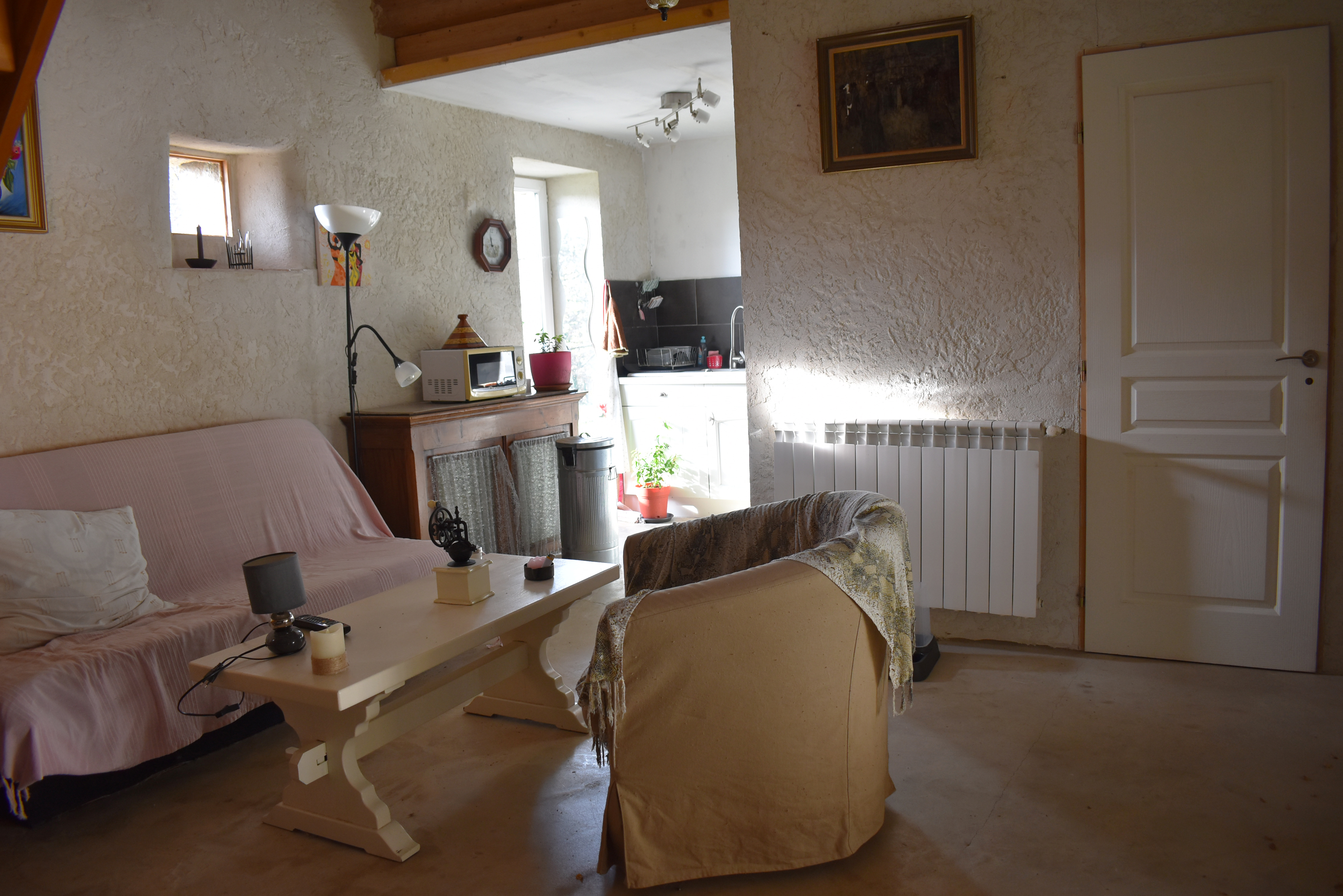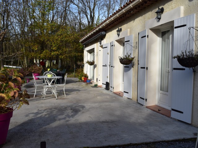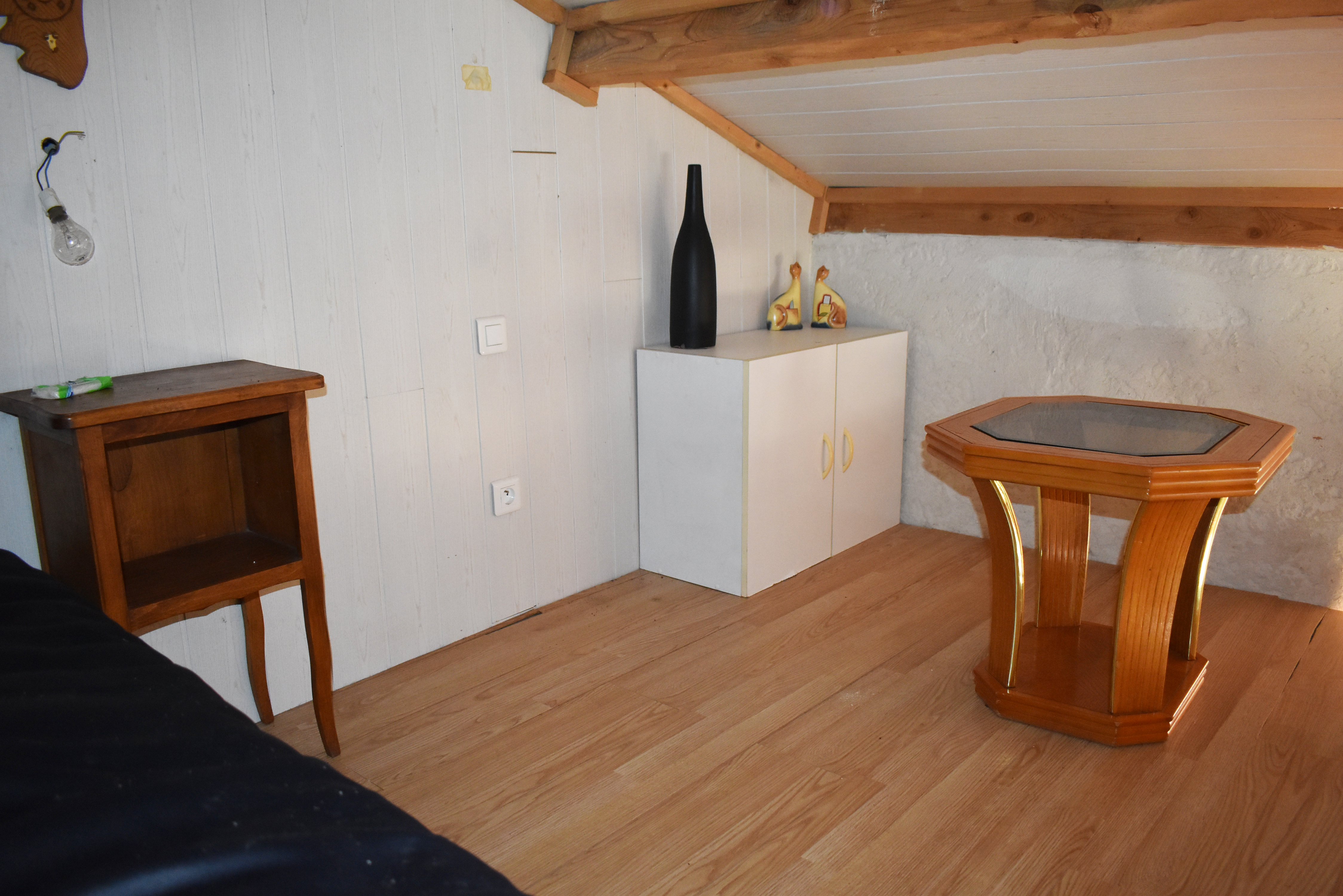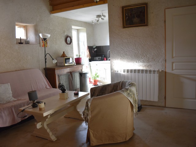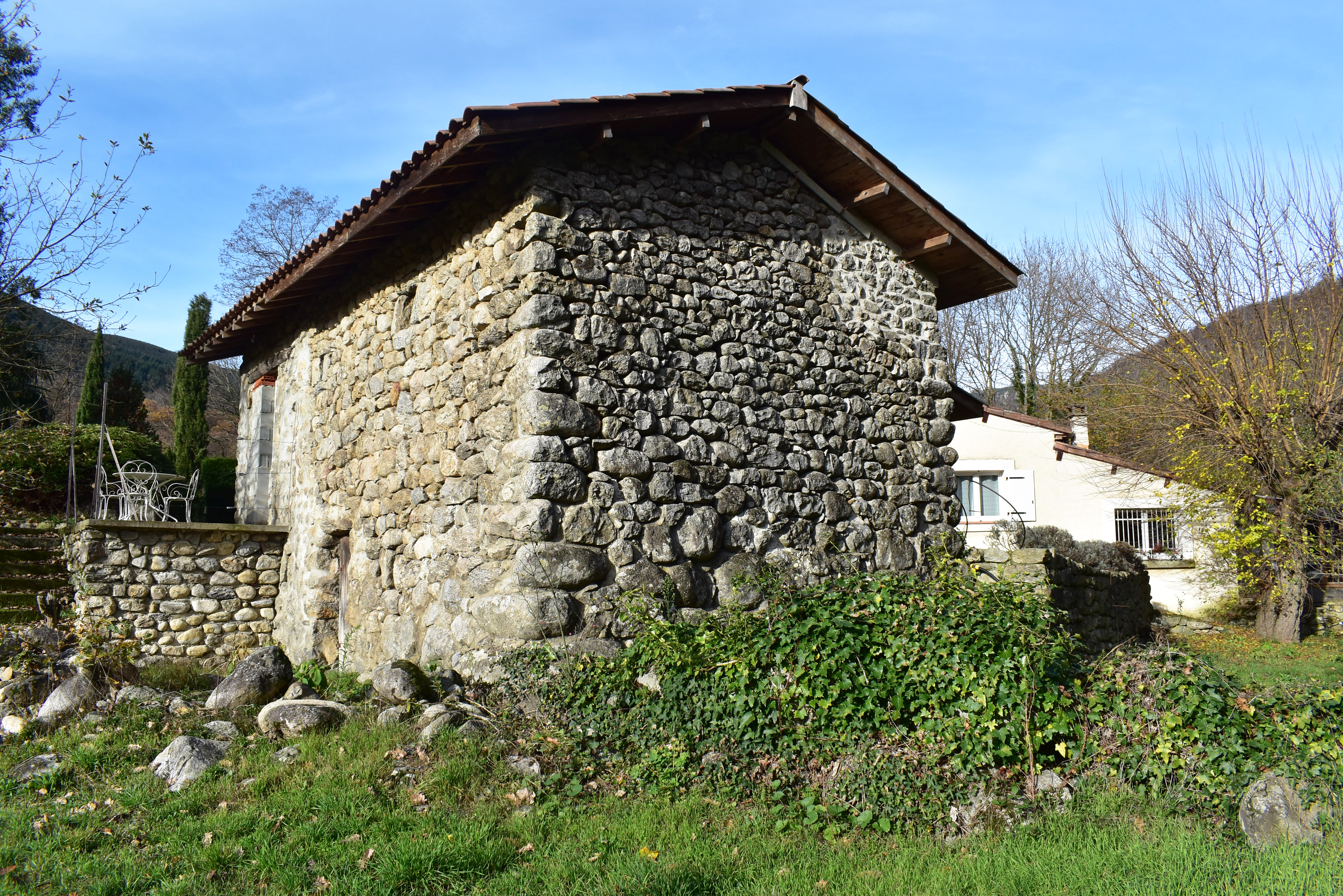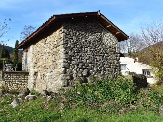 Dans la continuité de la terrasse, une petite grange en pierre élevée sur une cave (avec réservations pour une buanderie), a été rénovée en un studio de 46 m2 avec une terrasse couverte. De plain-pied, la pièce de vie de 33 m2 est prolongée d'un coin cuisine équipée de 6 m2. En annexe se situe une salle d'eau de 4,80 m2 avec un W.C.. Un escalier en bois mène à une mezzanine où se situe la chambre mansardée de 11,90 m2 au sol.