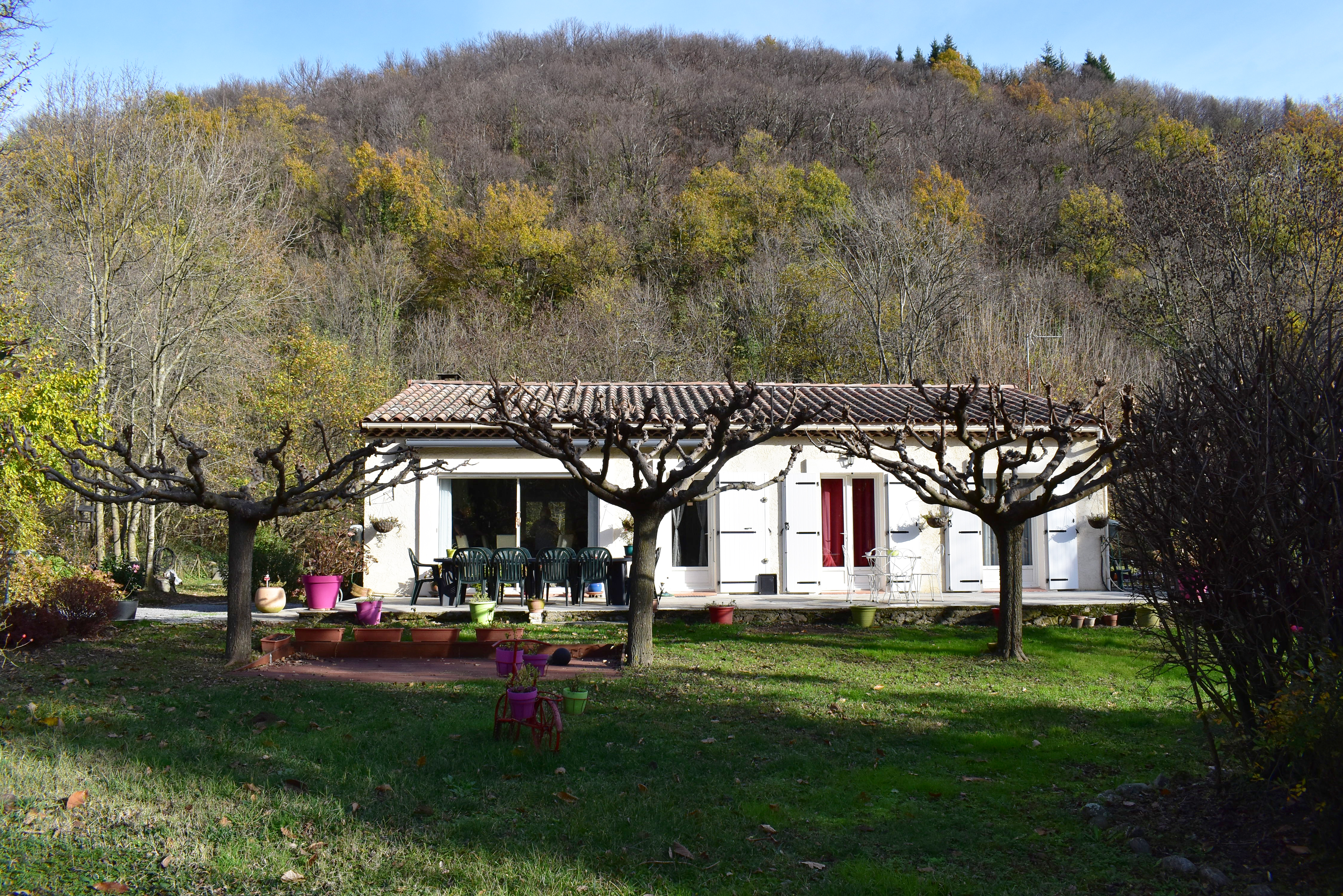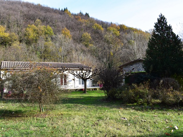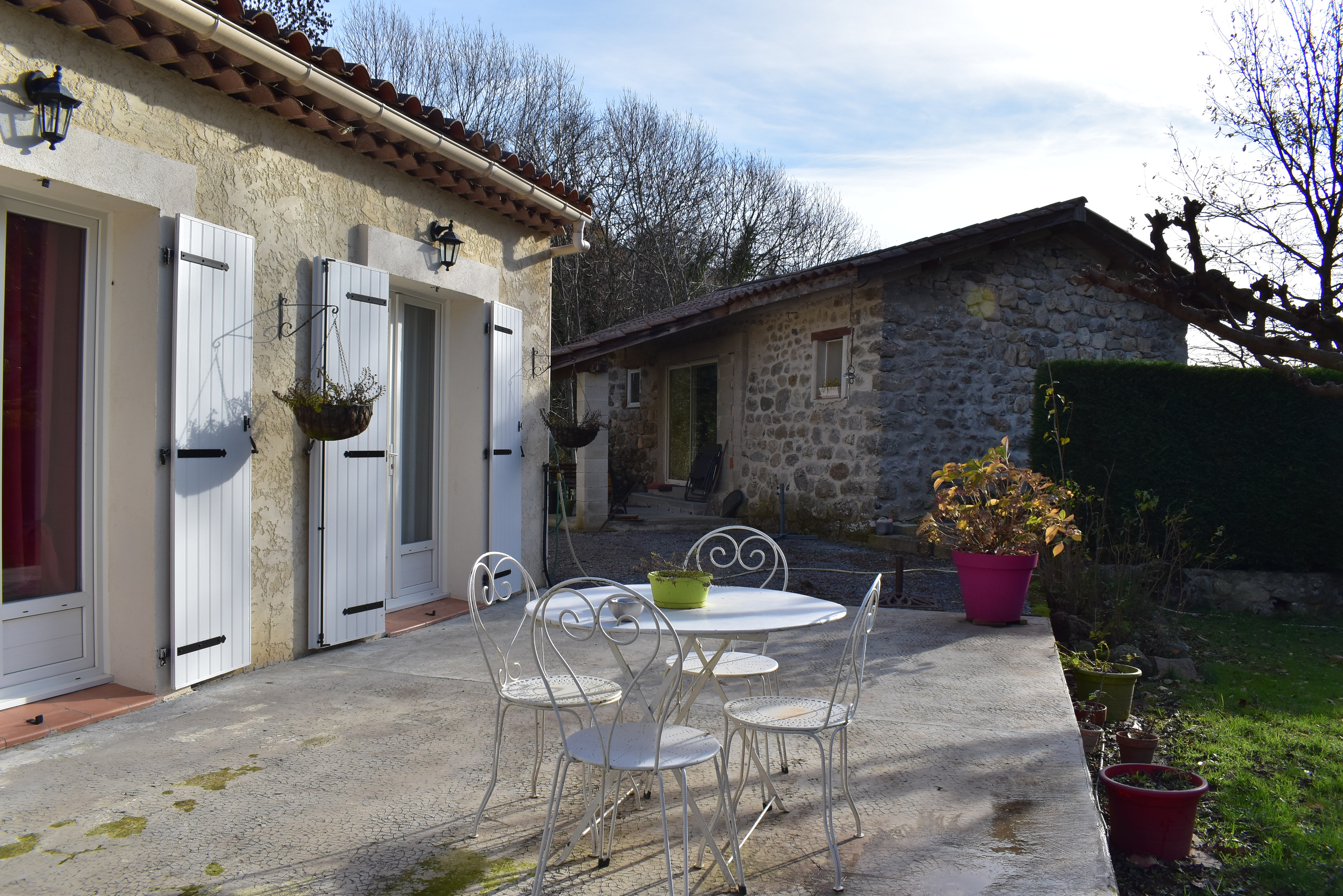 Massif du Tanargue, à 25 minutes de Largentière et de Joyeuse, une villa de plain-pied de 92 m2 habitables et une grange rénovée de 46 m2 avec 2000 m2 de jardin, un garage et un abri véhicules. La maison comprend un salon-salle à manger avec cheminée et cuisine intégrée ouverte, un cellier, 3 chambres, une salle d'eau et un W.C. Terrasse. La grange comprend une pièce de vie avec un coin cuisine équipée, une salle d'eau avec W.C; et une chambre en mezzanine et une cave. Terrasse couverte. Chauffage central au fuel pour les deux logements, tout à l'égout.