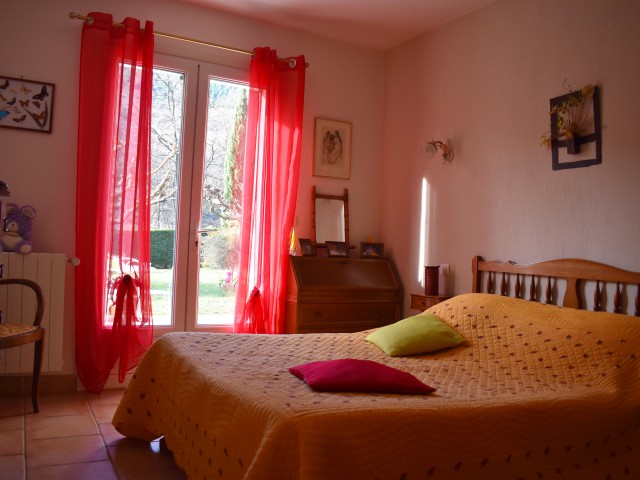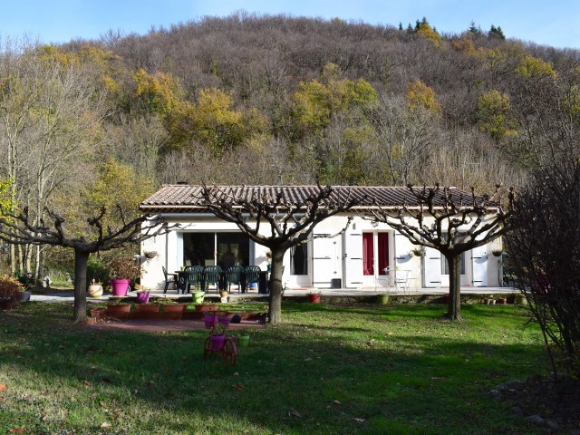 Dans le splendide massif du Tanargue traversé par la rivière La Beaume, se situe cette villa de plain-pied sans voisins directs et entourée d'un jardin de 2000 m2 bien entretenu. Elle possède un garage et un abri véhicules. Par la terrasse à son entrée, la maison s'ouvre sur une pièce de vie de 40 m2 éclairée par deux grandes baies et agrémentée d'une cheminée. Le séjour est séparé de la cuisine ouverte de 5 m2 par un bar. Elle est intégrée et permet de rejoindre la terrasse. En annexe, un cellier de 3 m2 permet de rejoindre le garage de 33 m2 par l'intérieur et un abri en bois pour 32,41 m2 supplémentaires. Un dégagement conduit à 3 chambres avec placards de 10,80 m2, 9,22 m2 et 11 m2 ainsi qu'une salle d'eau de 7 m2 et un W.C..