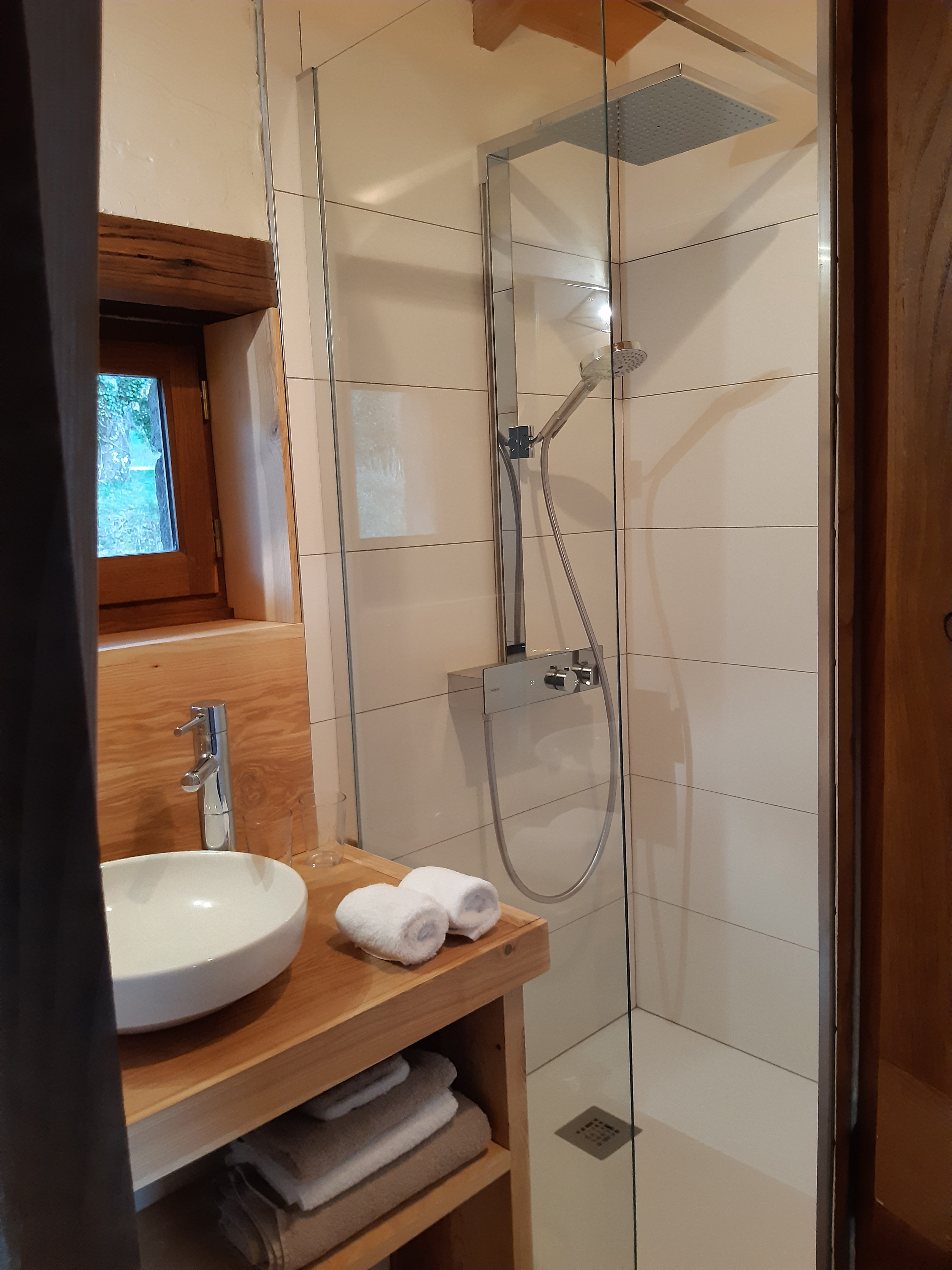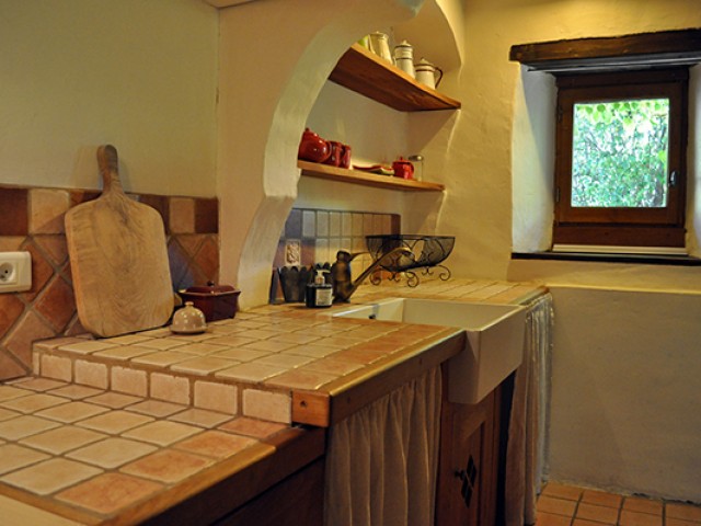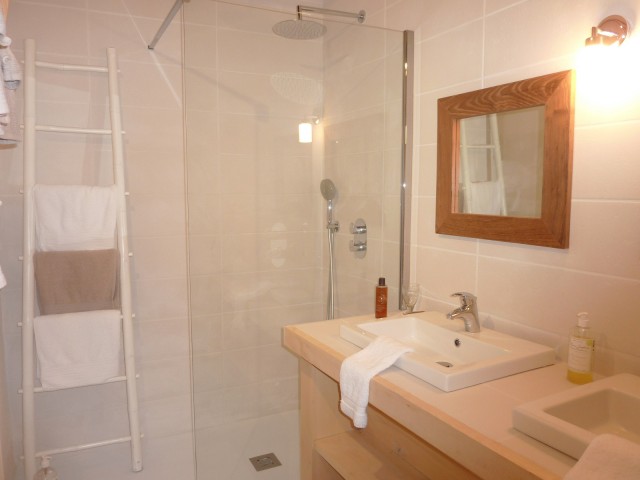 Le bâtiment principal s’ouvre sur une cuisine menuisée de 18,6 m2 et illuminée par une large baie vitrée au-dessus du plan de travail. Quelques marches plus haut, ouvert sur la cuisine un lumineux et spacieux séjour de 53,30 m2 avec la charpente apparente et une belle cheminée ouverte. Dans l’aile Est, nous entrons dans une pièce de distribution de 8,80 m2 pourvue de placards qui mène à une chambre (studio-chambre d’hôte) en rez-de-chaussée de 24,11 m2 avec un coin-cuisine équipé et l’accès à une terrasse ombragée et à une salle de bains de 5,51 m2 et un W.C. séparé. Un bel escalier en bois conduit au premier étage vers deux chambres de 19 m2 et 12,50 m2 en suite avec une salle d’eau de 5,50 m2 et un W.C. séparé. Au même niveau se trouve une chambre de 12,80 m2 avec une salle d’eau de 2,10 m2 et un W.C. séparé et une formidable terrasse solarium d’une dizaine de m2 avec la vue. Ces 3 chambres à l’étage sont accessibles indépendamment par l’extérieur.