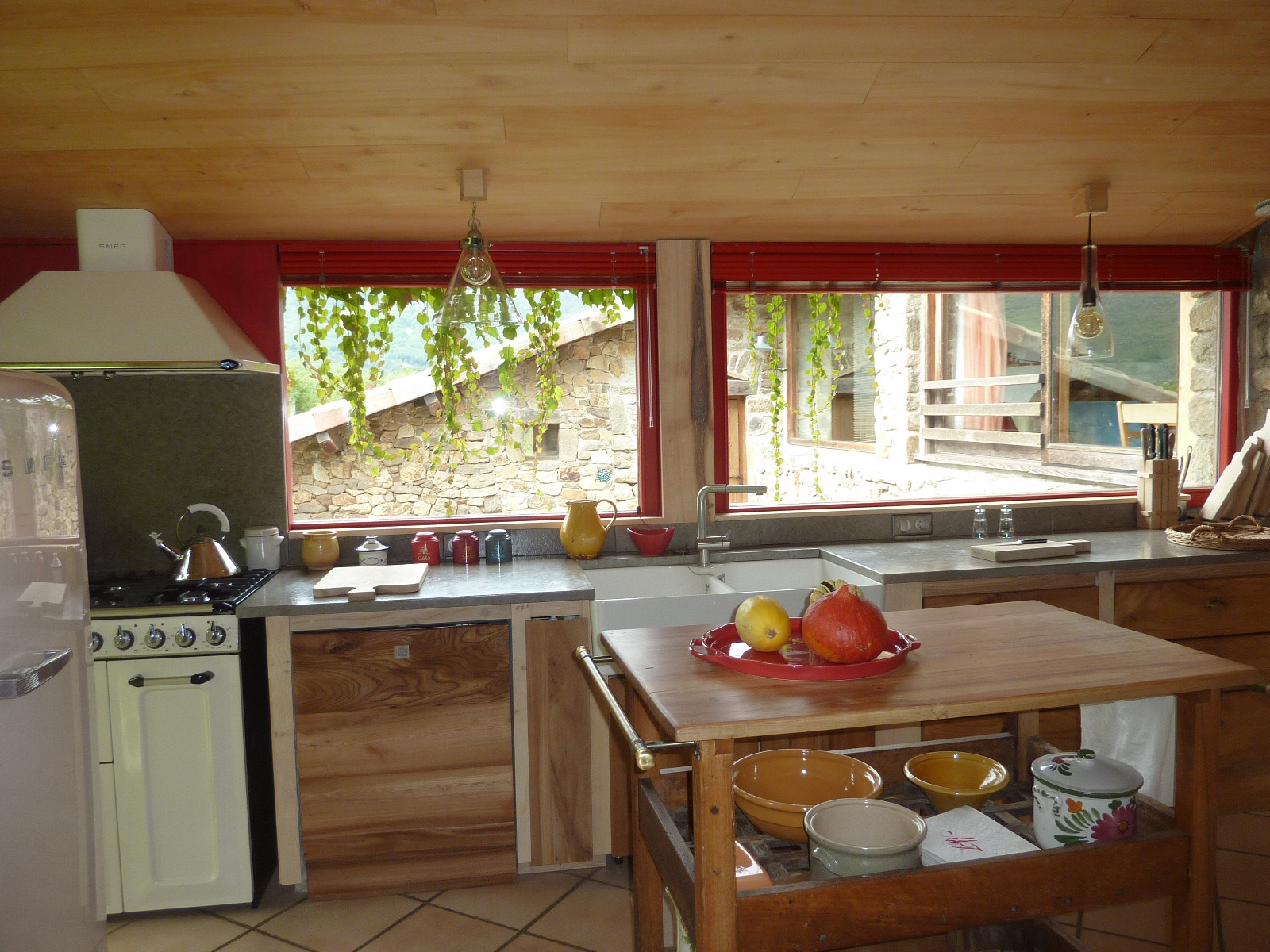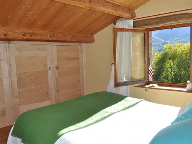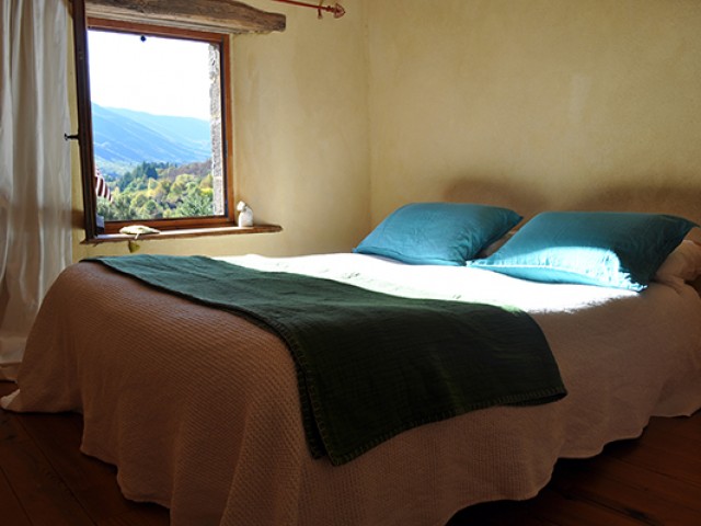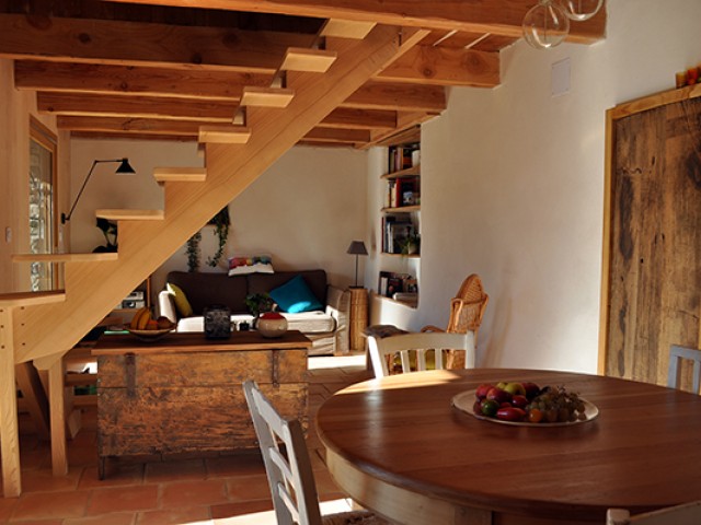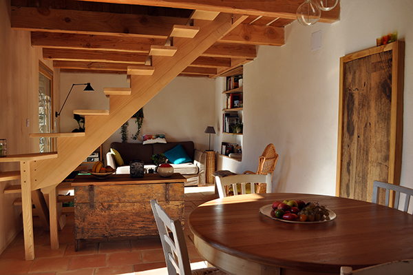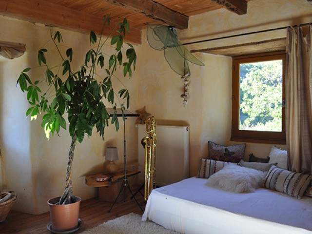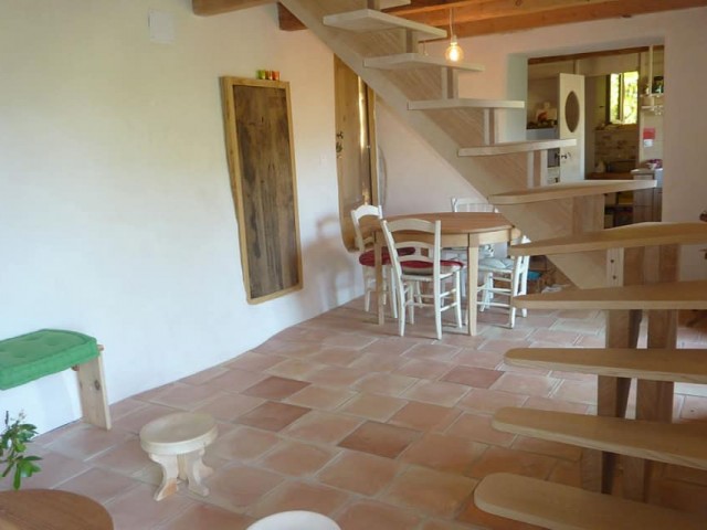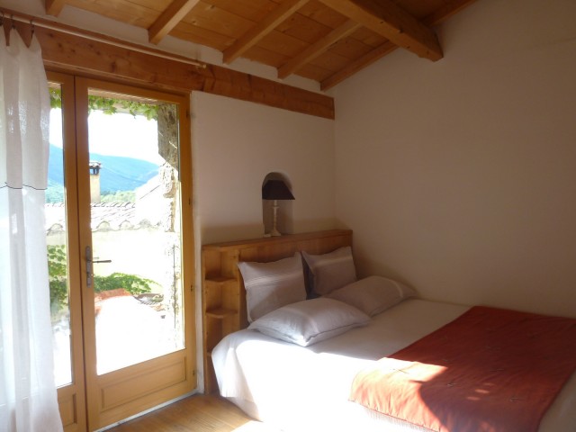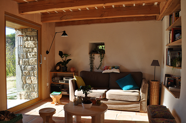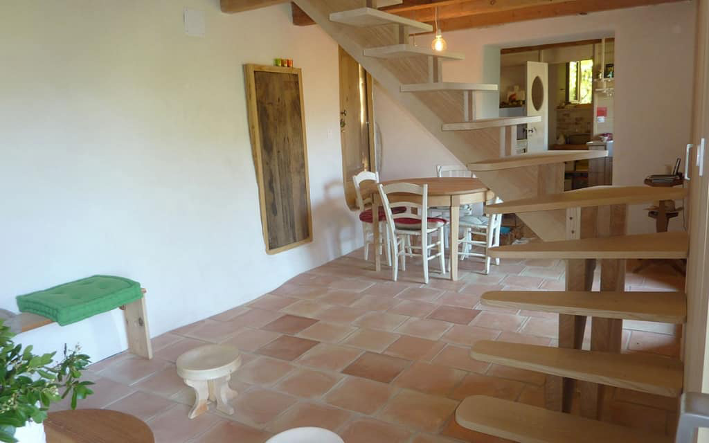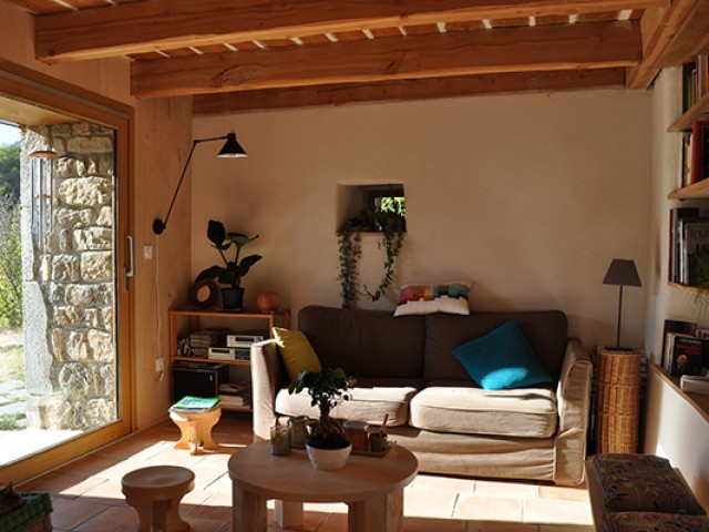 Au rez-de-jardin inférieur, un salon de 20 m2, carrelée de terres cuites fait main, se prolonge d’une cuisine aménagée de 3,56 m2 et d’une salle d’eau de 3,50 m2 avec toilette sèche. La pièce s’ouvre sur une terrasse ombragée par des baies qui encadrent la vue sur la montagne.Un escalier en bois conduit à l’étage vers un palier avec un bureau de 11,33 m2 qui distribue deux chambres de 11 m2 dont une avec une mezzanine. L’ensemble de l’étage a un parquet en bois au sol.