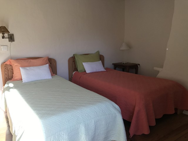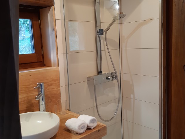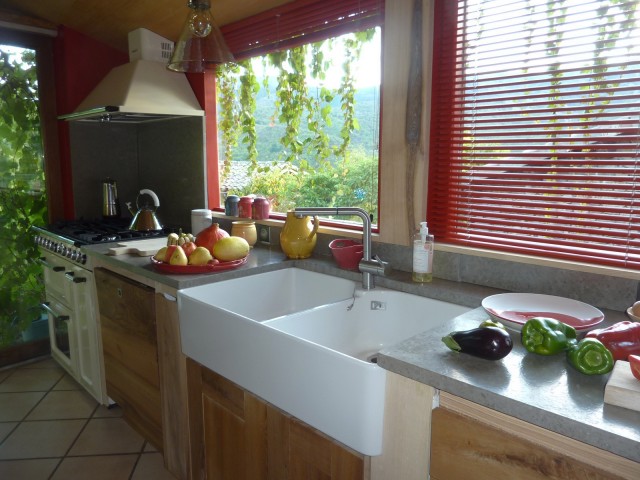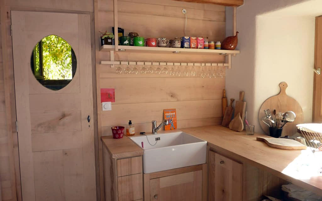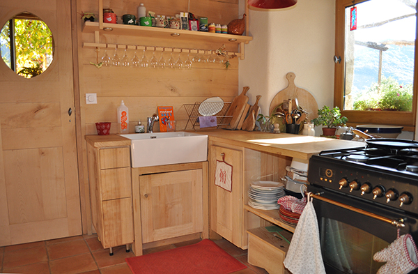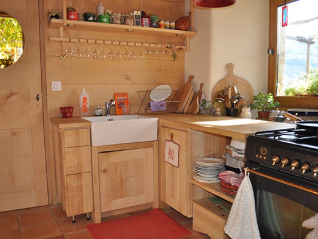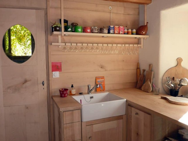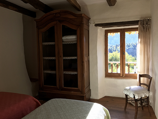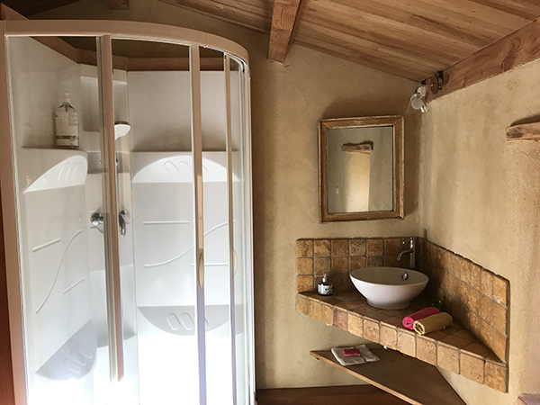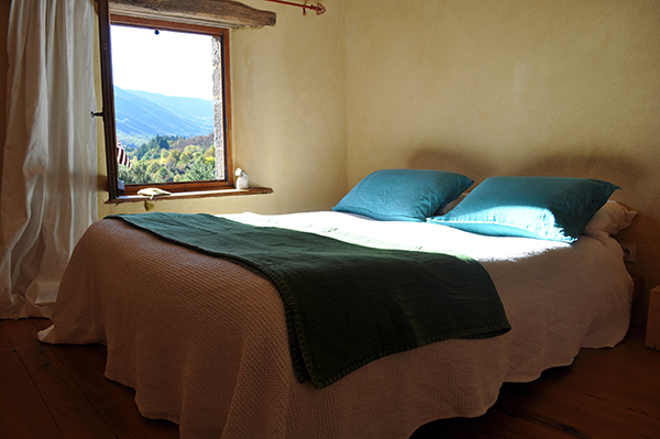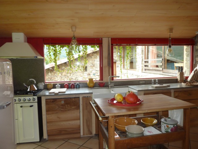 Au rez-de-jardin inférieur, un salon de 20 m2, carrelée de terres cuites fait main, se prolonge d’une cuisine aménagée de 3,56 m2 et d’une salle d’eau de 3,50 m2 avec toilette sèche. La pièce s’ouvre sur une terrasse ombragée par des baies qui encadrent la vue sur la montagne.Un escalier en bois conduit à l’étage vers un palier avec un bureau de 11,33 m2 qui distribue deux chambres de 11 m2 dont une avec une mezzanine. L’ensemble de l’étage a un parquet en bois au sol.