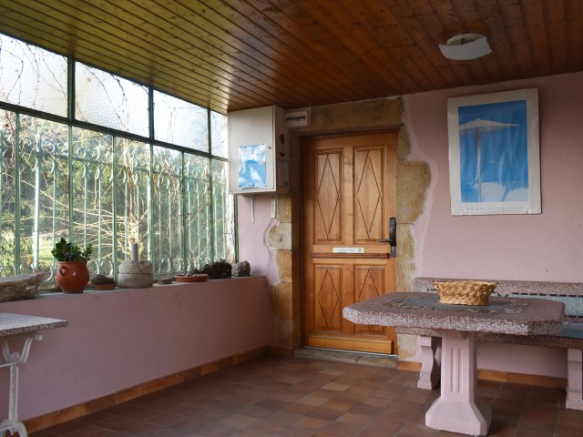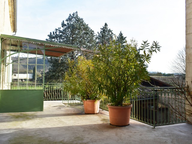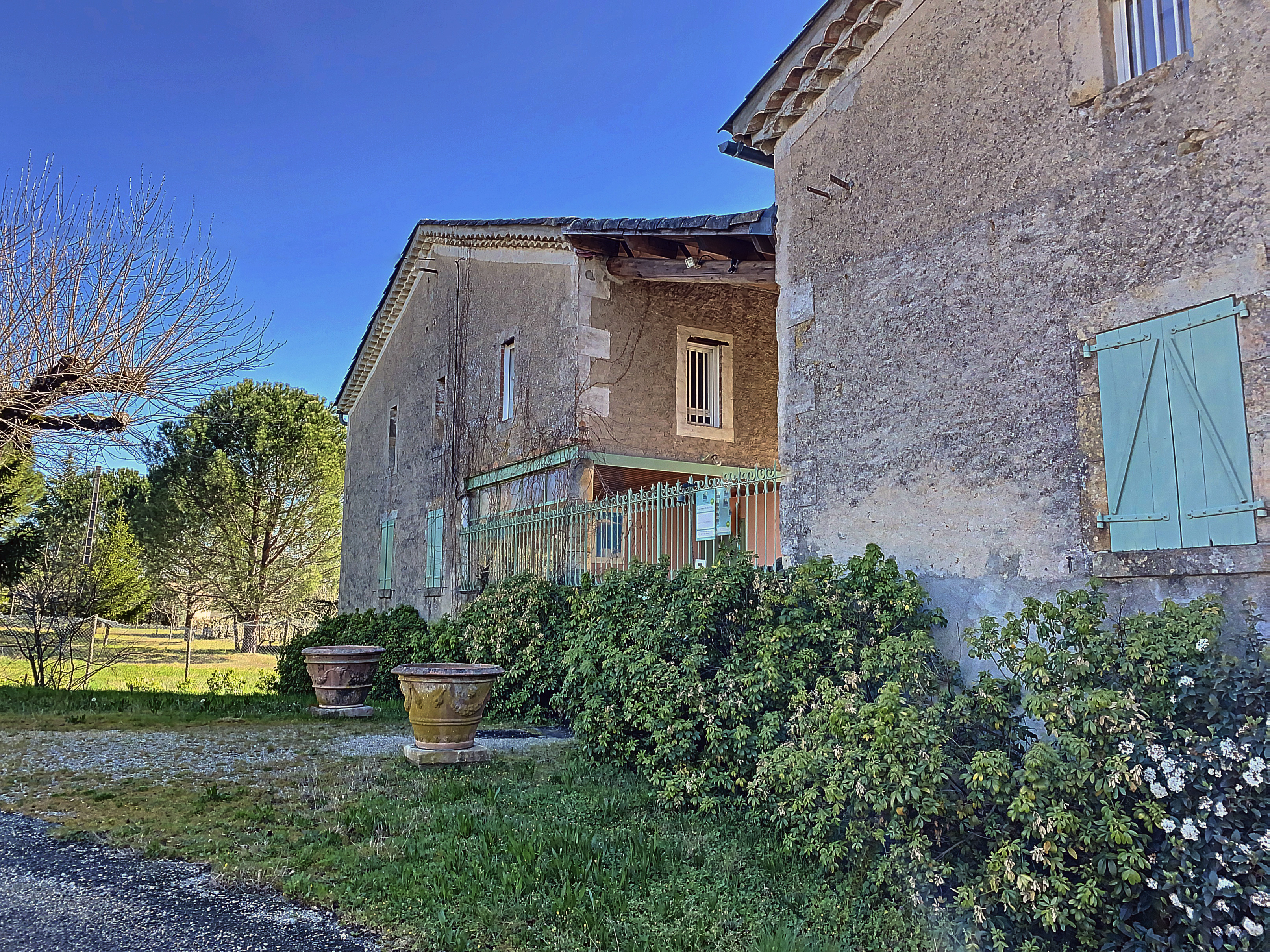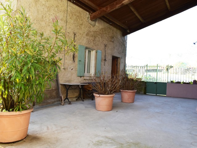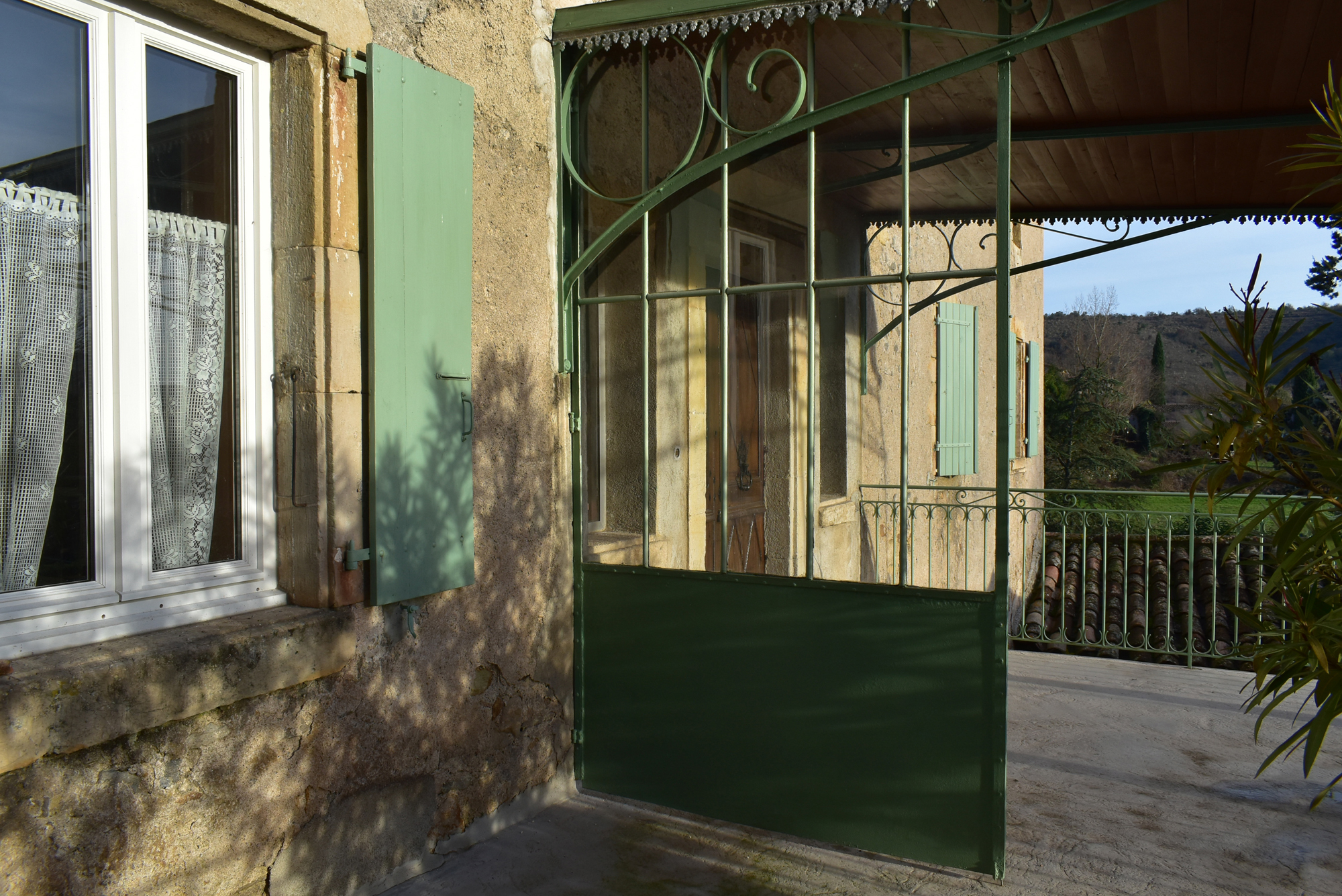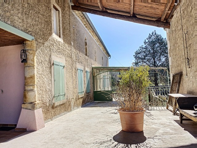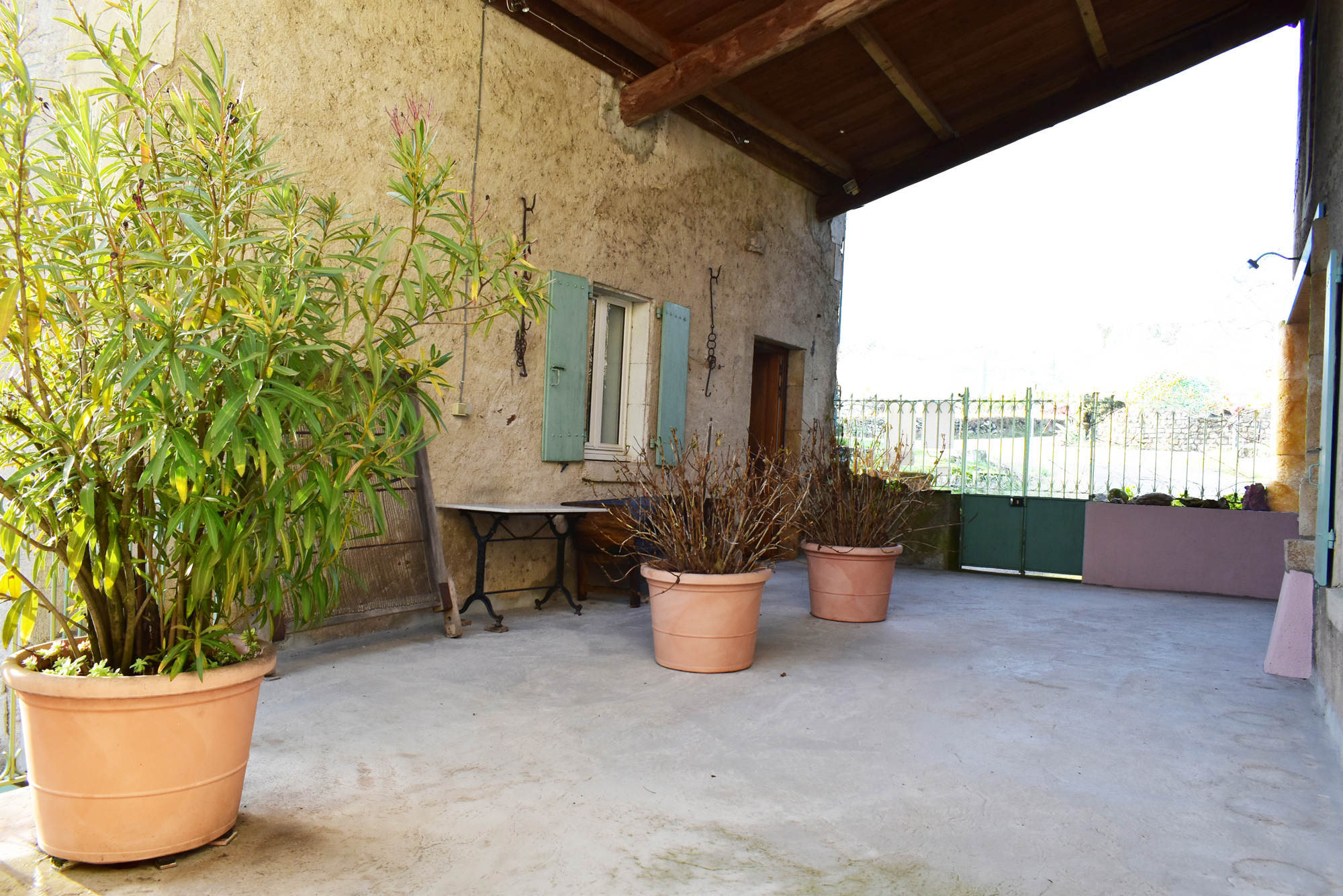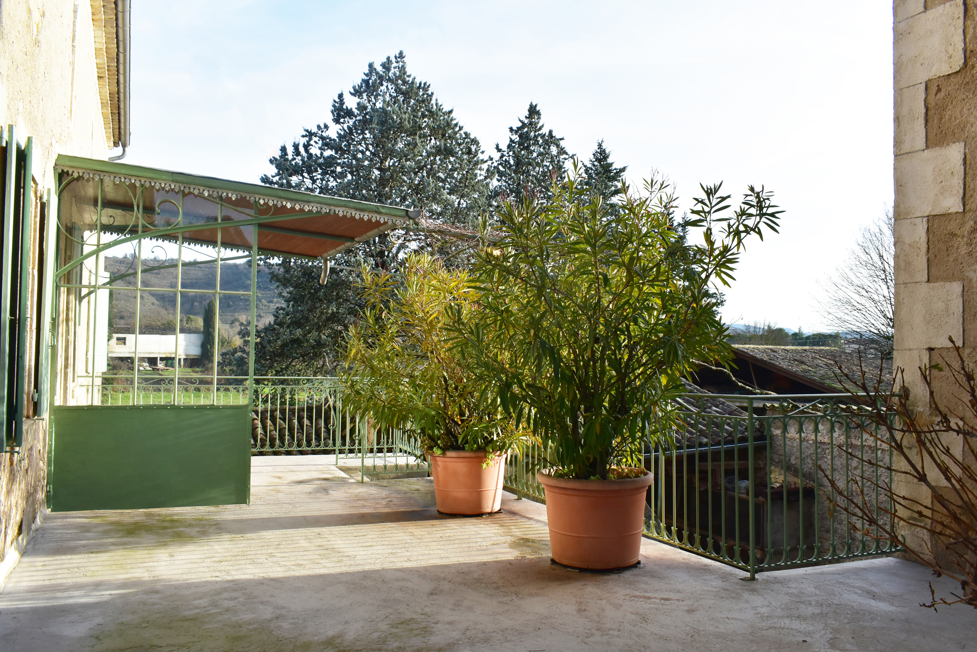 Fermée par une cour intérieure, celle-ci s'ouvre pour accéder par quelques marches sur une grande terrasse couverte reliant les deux bâtisses de la propriété. Le terrain en larges terrasses prolonge les bâtiments à l'Est, avec une piscine hors-sol.