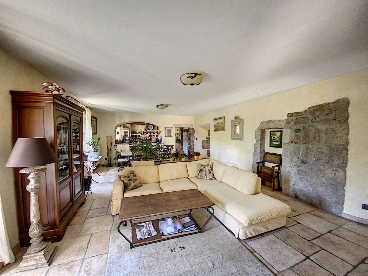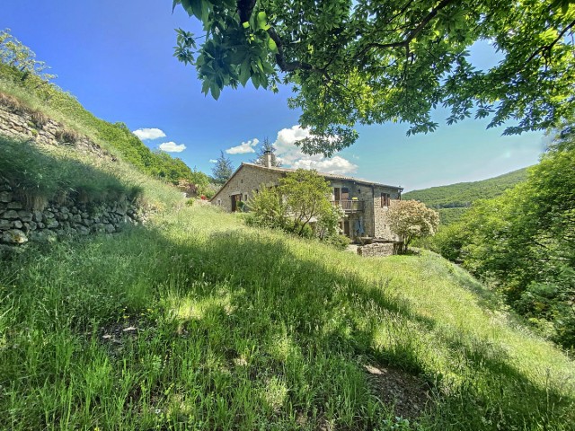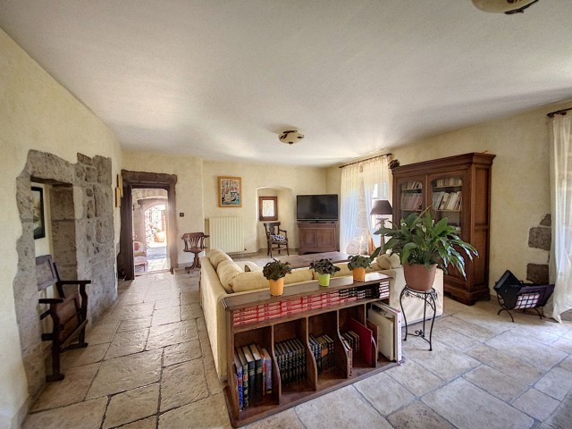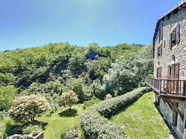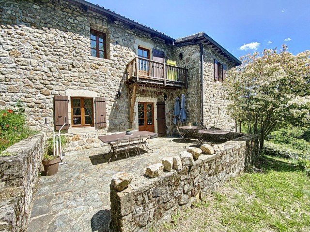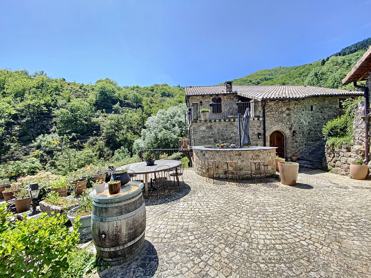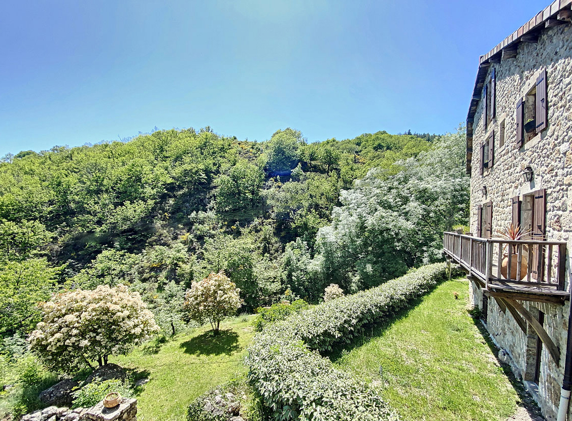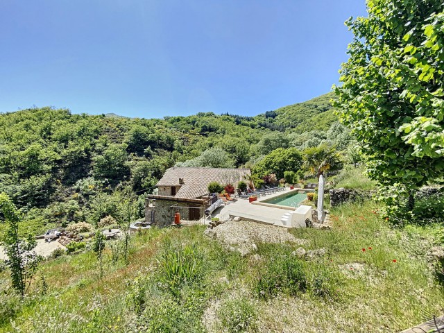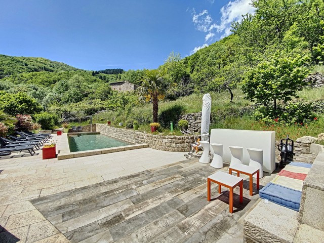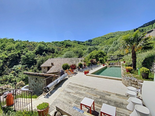 Ardèche méridionale, dans le Parc Régional des Monts d’Ardèche : une splendide demeure de caractère rénovée de 330 m2 habitables avec 2,45 ha de terrain en partie constructible source permanente, piscine avec plage et vue dominante, et ruisseau en bordure. Majestueux séjour-salon avec cheminée et bar, grande salle à manger et cuisine équipée, 6 chambres, 5 salles d’eau, une salle de bains, terrasses, caves, buanderie, petite dépendance en pierre. Garage pour 2 véhicules. Jeu de boules. Chauffage central, fosse septique, ADSL. Commerces dans le village. Baignades dans une rivière limpide.