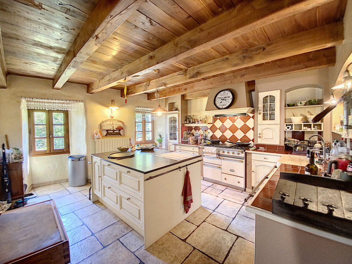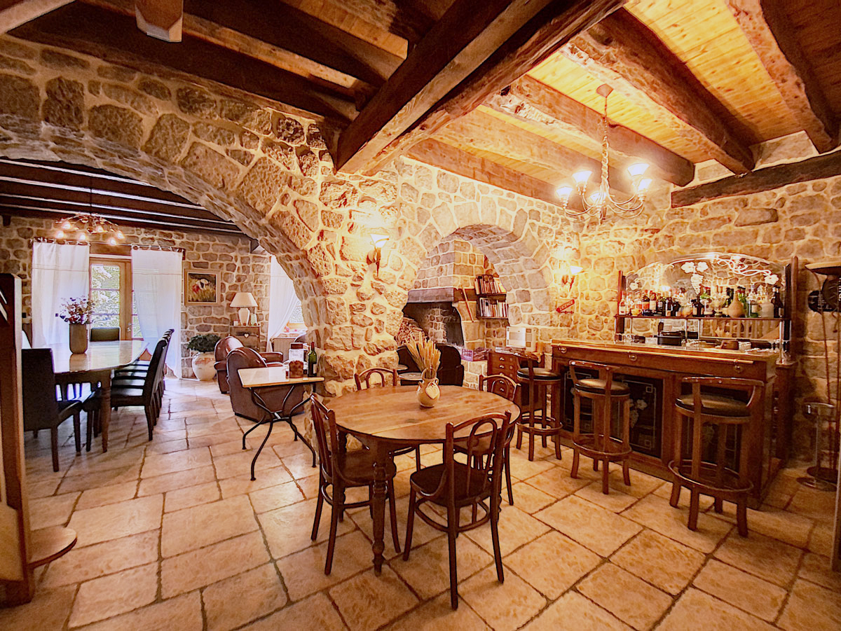 La demeure s’ouvre sur une belle entrée de 20 m2 avec accès à un cabinet de toilette et une buanderie de 7,70 m2 par une porte dérobée. Elle distribue un monumental salon-séjour de 78 m2 avec une grande cheminée ancienne, un bar de bistrot en bois et une sortie vers une belle terrasse dallée. Une porte dans cette pièce permet de rejoindre au niveau inférieur les caves à vin et réserves. Toujours au rez-de-chaussée, un second grand séjour de 41,85 m2 est séparé d’une cuisine de 18,90 m2 à l’esprit « rétro » mais équipée comme une « pro ».