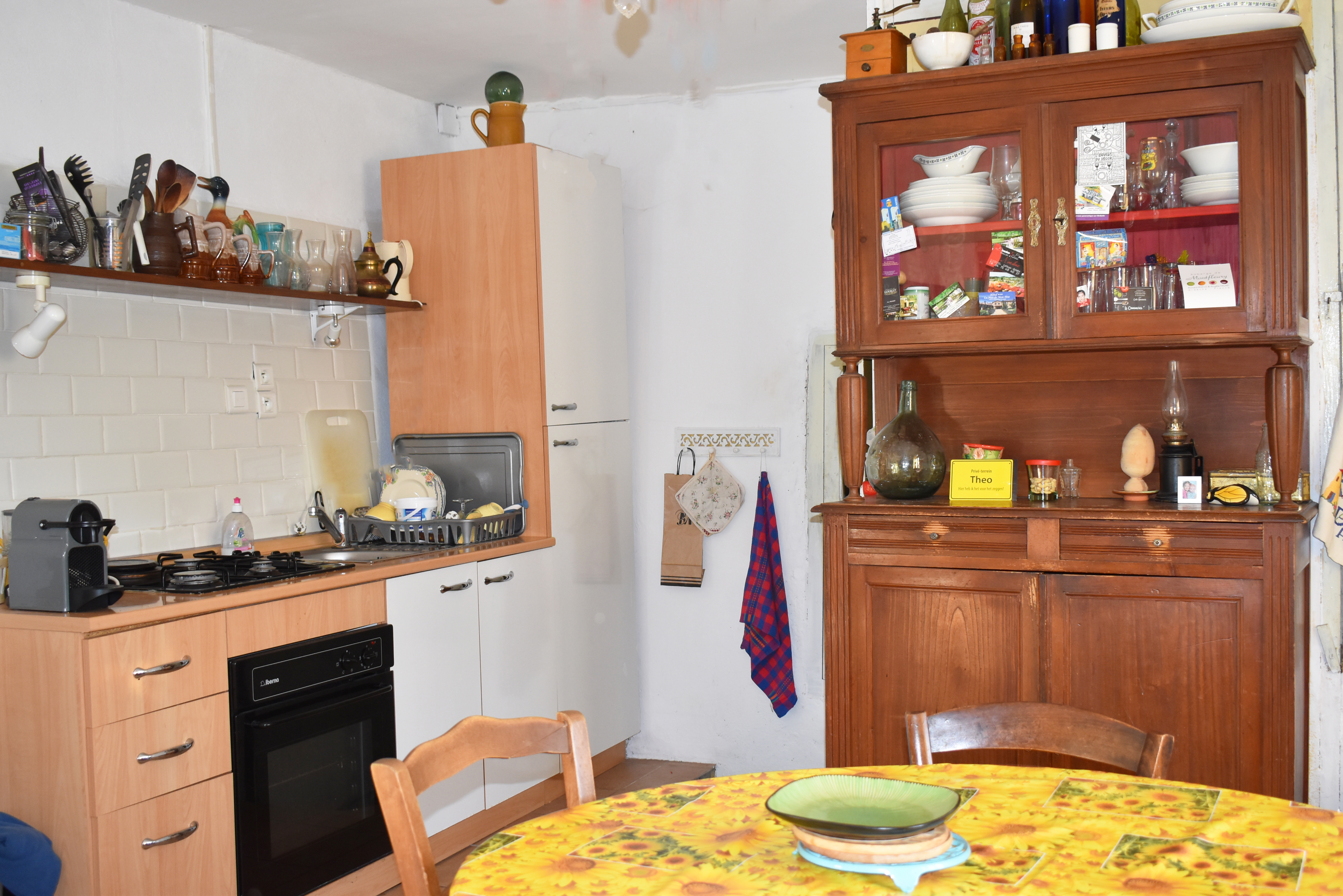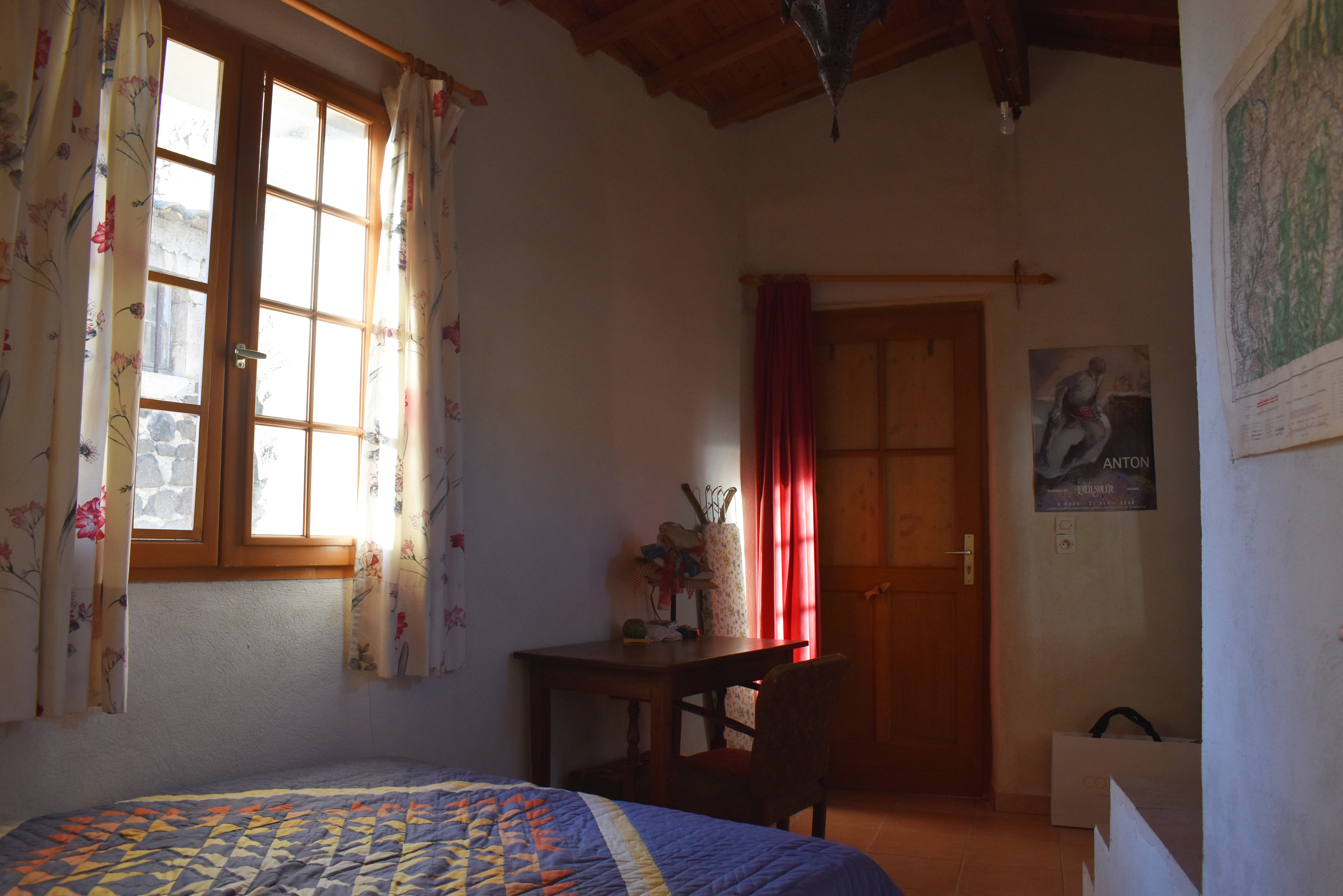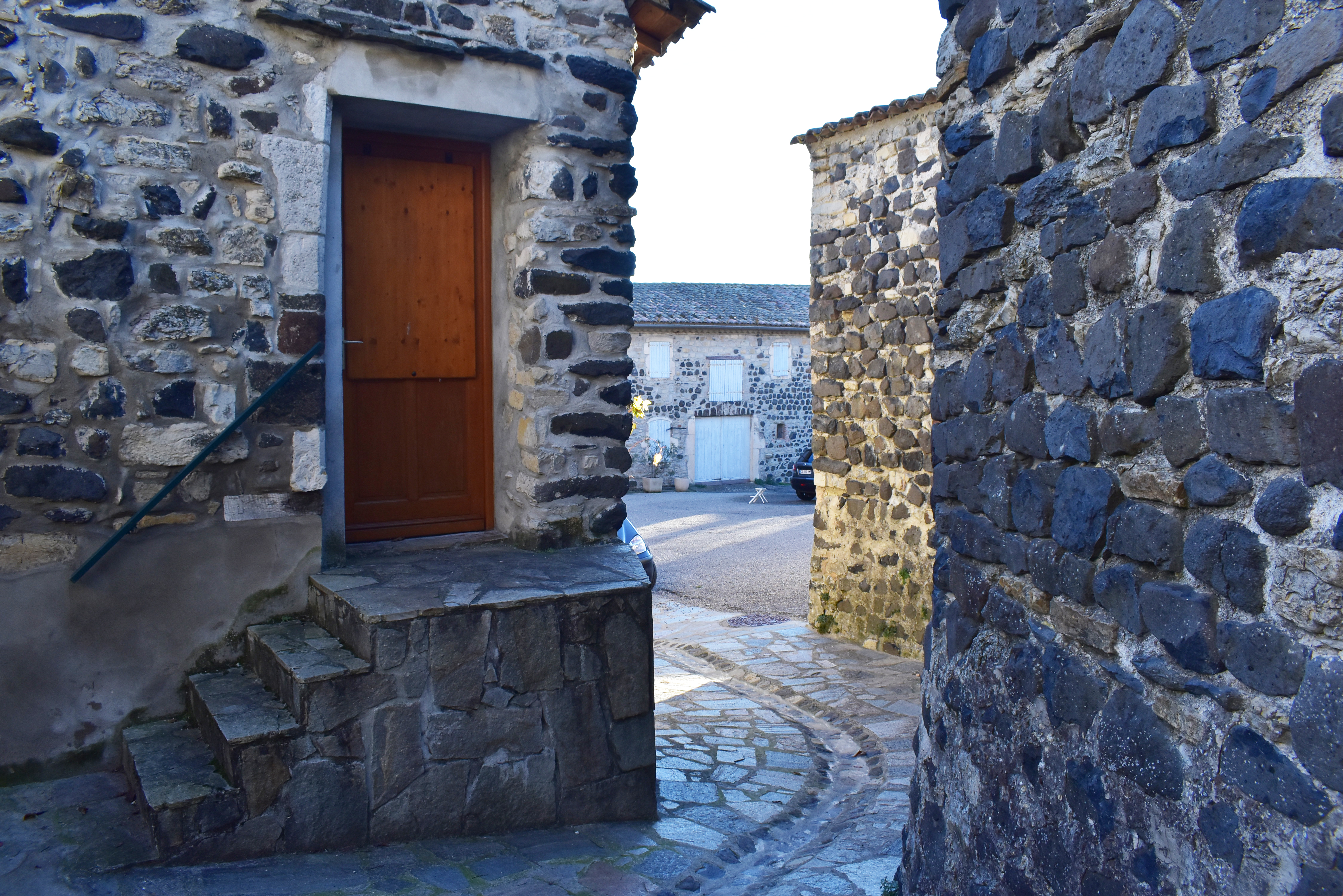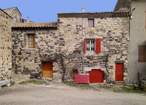 Sur la petite place d'un village typique de l'Ardèche méridionale, cette maison mitoyenne a été rénovée par étapes depuis les années '60.