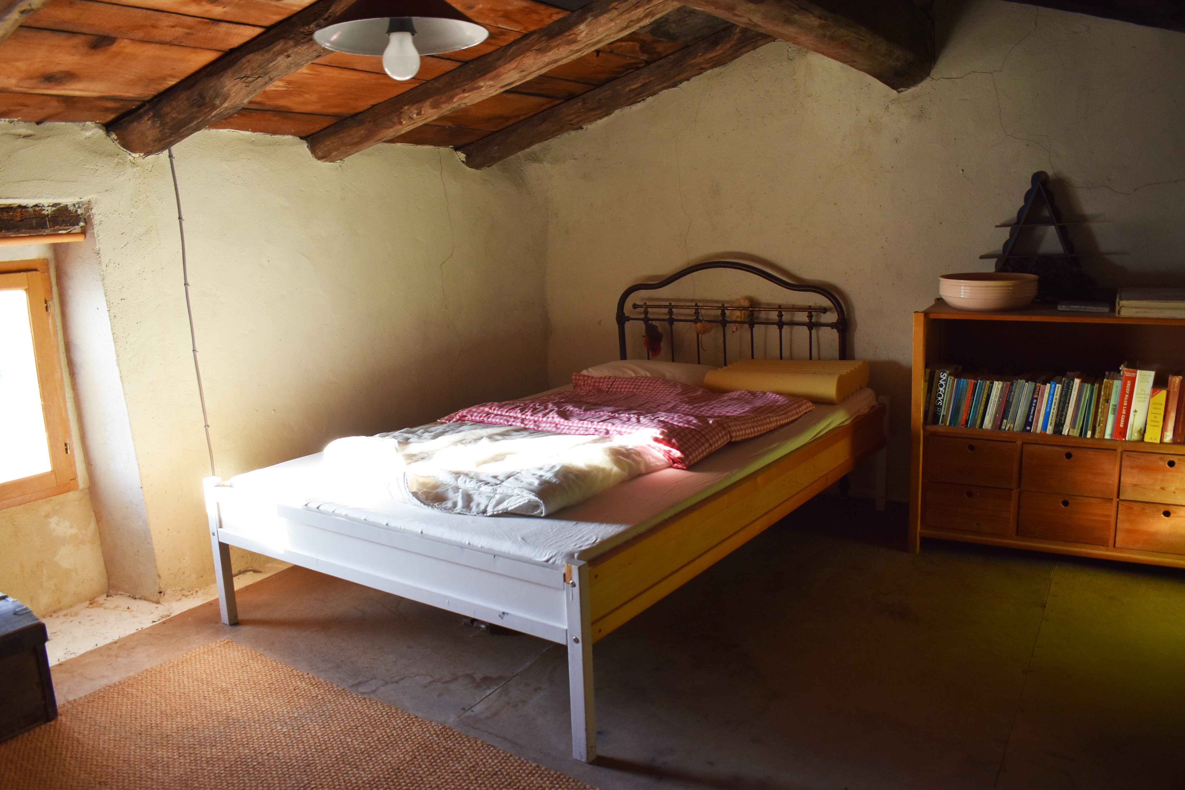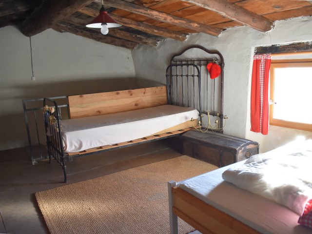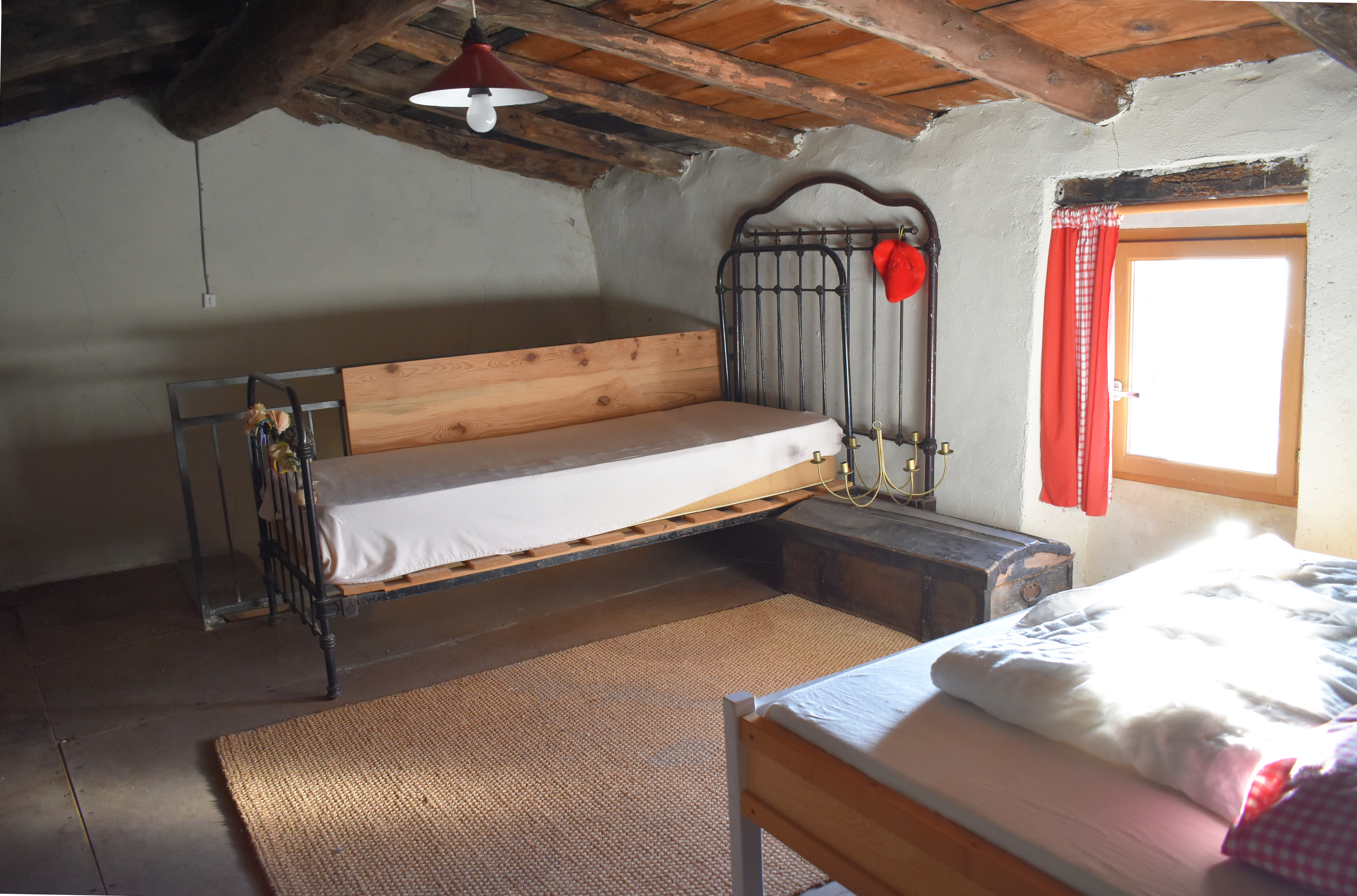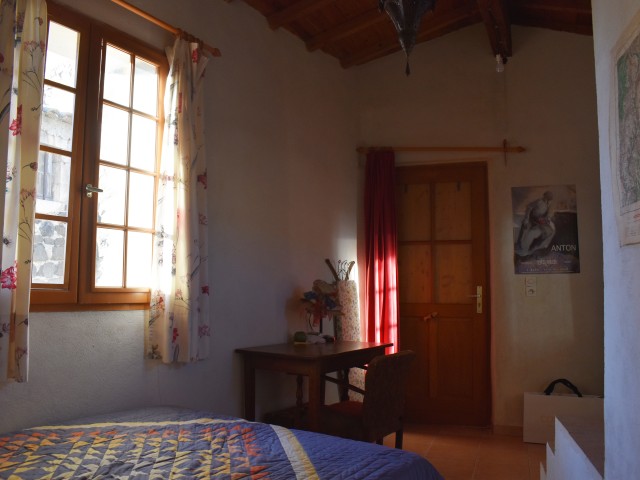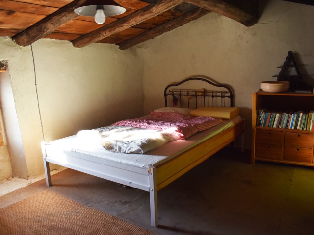 Au-dessus du séjour, une chambre mansardée de 23,19 m2 au sol, à rafraîchir fait usage de chambre d'amis.