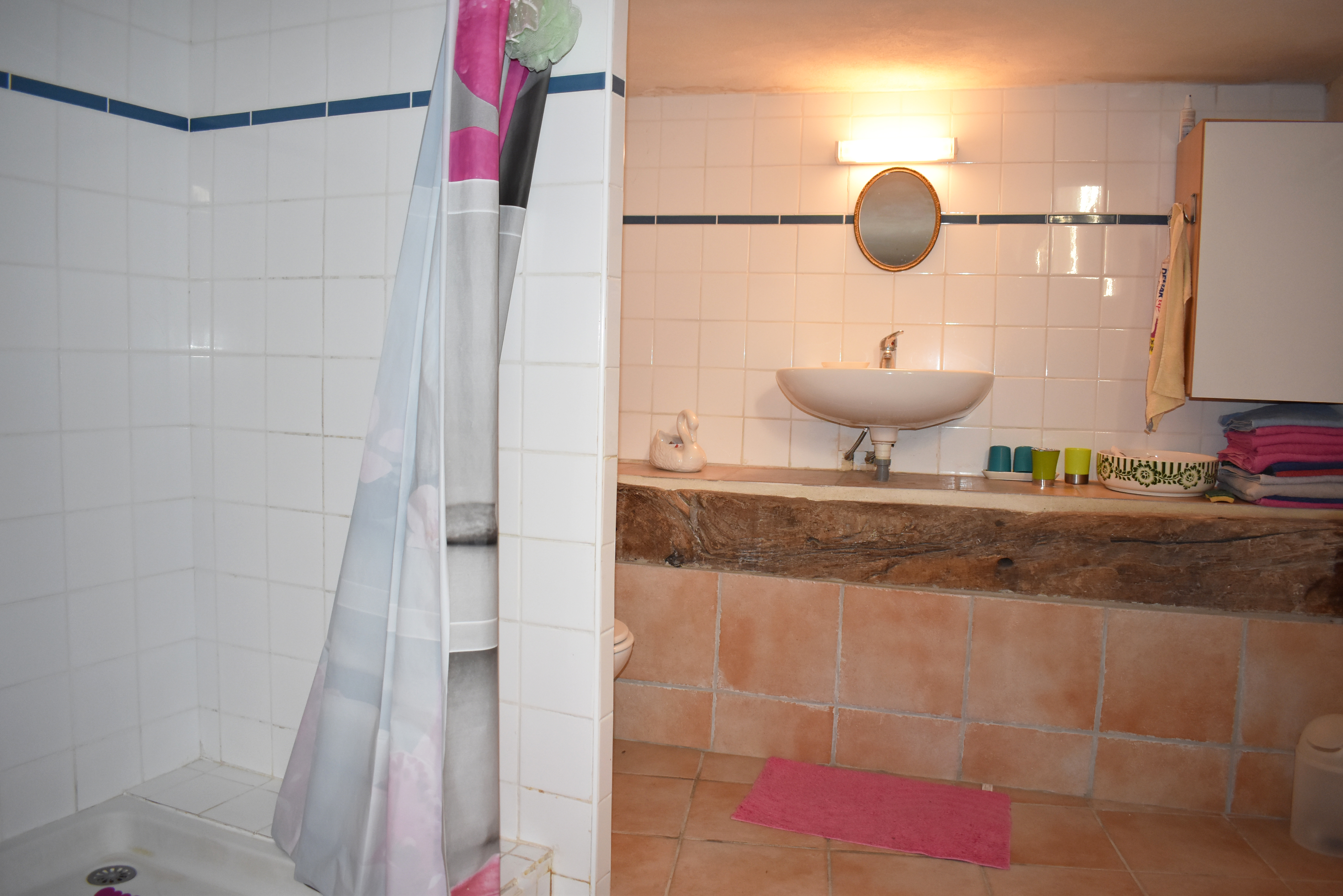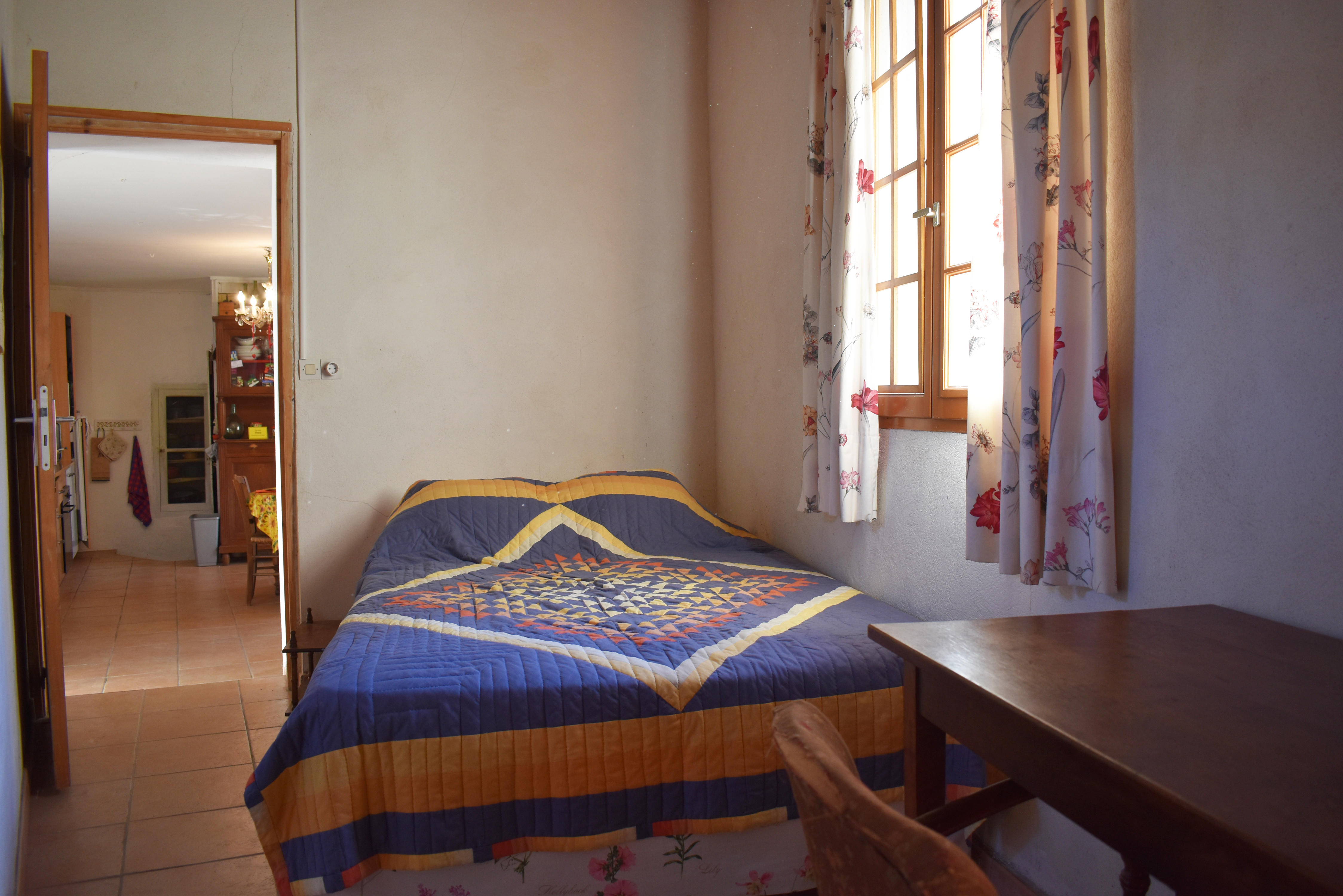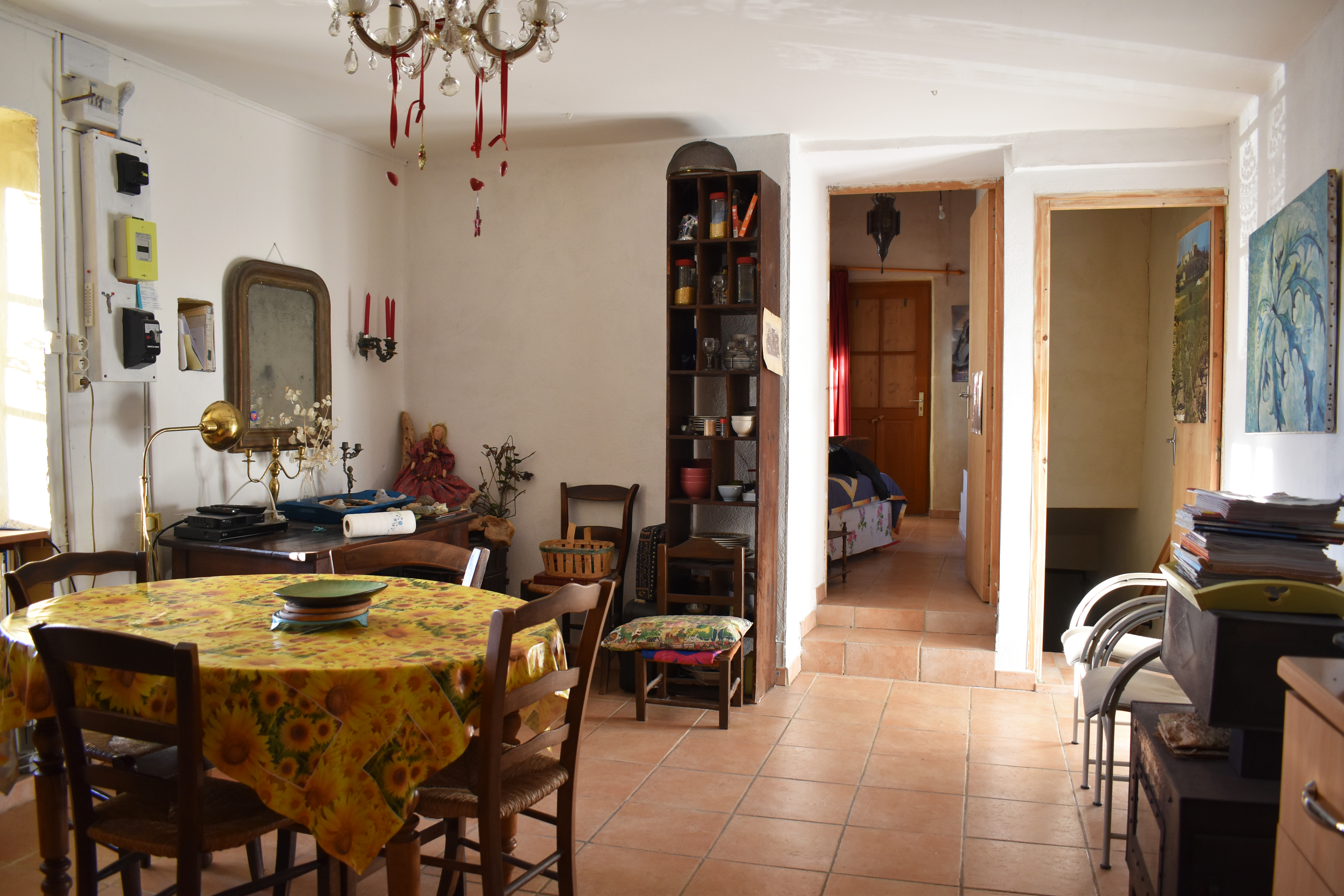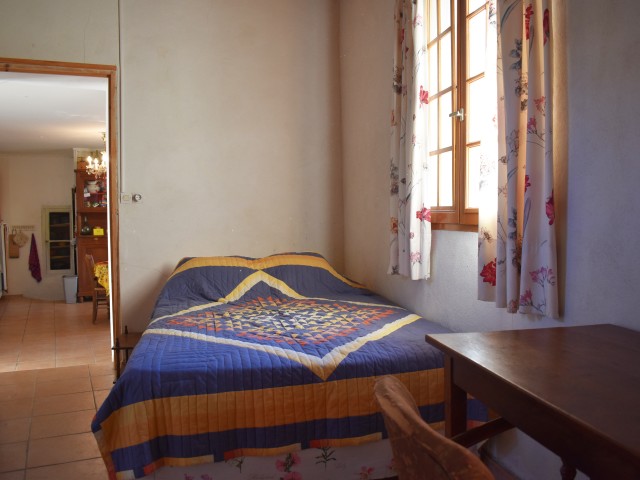 La porte d'entrée s'ouvre sur un escalier en pierre qui mène à la pièce de vie de 22,53 m2 avec un coin-cuisine aménagée et un poêle à bois. La pièce se prolonge par une chambre de 10,25 m2 avec une porte-fenêtre donnant sur un petit escalier vers une ruelle. Un escalier carrelé dans le séjour permet de rejoindre la salle d'eau en rez-de-chaussée, elle aussi pourvue d'une porte de sortie vers la place.