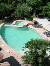 A notre droite, la demeure proprement dite a bénéficié d’une extension en pierre de taille proche de l’espace piscine avec spa à débordement de 12 m de long en diagonale, 6 m de largeur sur sa partie la plus large, et une terrasse couverte de 20,50 m2.