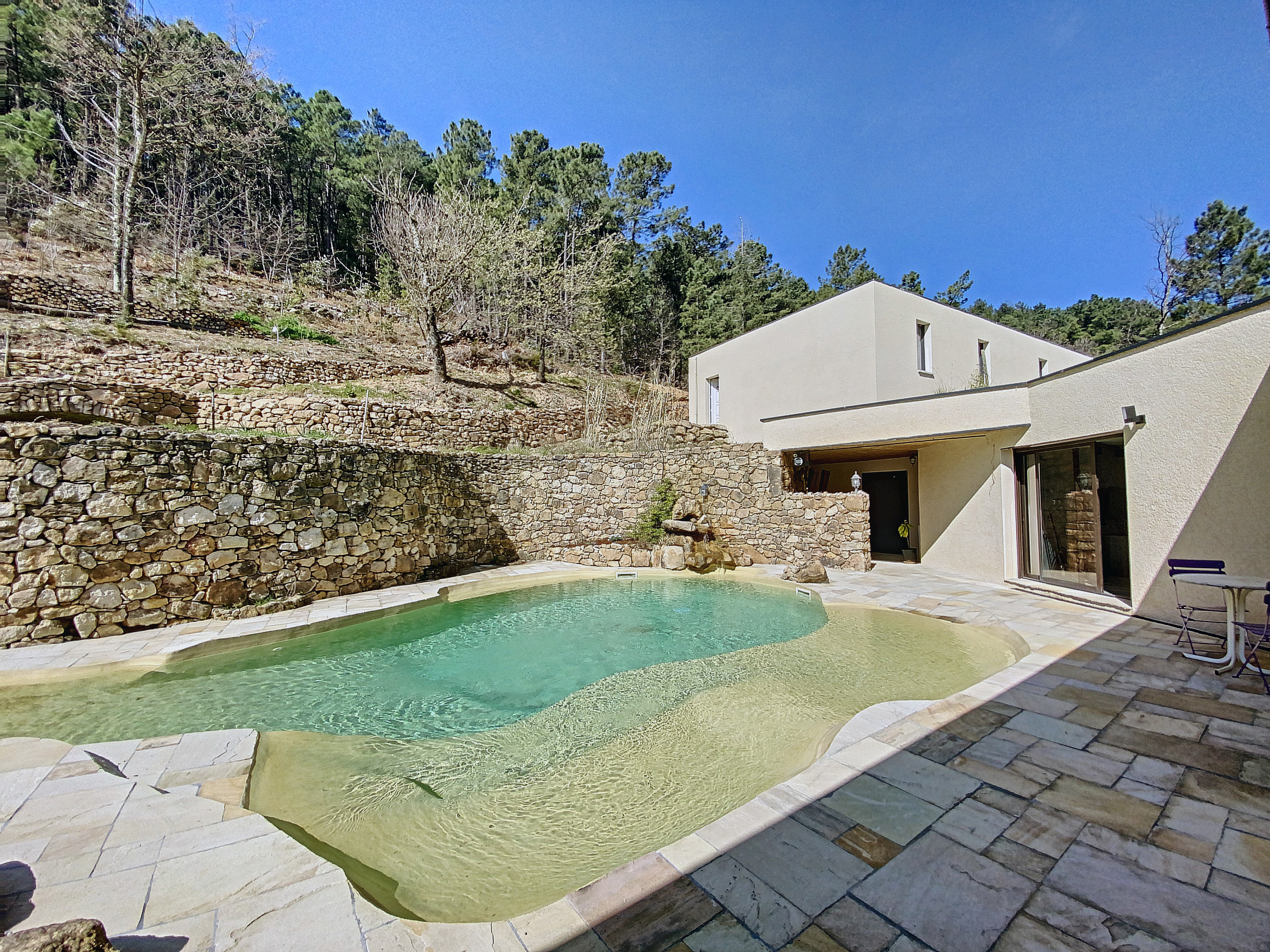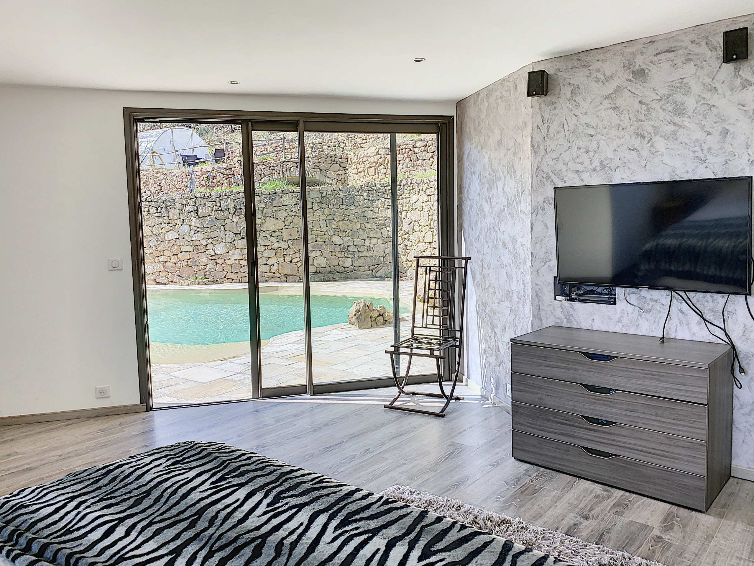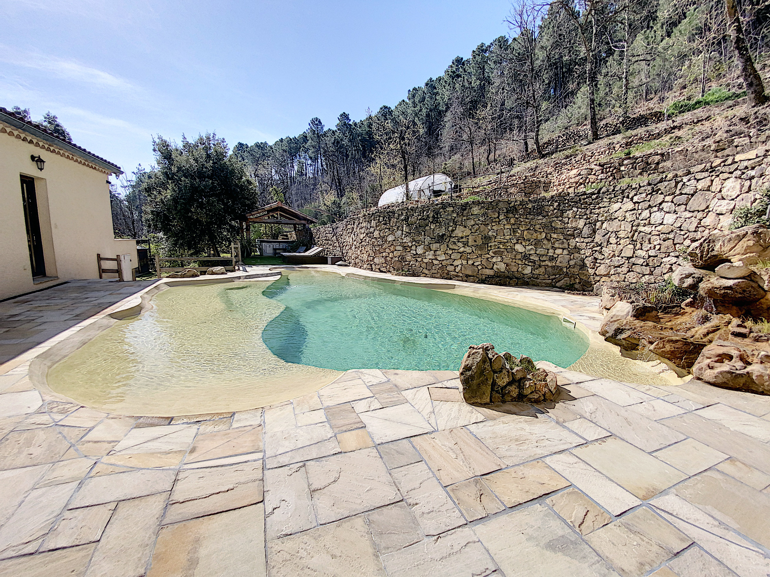 Au rez-de-jardin supérieur, une entrée de 9 m2 avec penderie distribue le séjour de 47,50 m2 avec une cuisine intégrée et un cellier de 3,5 m2, éclairé par 3 grandes baies ouvrant sur la terrasse et la vue. Au même niveau un dégagement distribue 2 chambres de 9 et 12,5 m2, une salle d'eau de 8,50 m2 avec une grande douche à l'italienne et 2 vasques de lavabo, le tout carrelé de carreaux en marbre "antique" et un W.C. indépendant. De retour dans l'entrée, nous découvrons une chambre de 17,60 m2 avec un dressing 7,5 m2 dont la grande baie vitrée encadre la vue sur la piscine. Celle-ci trouve une place intime à l’arrière de la maison. De forme libre et d’inspiration naturelle. A proximité une terrasse couverte ombrage un grand spa.