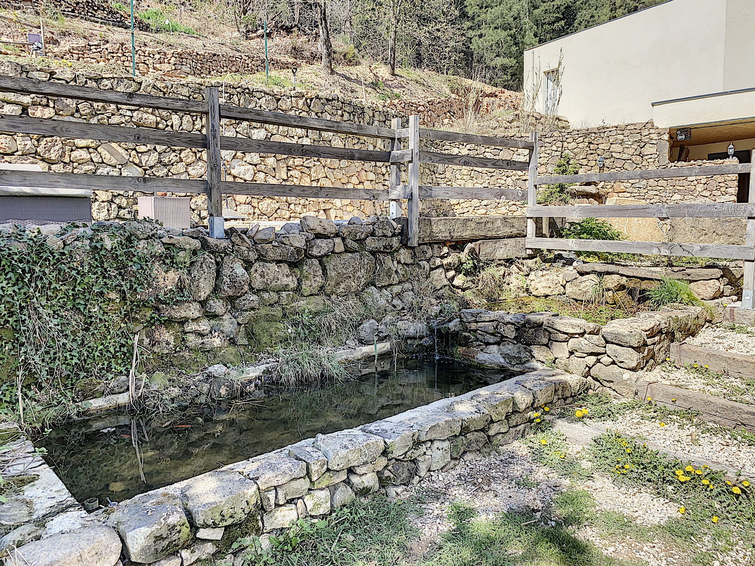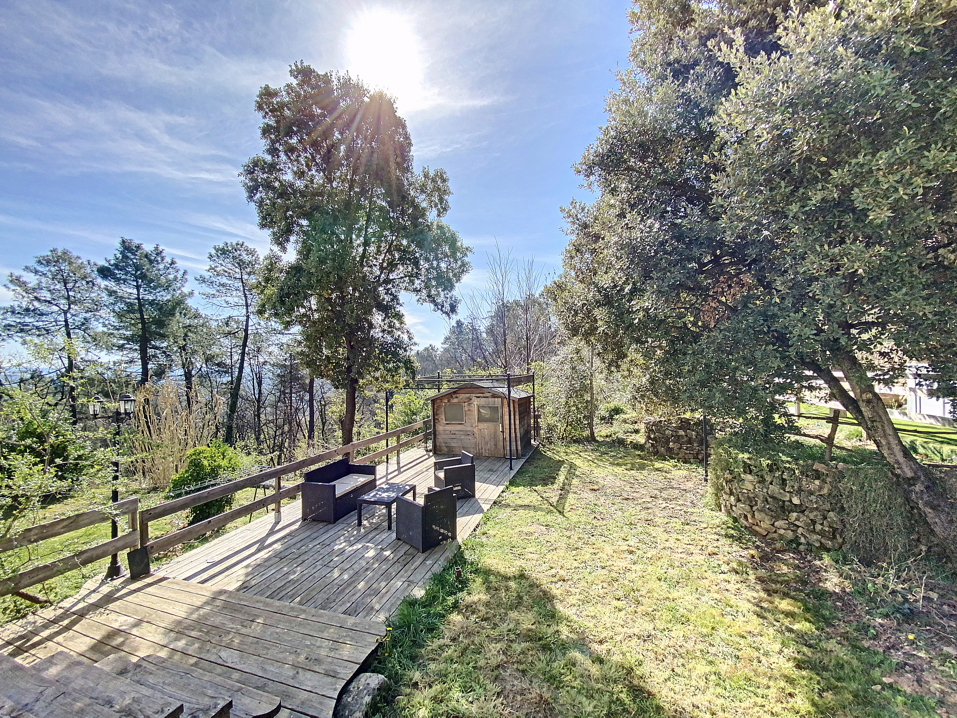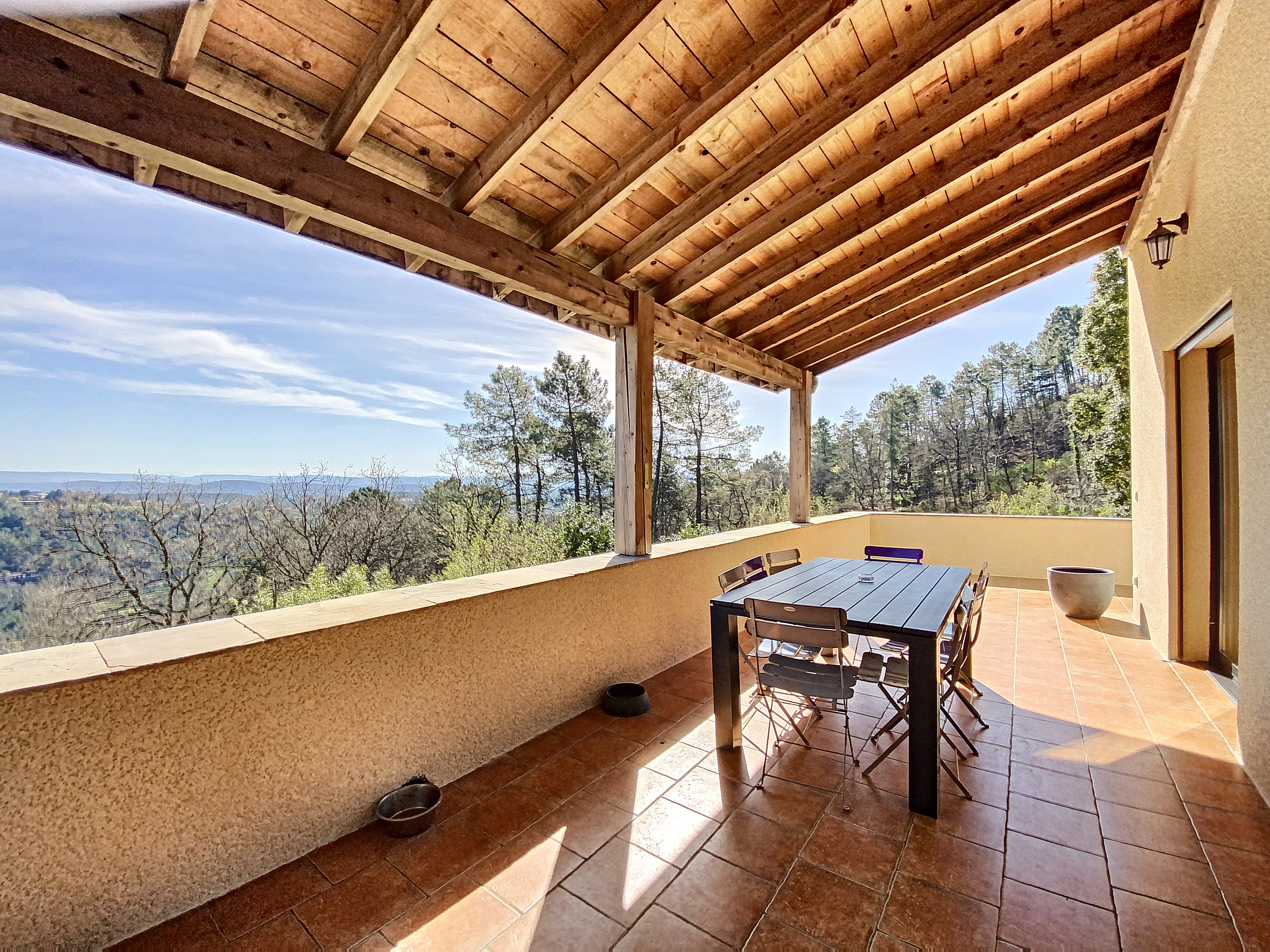 Au rez-de-jardin supérieur, une entrée de 9 m2 avec penderie distribue le séjour de 47,50 m2 avec une cuisine intégrée et un cellier de 3,5 m2, éclairé par 3 grandes baies ouvrant sur la terrasse et la vue. Au même niveau un dégagement distribue 2 chambres de 9 et 12,5 m2, une salle d'eau de 8,50 m2 avec une grande douche à l'italienne et 2 vasques de lavabo, le tout carrelé de carreaux en marbre "antique" et un W.C. indépendant. De retour dans l'entrée, nous découvrons une chambre de 17,60 m2 avec un dressing 7,5 m2 dont la grande baie vitrée encadre la vue sur la piscine. Celle-ci trouve une place intime à l’arrière de la maison. De forme libre et d’inspiration naturelle. A proximité une terrasse couverte ombrage un grand spa.