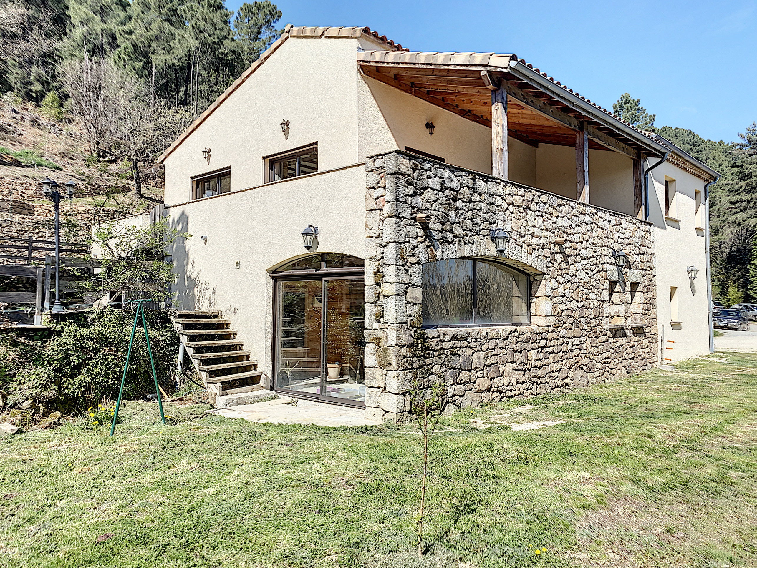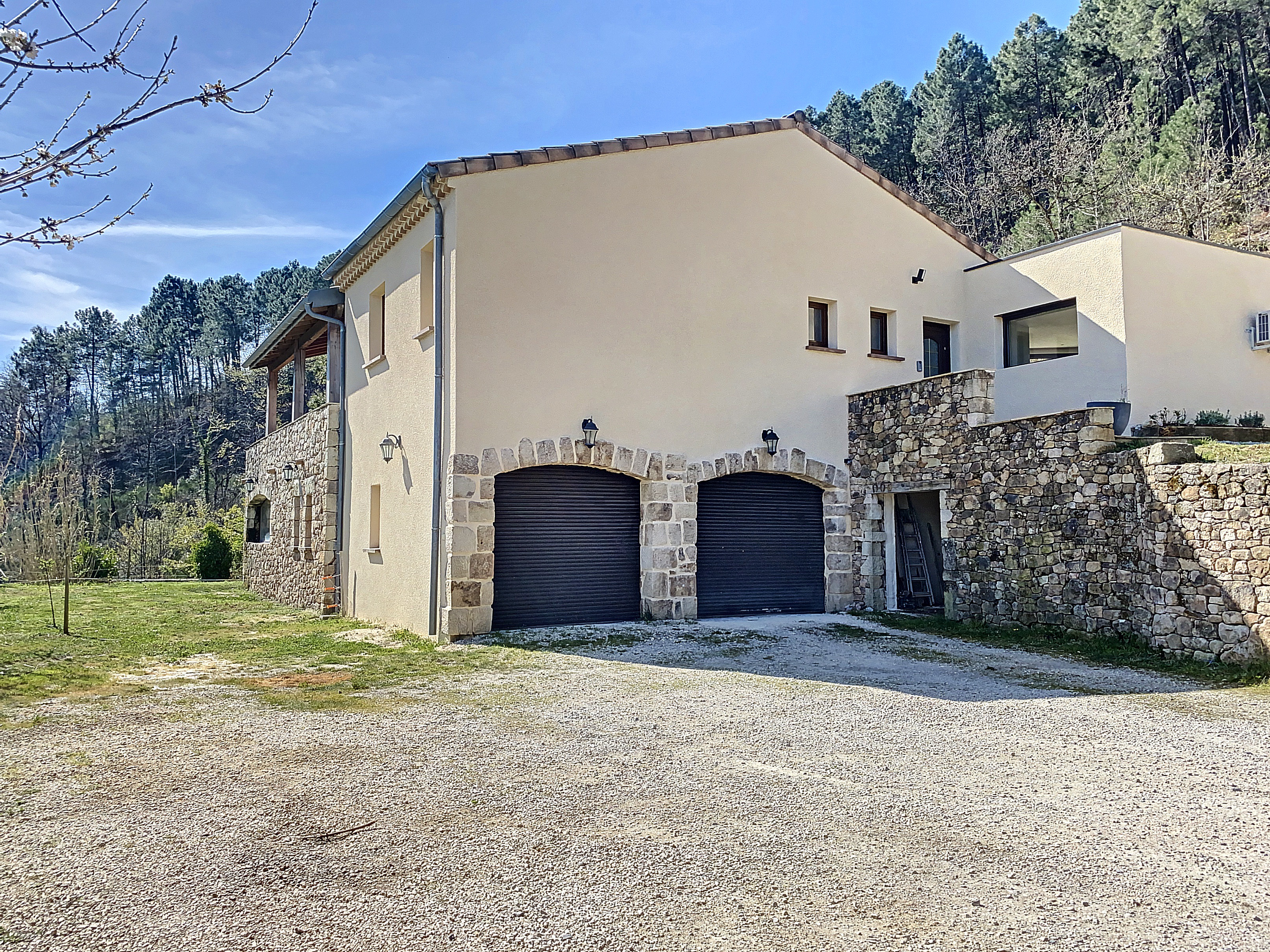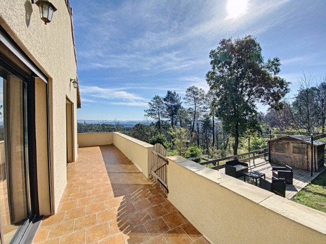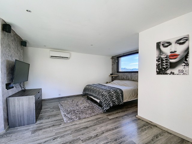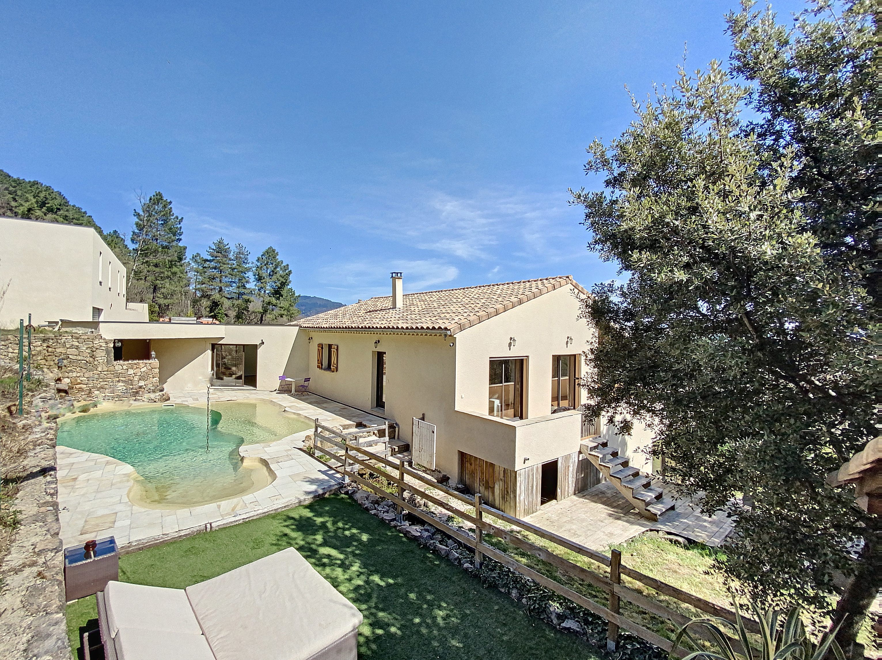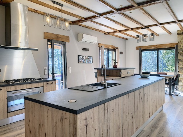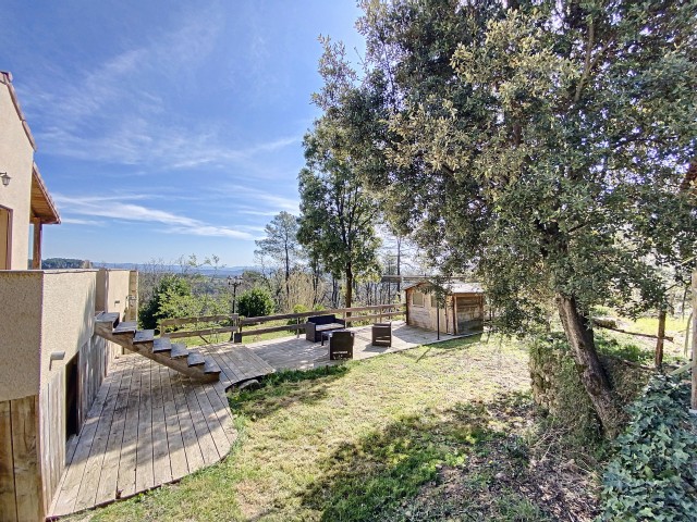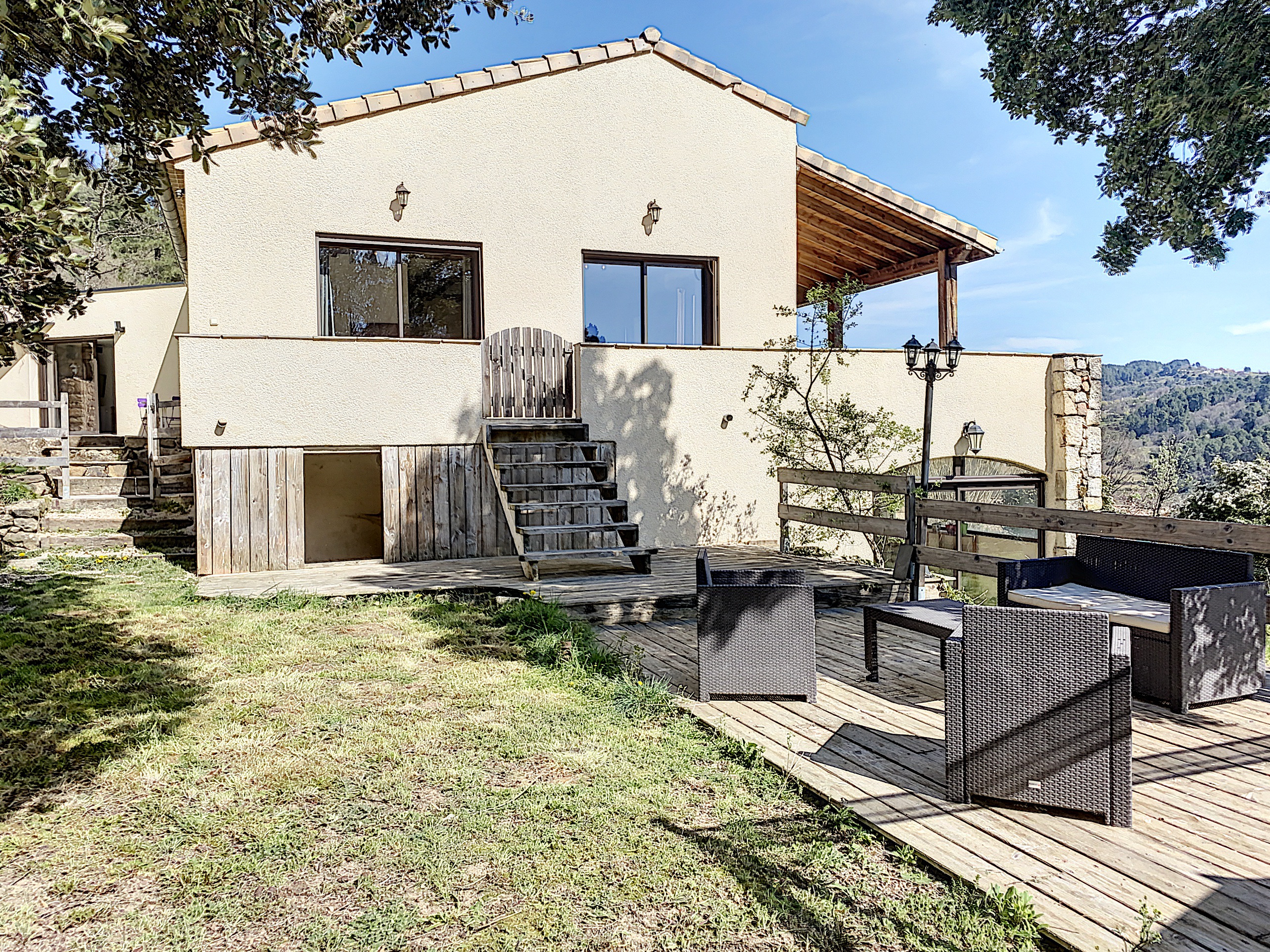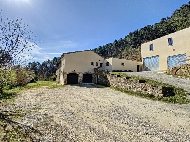 A 15 minutes au Sud d'AUBENAS, avec une splendide vue dominante jusqu'aux Alpes, une villa contemporaine de 169 m2 habitables avec un local professionnel (2 niveaux de garages et entrepôts), une piscine, un spa et 6790 m2 de terrain. La maison comprend un séjour avec cuisine intégrée, un cellier, une salle d'eau, un W.C. 3 chambres dont une avec dressing, une salle de home-cinéma de 47 m2 avec cave à vin, un bureau, un espace sous terrasse avec sauna, une buanderie avec W.C. au sous-sol, un garage et un atelier. Climatisation réversible, cheminée avec insert, fosse septique. Eau de source pour le jardin potager.