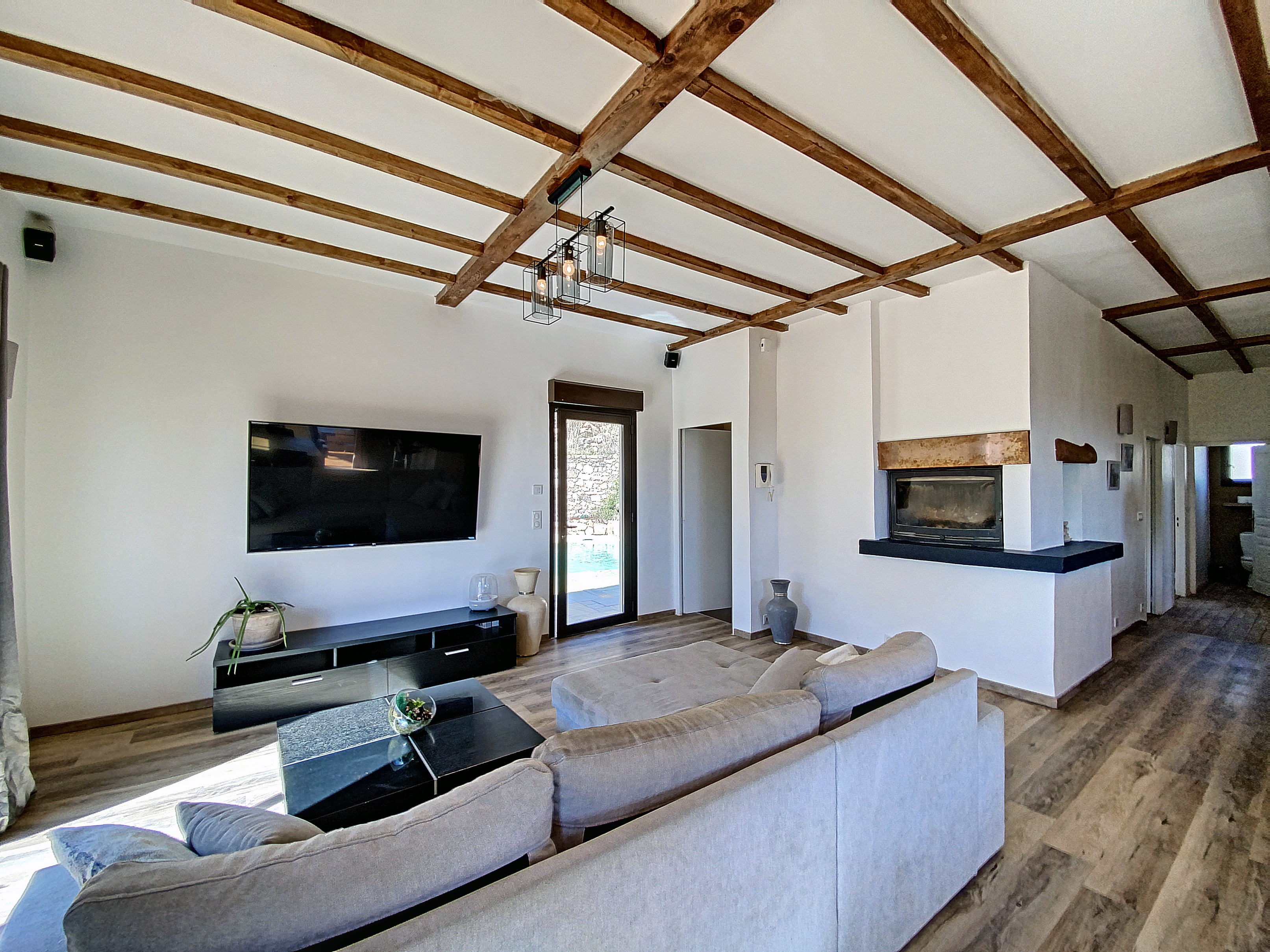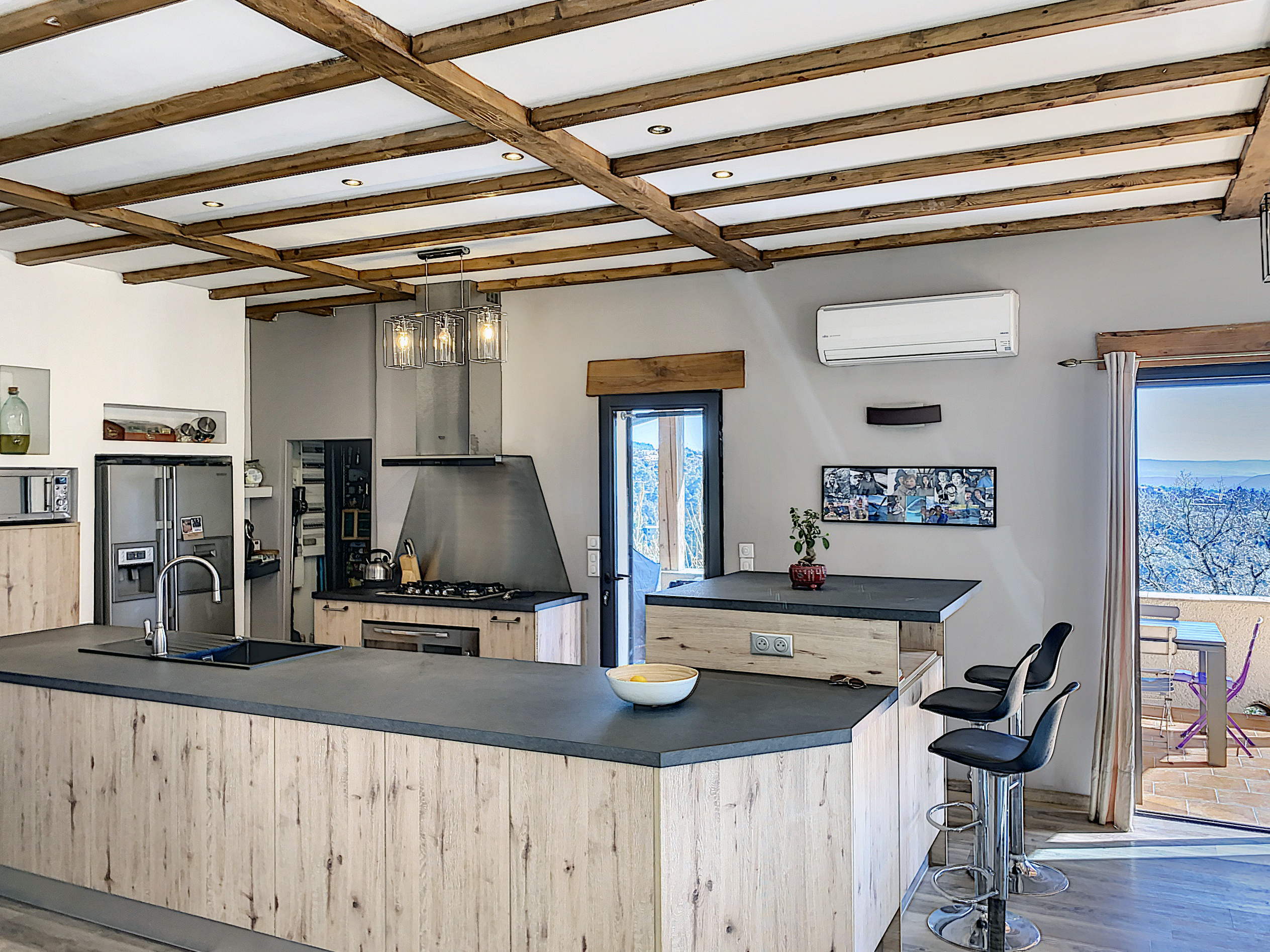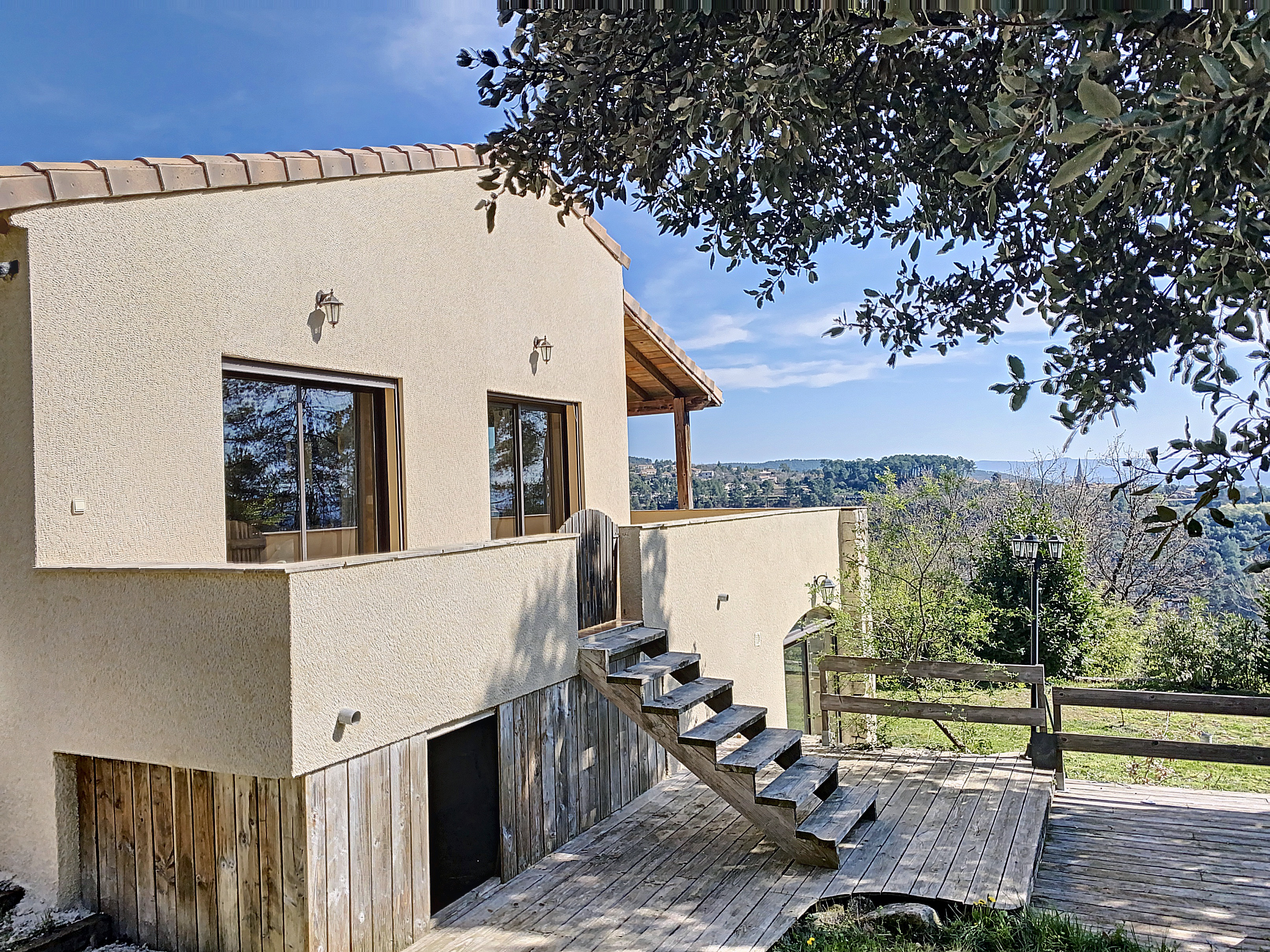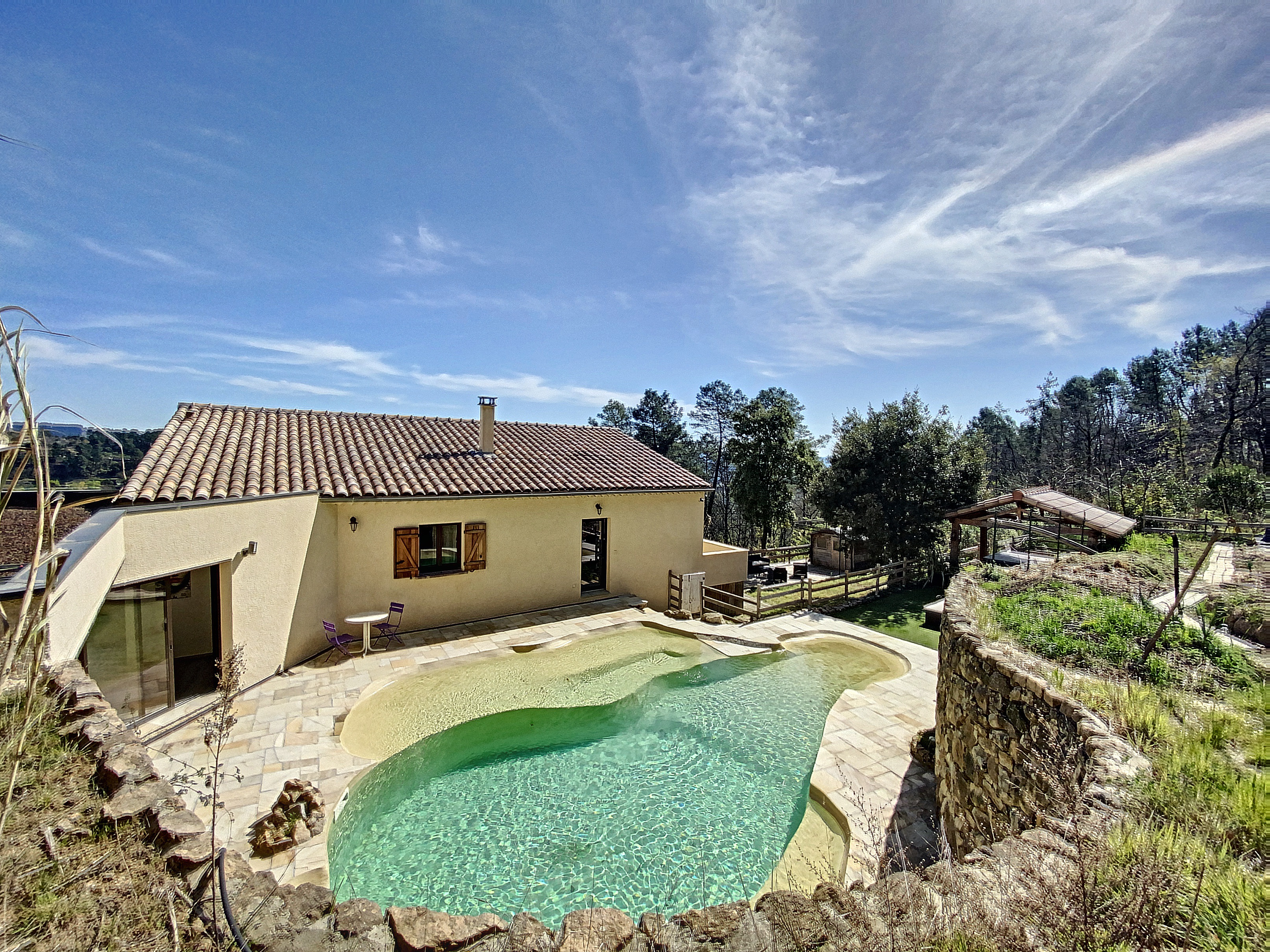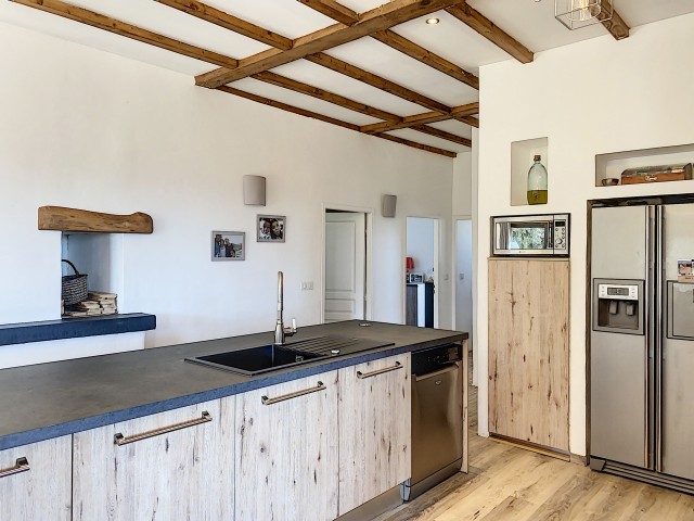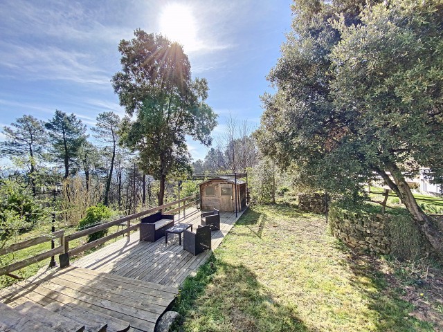 A 15 minutes au Sud d'AUBENAS, avec une splendide vue dominante jusqu'aux Alpes, une villa contemporaine de 169 m2 habitables avec un local professionnel (2 niveaux de garages et entrepôts), une piscine, un spa et 6790 m2 de terrain. La maison comprend un séjour avec cuisine intégrée, un cellier, une salle d'eau, un W.C. 3 chambres dont une avec dressing, une salle de home-cinéma de 47 m2 avec cave à vin, un bureau, un espace sous terrasse avec sauna, une buanderie avec W.C. au sous-sol, un garage et un atelier. Climatisation réversible, cheminée avec insert, fosse septique. Eau de source pour le jardin potager.