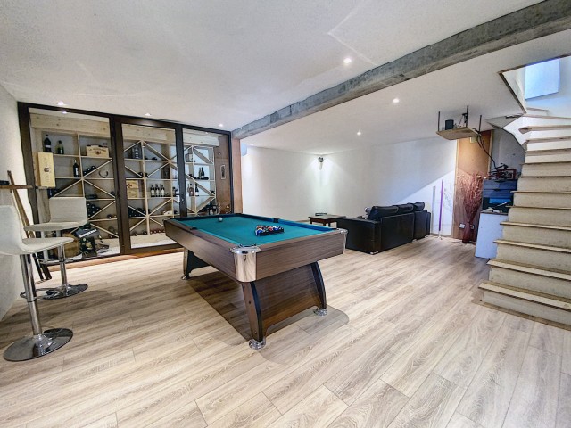 Avec une situation exceptionnelle, cette villa confortable a été construite avec des matériaux de qualité et les finitions contemporaines n'enlèvent rien à son caractère. Une belle terrasse en pierre en partie couverte embellit sa façade sur 2 côtés. Le rez-de-jardin inférieur se compose d'un garage de 43 m2 et d'un atelier de 19,4 m2, d'une buanderie avec W.C. de 7,50 m2 et d'une salle de près de 47 m2 à usage de home-cinéma avec une grande cave à vin, qui communique avec un bureau de 7,8 m2 et un espace sous terrasse de 24 m2 avec un sauna. Cette partie pourrait être aménagée en un appartement indépendant.