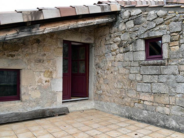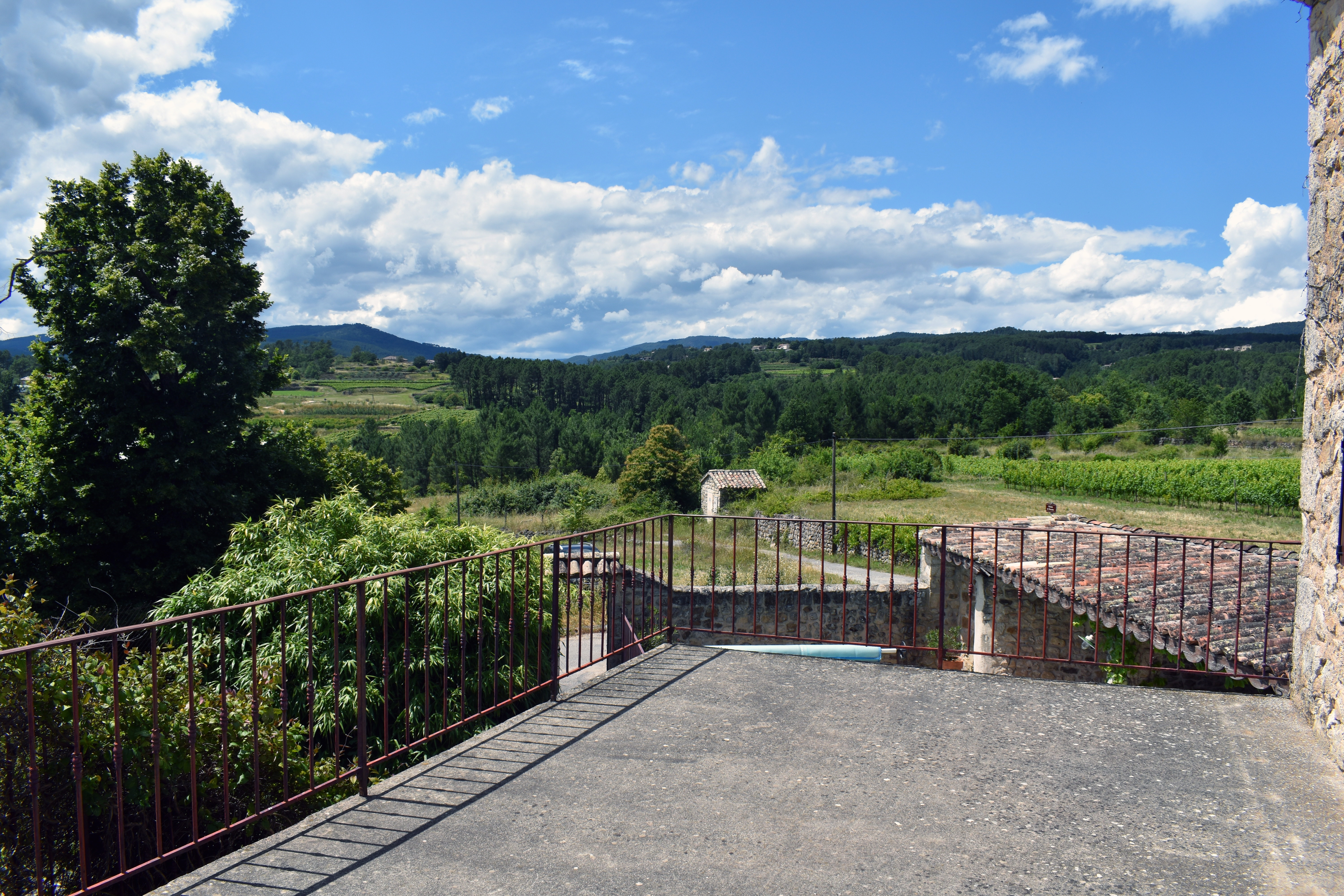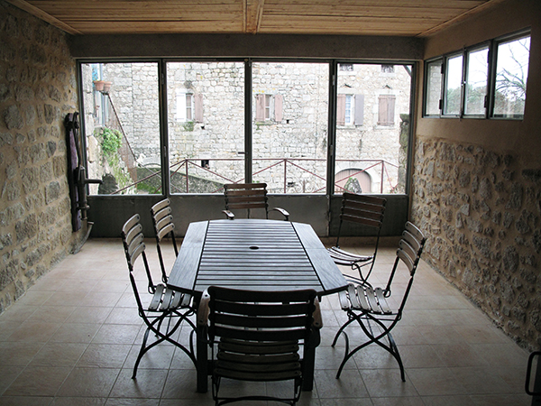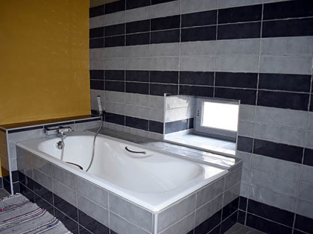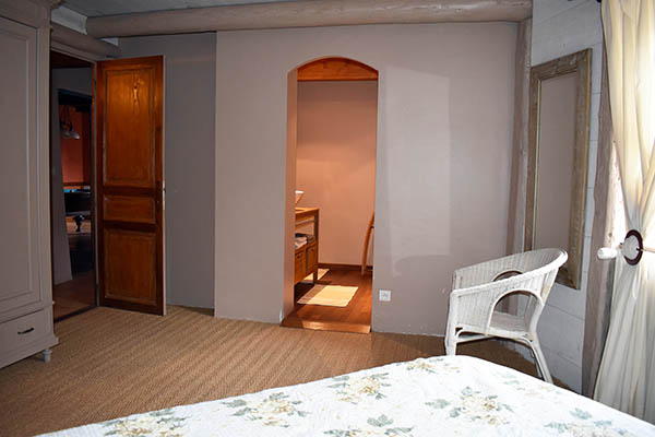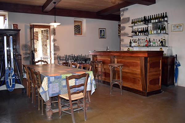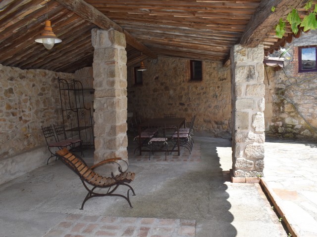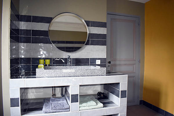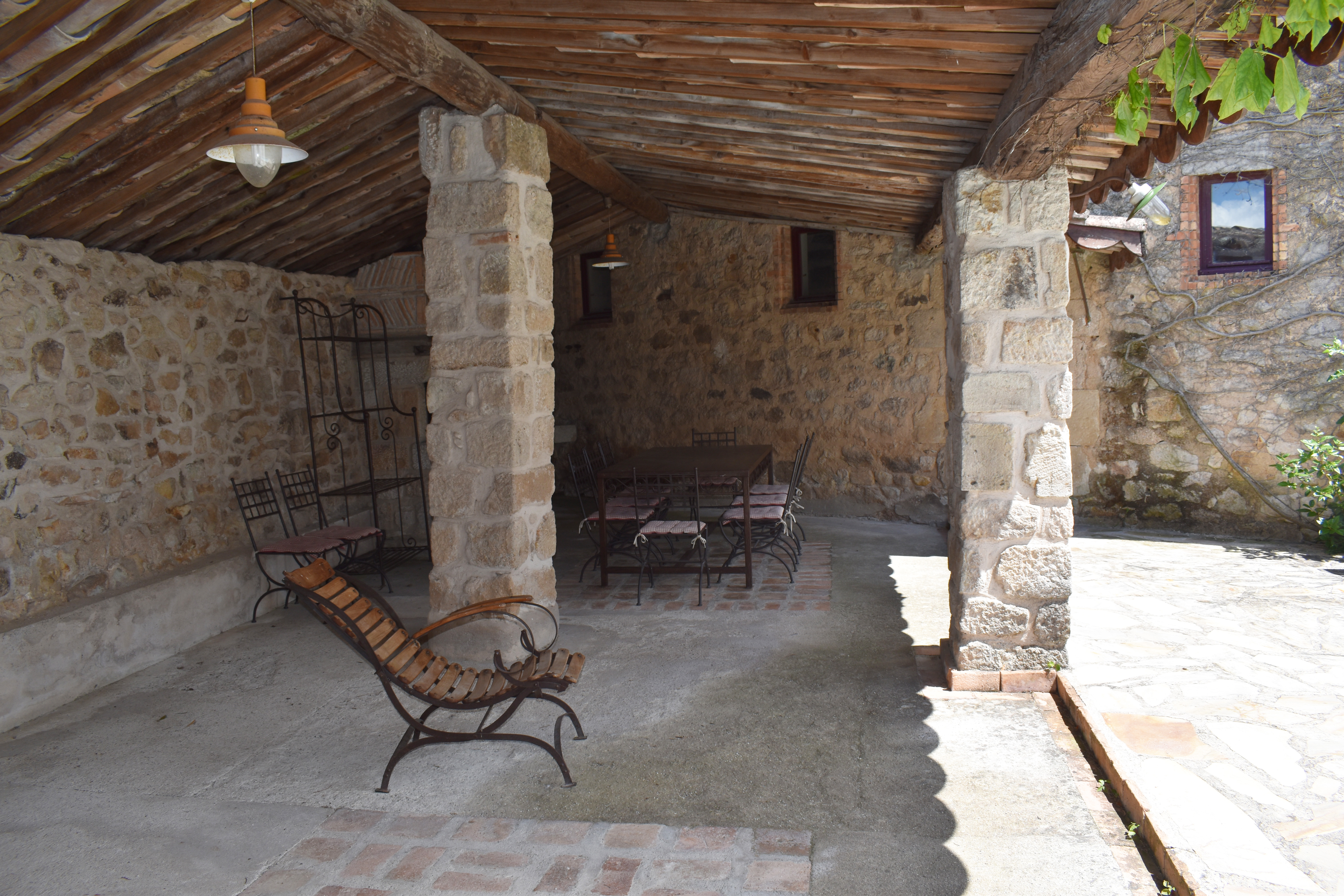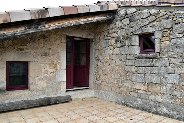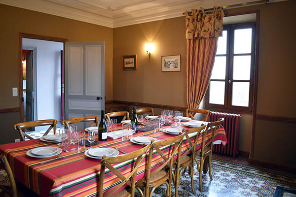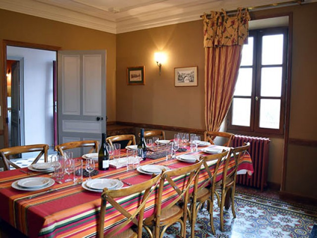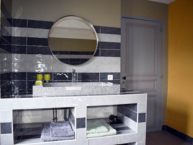 Par l'escalier en pierre nous arrivons sur une grande terrasse qui longe la façade principale. L'entrée s'ouvre sur un couloir au sol carrelé de carreaux en ciment anciens.