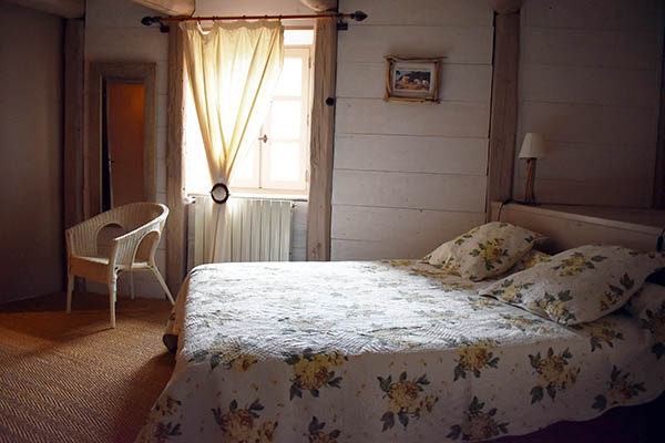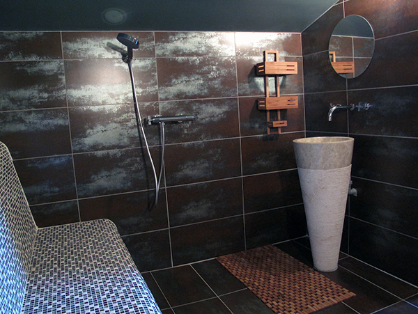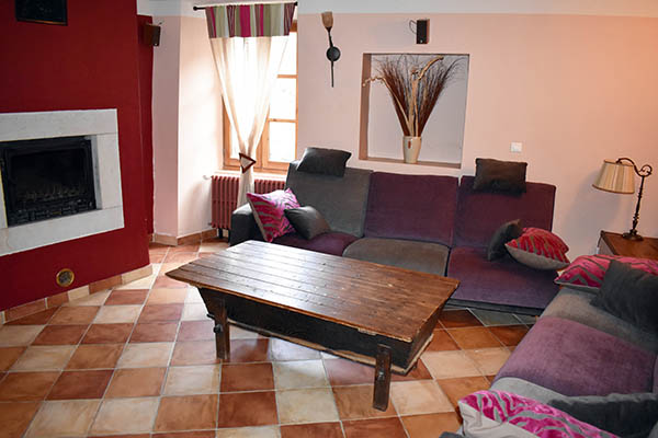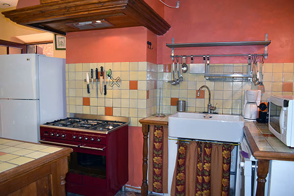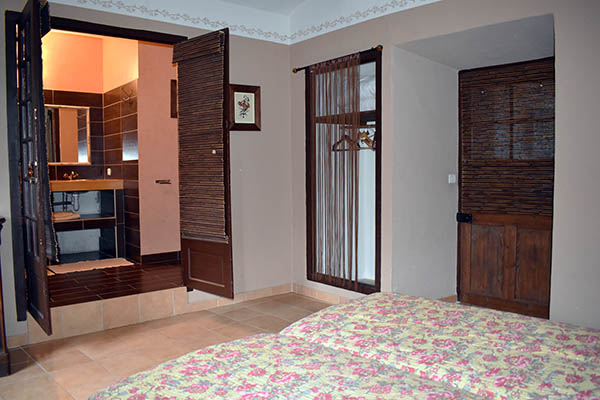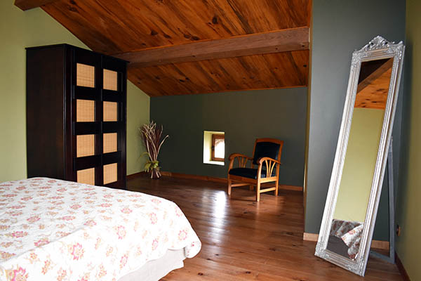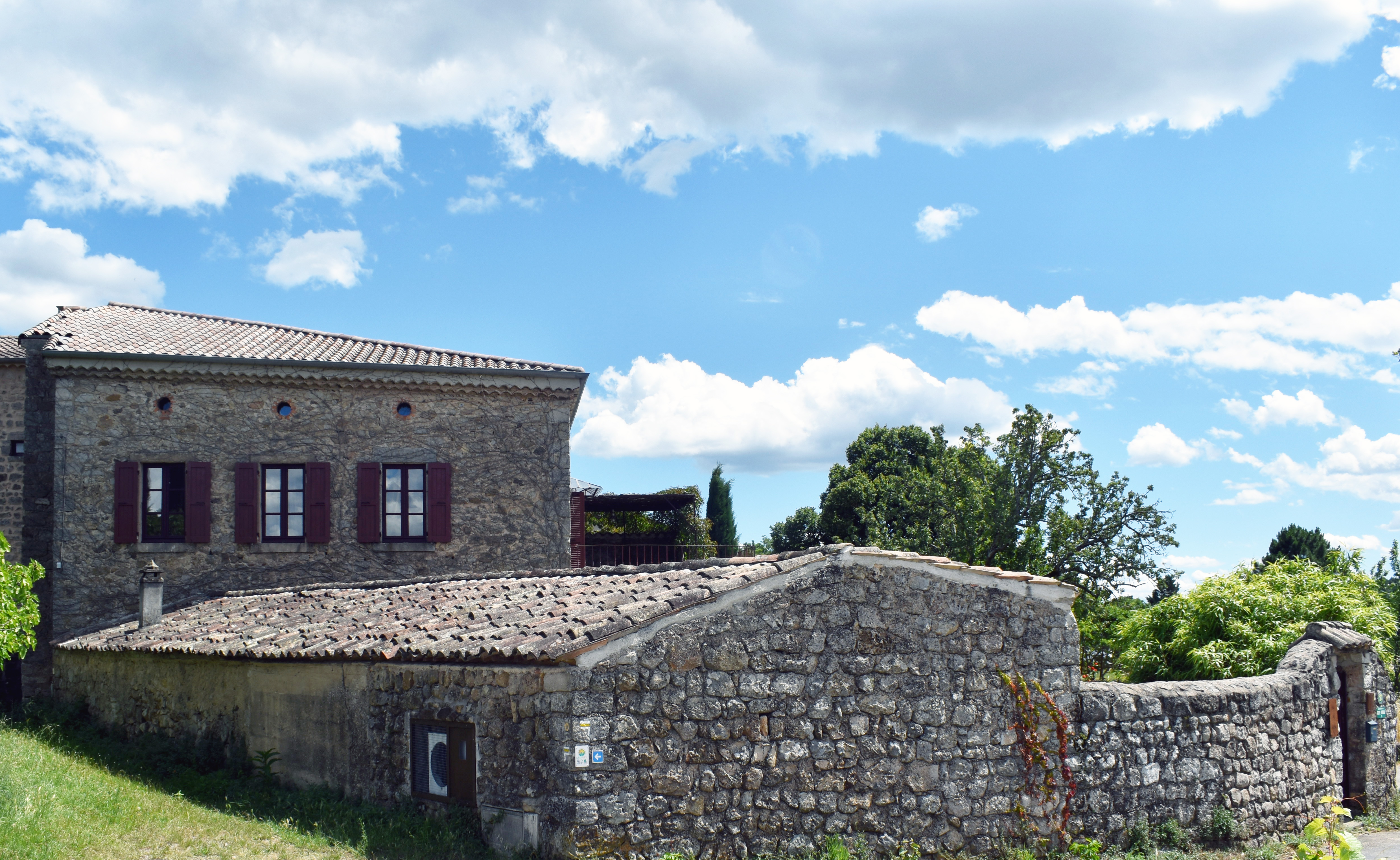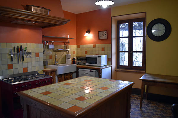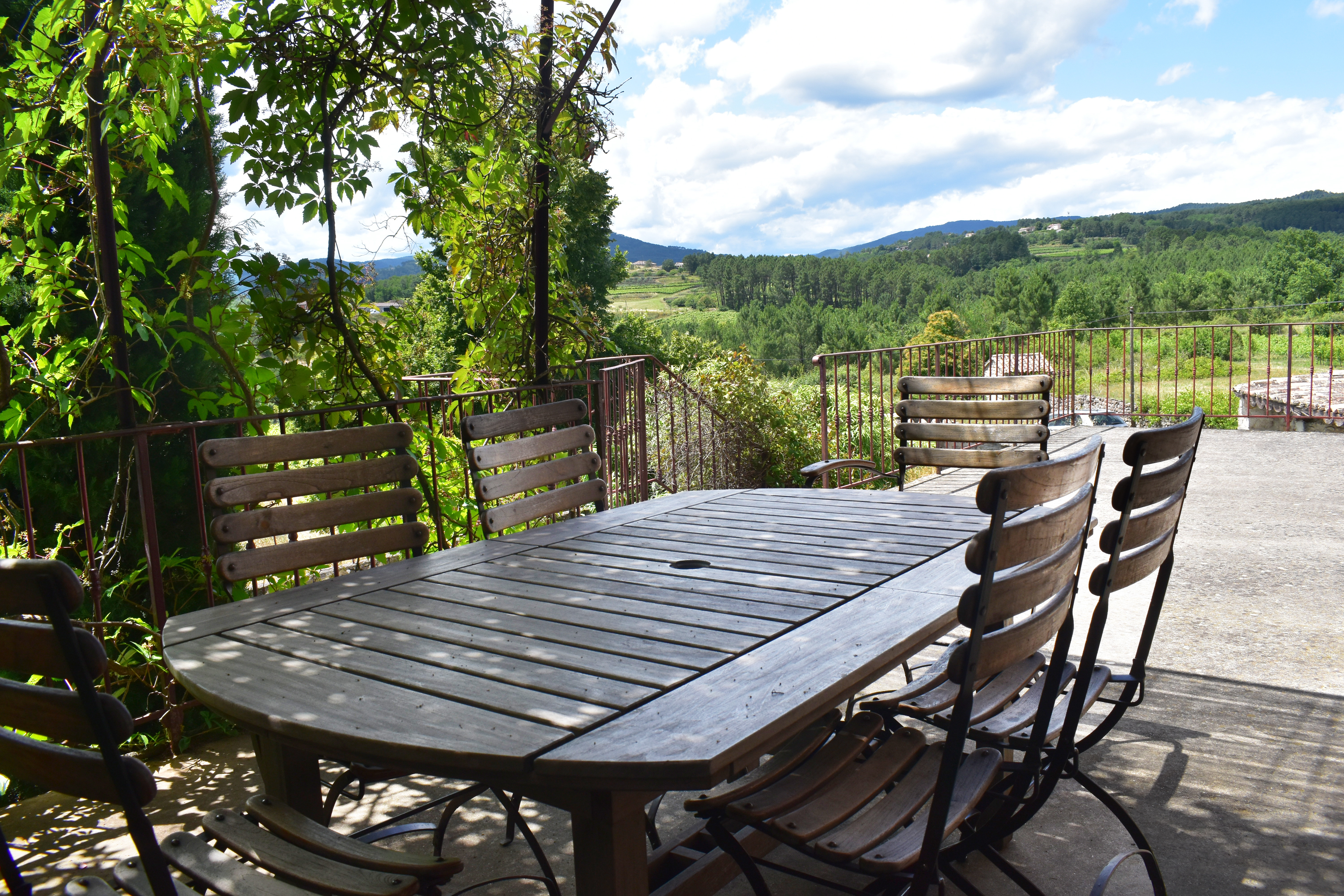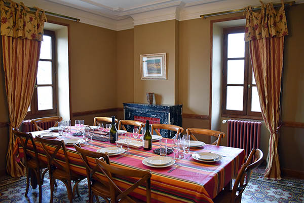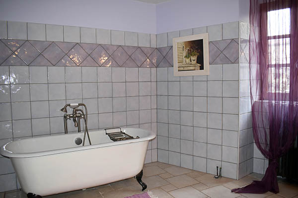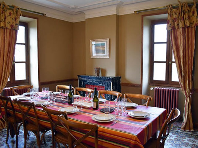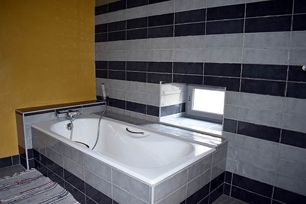 Par l'escalier en pierre nous arrivons sur une grande terrasse qui longe la façade principale. L'entrée s'ouvre sur un couloir au sol carrelé de carreaux en ciment anciens.