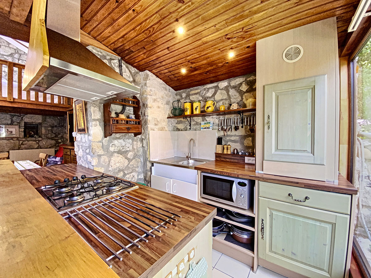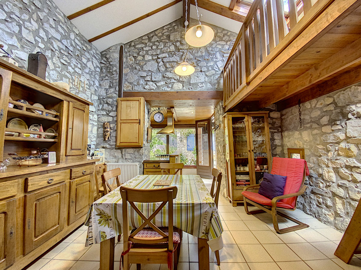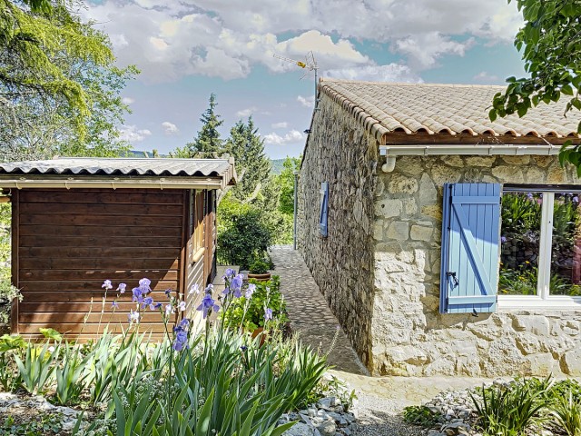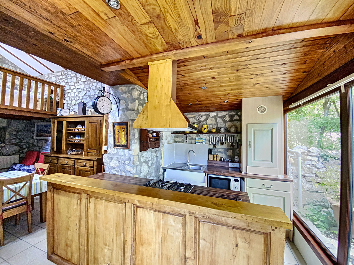 Dans un petit village au charme méridional, proche des commodités et des Gorges de l’Ardèche, la première maison a été construite dans les années 90 doublée en pierre de pays. Elle est composée d’une pièce de vie ouverte de 40.29 m2 équipée d’un poêle à pellets, d’un espace salon, salle à manger ainsi que d’une cuisine intégrée et équipée. Le sol en terre donne une touche traditionnelle à la pièce. Un dégagement distribue un bureau de 7.8 m2 et une chambre de 8.3 m2 ainsi qu’une salle d’eau de 3.02 m2 avec une douche à l’italienne et un WC séparé.