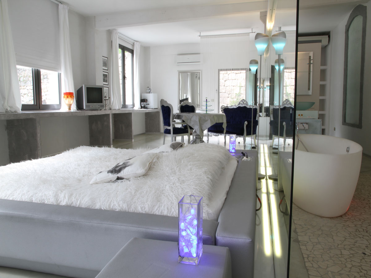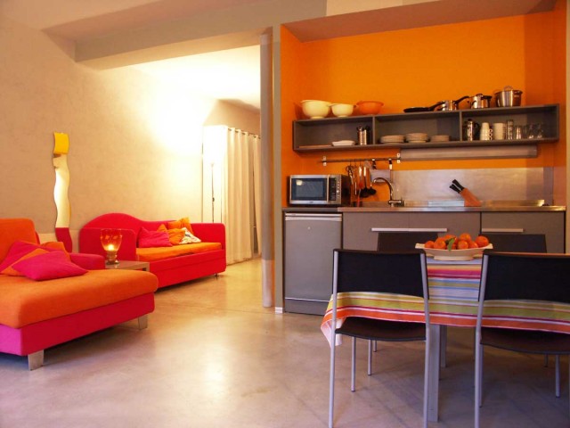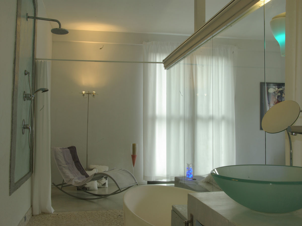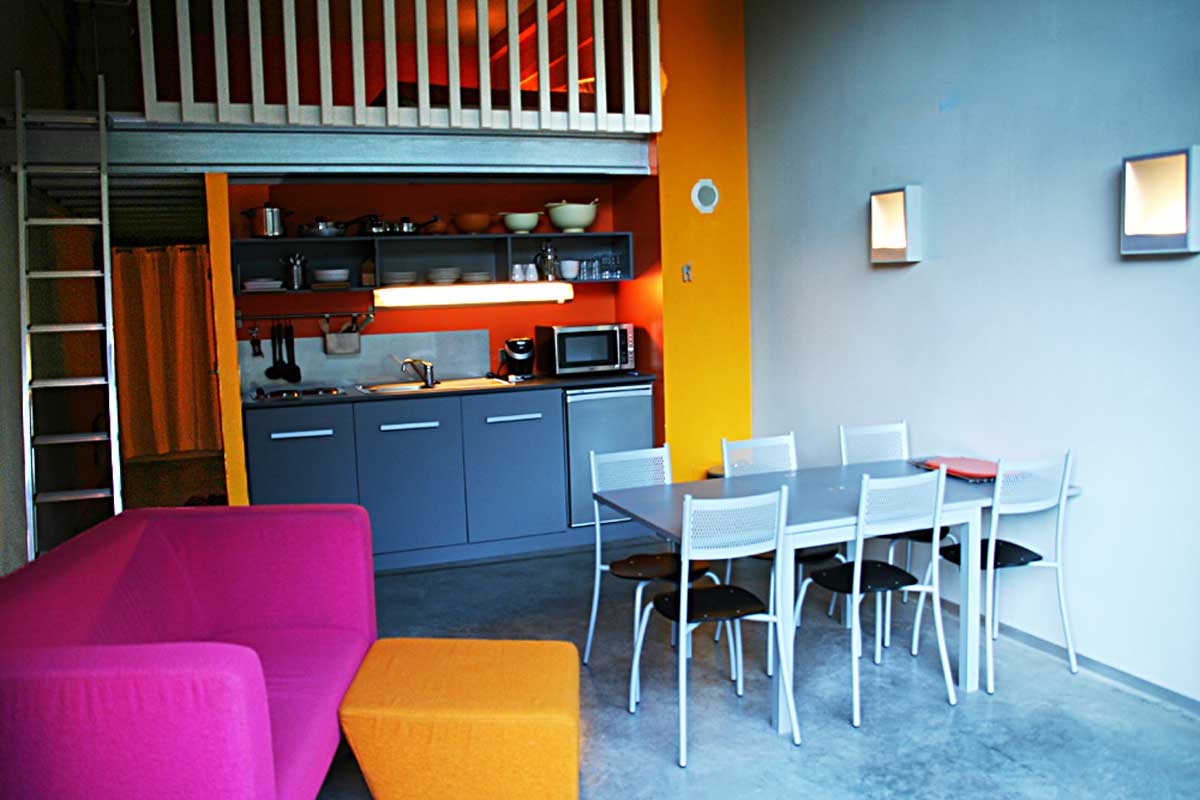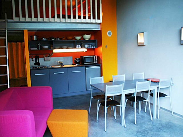 De l'accueil ,un escalier permet de rejoindre par l'extérieur 4 lofts de 45, m2, 58 m2 52,5 m2, 52,5 m2 et une suite "nuptiale" (sans cuisine) de 68 m2. 3 lofts sont pourvus d'un balcon, le quatrième avec un accès à une terrasse, tout comme la suite.
